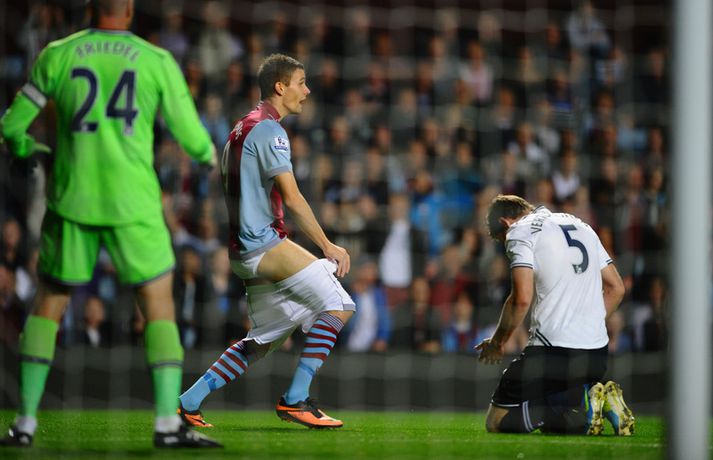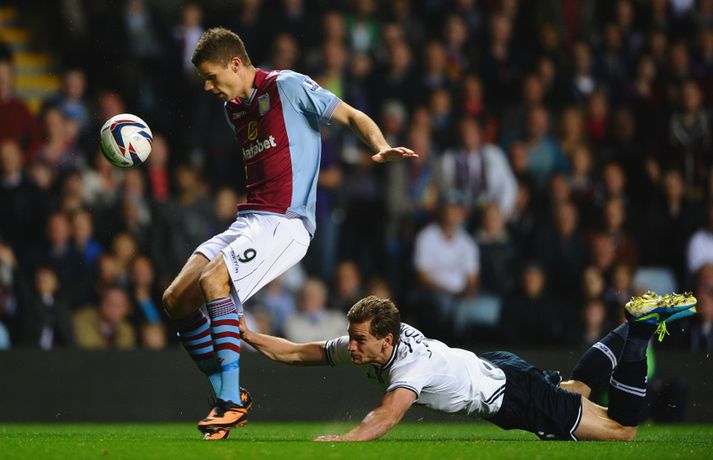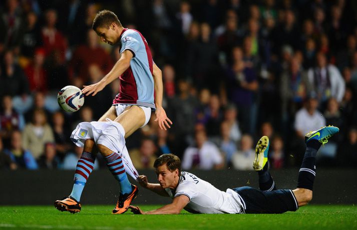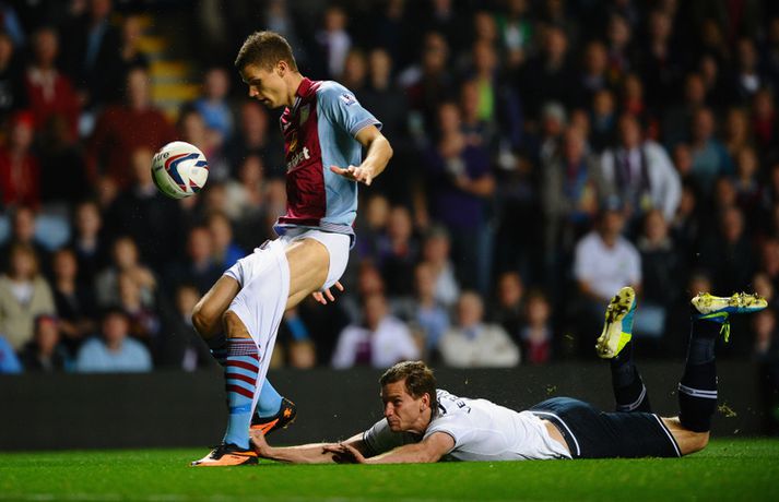 Nicklas Helenius, danskur framherji enska liðsins Aston Villa, skildi ekkert í dómaranum í kvöld þegar hann var að spila með liði sínu á móti Tottenham í enska deildabikarnum. Helenius var þá sloppinn í gegn en um leið og hann skaut að marki þá girti Tottenham-maðurinn Jan Vertonghen hreinlega niður um hann. Skot Helenius fór skiljanlega langt yfir enda þola fáir þá truflun að vera klæddir úr buxunum fyrir framan mörg þúsund manns. Það er hægt að sjá þetta furðulega atvik í spilaranum hér fyrir ofan og dæmi nú hver og einn um það hvort að svona varnaleikur sé löglegur.