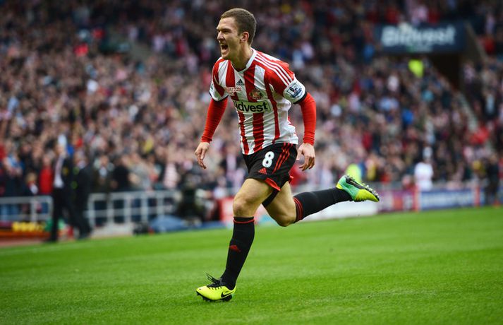 Januzaj bjargaði United | Sjáðu mörkin hér Kolbeinn Tumi Daðason skrifar 5. október 2013 00:01 Belgíska ungstirnið Adnan Januzaj kom Manchester United til bjargar í heimsókn til Sunderland á Ljósvang í ensku úrvalsdeildinni í knattspyrnu í dag. Nemanja Vidic varð á stór mistök annan leikinn í röð snemma leiks. Slæm hreinsun hans féll fyrir fætur Craig Gardner sem skoraði með hörkuskoti neðst í markhornið. Nani fékk besta færi United í fyrri hálfleiknum en skot á lofti innan teigs fór rétt framhjá. Í síðari hálfleik bættu gestirnir leik sinn án þess þó að sína meistaratakta. Þeim til happs var hinn átján ára Januzaj í stuði. Hann jafnaði metin með föstus skoti með hægri fæti á 55. mínútu eftir fyrirgjöf Patrice Evra. Belginn leyfði sér varla að fagna markinu svo ákveðinn var hann að bæta við mörkum. Sex mínútum síðar gerði hann það. Sunderland skallaði fyrirgjöf út í teiginn þar sem Januzaj hamraði boltann með vinstri fæti neðst í fjærhornið. Hvorugt liðanna fékk dauðafæri í kjölfarið og Englandsmeistararnir náðu í dýrmæt stig í smiðju Kevin Ball sem stýrir Sunderland tímabundið. United hefur nú 10 stig líkt og Aston Villa og Newcastle um miðja deild. Sunderland er áfram á botninum með eitt stig.Allt það helsta úr leiknum má sjá hér. Enski boltinn Mest lesið Van de Ven bað Isak afsökunar: „Vildi ekki meiða hann“ Enski boltinn Hvers vegna heillast stórliðin svo af Semenyo? Enski boltinn Síðasti dansinn hjá Kelce? Sport Var frústreraður vegna landsliðsins Fótbolti Stefndi á ÓL en fannst látinn á hótelherbergi Sport Heyrði hvorki frá Blikum né Víkingum Íslenski boltinn Ruglaðar lokamínútur í Afríkukeppninni Fótbolti Þessi tíu eru tilnefnd sem Íþróttamaður ársins 2025: 23 ára aldursmunur Sport Viðurkenna að VAR hafi bilað Fótbolti Jólagjöf í Keflavík: Remy Martin snýr aftur Körfubolti Fleiri fréttir Van de Ven bað Isak afsökunar: „Vildi ekki meiða hann“ Hvers vegna heillast stórliðin svo af Semenyo? Stewart, Snoop og Modric í eina sæng Vill ekki segja hversu lengi Bruno er frá Spyr hvort Guardiola stígi á vigtina Arsenal í undanúrslit eftir vító Man. Utd reyndi stíft en Semenyo kaus City „Tölfræðilega séð eiga þeir ekkert að vera í þessari stöðu“ Chelsea setur sig í samband við Semenyo Jiménez jafnaði bestu vítaskyttu sögunnar Slot mun sakna Isak í tvo mánuði eftir „glórulausa tæklingu“ Sjáðu „auma“ vítið sem skilaði Fulham sigri Fulham skildi Forest eftir við fallsvæðið Áfallið staðreynd og Isak búinn í aðgerð Fagnaði titli Liverpool sem óður maður um alla borg „Allir virðast elska hann“ „Þetta mun ekki buga okkur“ Guardiola mun vigta leikmenn Man City eftir jólin „Ef þið væruð Antoine Semenyo, hvert mynduð þið fara?“ Sjáðu mörkin: Rogers sá um Manchester United Óttast að Isak hafi fótbrotnað Tvenna frá Rogers tryggði Villa sigur gegn Manchester United Fimmta sinn sem Arsenal er á toppnum um jólin: Unnu ekki titilinn í fyrstu fjögur skiptin „Viljum við að okkar verði minnst fyrir að vera skræfur?“ „Ef dómarinn hefði sinnt sínu starfi almennilega hefði Romero ekki fengið spjald“ Haaland gaf barnabarni Hareide gjöf Sjáðu mörkin úr enska: Sviptingar, sænskt þema og svakalegar tæklingar Calvert-Lewin hættir ekki að skora Gyökeres skaut Arsenal aftur á toppinn Slot fámáll um stöðuna á Isak Sjá meira