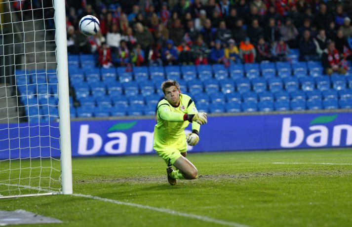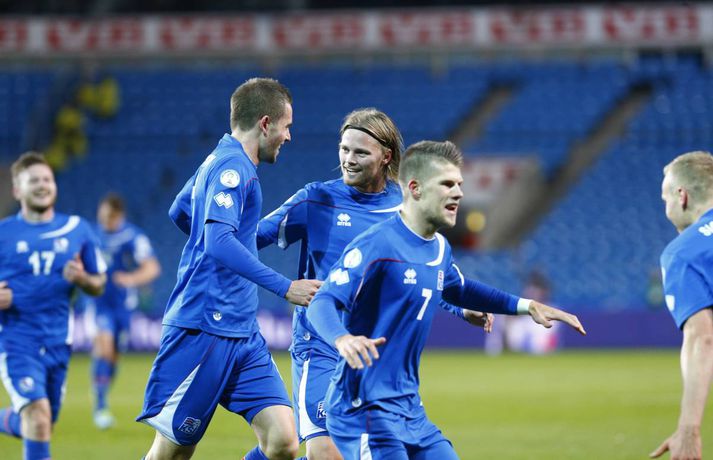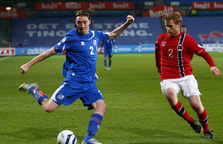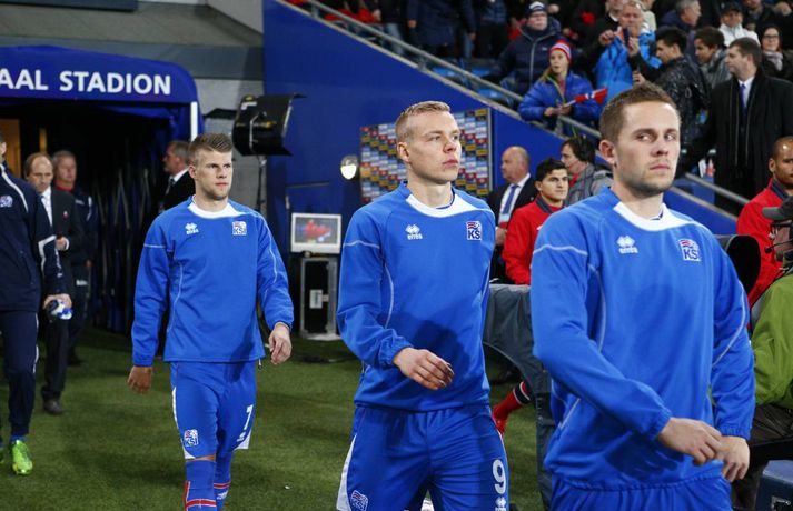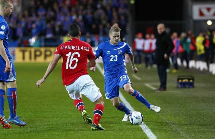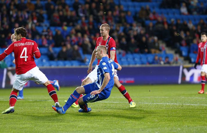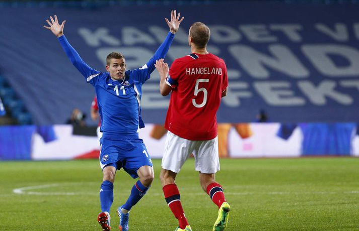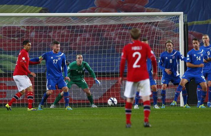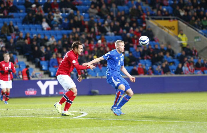 Umfjöllun og myndir: Noregur - Ísland 1-1 | Ísland er komið í umspilið 15. október 2013 17:00 Strákarnir fagna gegn Noregi í Ósló í kvöld. mynd/vilhelm Ísland er komið í umspil um sæti á HM í fótbolta í Brasilíu 2014 eftir 1-1 jafntefli við Norðmenn á Ullevaal-leikvanginum í Ósló í kvöld en þá fram lokaumferðin í riðlinum. Ísland tryggði sér með þessu annað sæti E-riðlilsins þar sem að Svisslendingar unnu 1-0 sigur á Slóveníu á sama tíma. Íslensku strákarnir fögnuðu gríðarlega í leikslok enda er þetta án vafa stærsta stundin í sögu íslenska karlalandsliðsins. Íslenska liðið endar með 17 stig eða tveimur stigum meira en Slóvenar. Kolbeinn Sigþórsson kom Íslandi yfir á 12. mínútu leiksins en Norðmenn náðu að jafna átján mínútum síðar. Íslenska liðið fékk þrjú frábær færi til að tryggja sér sigurinn í seinni hálfleik en annað markið leit ekki dagsins ljós. Norðmenn voru reyndar mikið með boltann í seinni hálfleiknum en náðu sem betur fer ekki að skapa sér neina alvöru færi og liðin sættust á jafntefli. Það reyndust vera frábær úrslit fyrir Ísland. Íslenska liðið lenti í því að verja jafnteflið stærsta hluta seinni hálfleiks og skynsamur leikur lengstum átti sinn þátt í því að Norðmenn náðu ekki að skapa sér mikið. Spennan hélt allt til leiksloka þar sem að sigurmarkið datt ekki þrátt fyrir góð færi. Norðmenn byrjuðu leikinn miklu betur og unnu boltann margt í hápressunni á upphafsmínútum leiksins. Fyrir vikið sköpuðu þeir sér nokkur hálffæri en það var hinsvegar íslenska liðið sem náði fyrstu alvöru sókninni og skoraði úr því fyrsta mark leiksins á 12. mínútu. Það voru gulldrengirnir Gylfi Þór Sigurðsson og Kolbeinn Sigþórsson sem áttu þetta mark skuldlaust. Kolbeinn átti gott hlaup og fann pláss á milli norsku miðvarðanna. Gylfi fann hann eftir frábæra sókn og Kolbeinn skoraði í fimmta landsleiknum í röð. Kolbeinn tók boltann með sér, snéri sér við og afgreiddi hann síðan fagmannlega í markið. Eftir markið tóku íslensku strákarnir öll völd og frábærir íslenskir áhorfendur voru farnir að bíða eftir öðru marki. Eiður náði ekki nógu góðum skall eftir fyrirgjöf frá Birki og Gylfi átti skot úr aukaspyrnu sem Rune Jarstein varði í horn. Íslenska liðið átti samt áfram í erfiðlegum gegn pressu norska liðsins. Jöfnunarmark Norðmanna kom samt upp úr engu á 30. mínútu en varnarleikur íslenska liðsins var þá ekki merkilegur. Allir voru langt frá mönnunum sínum og lentu í því að elta boltann. Norðmenn spiluðu sig vel í gegn með einni snertingu. Frábær snerting frá Daniel Braaten kom sókninni á flug og hann rak síðan endahnútinn á sóknina eftir að hafa fengið boltann aftur inn fyrir. Norska liðið var síðan mun sterkara liðið næstu mínútur á eftir markinu og það tók íslenska liðið smá tíma að jafna sig. Gylfi Þór Sigurðsson var síðan í þrígang nálægt því að skapa sér gott skotfæri á lokakafla hálfleiksins en í tvígang komst Brede Hangeland fyrir boltann og lokaskot hálfleiksins var síðan framhjá úr mjög þröngri stöðu við endamörkin. Norðmenn tóku völdin í seinni hálfleik og voru mikið með boltann en það voru samt Íslendingar sem sköpuðu sér langhættulegustu færin. Eiður Smári Guðjohnsen fékk frábært færi rétt áður en hann var tekinn af velli á 59. mínútu en Rune Jarstein varði vel frá honum. Skömmu síðar varði Rune Jarstein frá Birki eftir að Birki hafði komið sér í færi á markteignum. Birkir datt í teignum en stóð upp aftur og kom sér í fínt færi. Kolbeinn Sigþórsson fékk síðan frábært skotfæri í lokin en skot hans fór yfir. Í öll þessi skipti hefði íslenska liðið auðveldlega getað skorað og komið sér í frábæra stöðu. Það skipti sem betur fer ekki máli því Svisslendingar kláruðu sinn leik og Ísland er komið í umspil um laus sæti á HM í Brasilíu á næsta ári.mynd/vilhelmmynd/vilhelmmynd/vilhelmmynd/vilhelmmynd/vilhelmmynd/vilhelm HM 2014 í Brasilíu Mest lesið Dönsk landsliðskona eignaðist barn tólf vikum fyrir tímann Handbolti Viðtökurnar á Anfield munu ekki breyta neinu Fótbolti Kærastan tók eftir því að eitthvað var að Handbolti Guardiola segir að dómararnir hafi verið á móti City í áratug Enski boltinn „Örugglega nokkrir Fantasy-þjálfarar ósáttir“ Enski boltinn Segir allt tal um leiðinlegan fótbolta hjá Arsenal heimskulegt Enski boltinn Loksins þorði einhver í Kolbein sem stígur aftur inn í hringinn Sport Skagamenn senda Kanann heim Körfubolti „Það verður hundleiðinlegt að spila við Val“ Íslenski boltinn „Haaland er þetta góður“ Enski boltinn Fleiri fréttir Van Dijk frábiður sér letilega gagnrýni Rooneys Segir allt tal um leiðinlegan fótbolta hjá Arsenal heimskulegt Guardiola segir að dómararnir hafi verið á móti City í áratug Viðtökurnar á Anfield munu ekki breyta neinu „Örugglega nokkrir Fantasy-þjálfarar ósáttir“ Lygilega jafnt á toppnum eftir sigur AC Milan „Haaland er þetta góður“ Spánarmeistararnir halda í við toppliðið „Það verður hundleiðinlegt að spila við Val“ Hermann tekinn við Val Viðar Ari lagði upp tvö í Íslendingaslag Daníel Leó hetjan í dramatískum sigri Ísak Bergmann og félagar nálgast Evrópusæti Annað tap spútnikliðsins kom í Manchester Loksins West Ham-sigur í London Kristian Nökkvi skoraði í Íslendingaslagnum Arna og Sædís nánast öruggar með silfrið Bölvun fylgir úrslitaleik Meistaradeildarinnar Hólmbert skoraði í Suður-Kóreu og stjórnaði sigursöngvum eftir leik Leggur til breytingar og vill að fótboltinn læri af handboltanum Úlfarnir ráku Pereira Patrick Vieira ekki lengur þjálfari Mikaels Egils Mark frá M