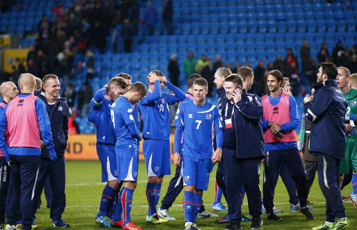Ísland er komið í umspil um sæti á HM í fótbolta í Brasilíu 2014 eftir 1-1 jafntefli við Norðmenn á Ullevaal-leikvanginum í Ósló í kvöld en þá fram lokaumferðin í riðlinum. Ísland tryggði sér með þessu annað sæti E-riðlilsins þar sem að Svisslendingar unnu 1-0 sigur á Slóveníu á sama tíma. Íslensku strákarnir fögnuðu gríðarlega í leikslok enda er þetta án vafa stærsta stundin í sögu íslenska karlalandsliðsins. Íslenska liðið endar með 17 stig eða tveimur stigum meira en Slóvenar. Kolbeinn Sigþórsson kom Íslandi yfir á 12. mínútu leiksins en Norðmenn náðu að jafna átján mínútum síðar. Íslenska liðið fékk þrjú frábær færi til að tryggja sér sigurinn í seinni hálfleik en annað markið leit ekki dagsins ljós. Norðmenn voru reyndar mikið með boltann í seinni hálfleiknum en náðu sem betur fer ekki að skapa sér neina alvöru færi og liðin sættust á jafntefli. Það reyndust vera frábær úrslit fyrir Ísland. Íslenska liðið lenti í því að verja jafnteflið stærsta hluta seinni hálfleiks og skynsamur leikur lengstum átti sinn þátt í því að Norðmenn náðu ekki að skapa sér mikið. Spennan hélt allt til leiksloka þar sem að sigurmarkið datt ekki þrátt fyrir góð færi. Norðmenn byrjuðu leikinn miklu betur og unnu boltann margt í hápressunni á upphafsmínútum leiksins. Fyrir vikið sköpuðu þeir sér nokkur hálffæri en það var hinsvegar íslenska liðið sem náði fyrstu alvöru sókninni og skoraði úr því fyrsta mark leiksins á 12. mínútu. Það voru gulldrengirnir Gylfi Þór Sigurðsson og Kolbeinn Sigþórsson sem áttu þetta mark skuldlaust. Kolbeinn átti gott hlaup og fann pláss á milli norsku miðvarðanna. Gylfi fann hann eftir frábæra sókn og Kolbeinn skoraði í fimmta landsleiknum í röð. Kolbeinn tók boltann með sér, snéri sér við og afgreiddi hann síðan fagmannlega í markið. Eftir markið tóku íslensku strákarnir öll völd og frábærir íslenskir áhorfendur voru farnir að bíða eftir öðru marki. Eiður náði ekki nógu góðum skall eftir fyrirgjöf frá Birki og Gylfi átti skot úr aukaspyrnu sem Rune Jarstein varði í horn. Íslenska liðið átti samt áfram í erfiðlegum gegn pressu norska liðsins. Jöfnunarmark Norðmanna kom samt upp úr engu á 30. mínútu en varnarleikur íslenska liðsins var þá ekki merkilegur. Allir voru langt frá mönnunum sínum og lentu í því að elta boltann. Norðmenn spiluðu sig vel í gegn með einni snertingu. Frábær snerting frá Daniel Braaten kom sókninni á flug og hann rak síðan endahnútinn á sóknina eftir að hafa fengið boltann aftur inn fyrir. Norska liðið var síðan mun sterkara liðið næstu mínútur á eftir markinu og það tók íslenska liðið smá tíma að jafna sig. Gylfi Þór Sigurðsson var síðan í þrígang nálægt því að skapa sér gott skotfæri á lokakafla hálfleiksins en í tvígang komst Brede Hangeland fyrir boltann og lokaskot hálfleiksins var síðan framhjá úr mjög þröngri stöðu við endamörkin. Norðmenn tóku völdin í seinni hálfleik og voru mikið með boltann en það voru samt Íslendingar sem sköpuðu sér langhættulegustu færin. Eiður Smári Guðjohnsen fékk frábært færi rétt áður en hann var tekinn af velli á 59. mínútu en Rune Jarstein varði vel frá honum. Skömmu síðar varði Rune Jarstein frá Birki eftir að Birki hafði komið sér í færi á markteignum. Birkir datt í teignum en stóð upp aftur og kom sér í fínt færi. Kolbeinn Sigþórsson fékk síðan frábært skotfæri í lokin en skot hans fór yfir. Í öll þessi skipti hefði íslenska liðið auðveldlega getað skorað og komið sér í frábæra stöðu. Það skipti sem betur fer ekki máli því Svisslendingar kláruðu sinn leik og Ísland er komið í umspil um laus sæti á HM í Brasilíu á næsta ári.mynd/vilhelmmynd/vilhelmmynd/vilhelmmynd/vilhelmmynd/vilhelmmynd/vilhelm