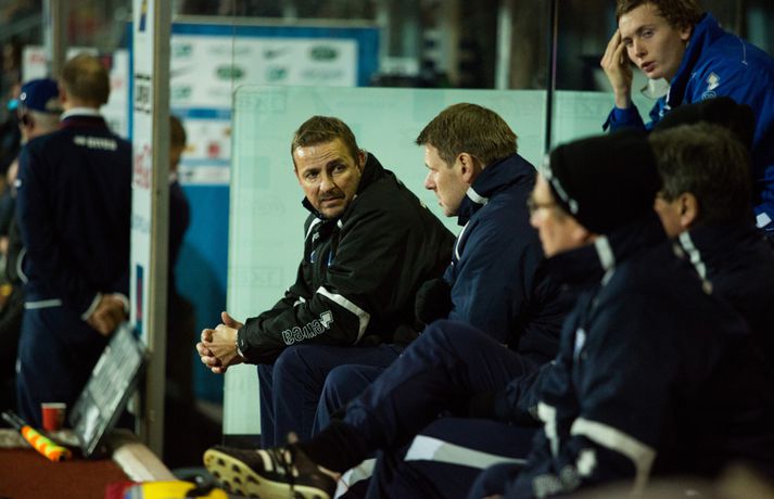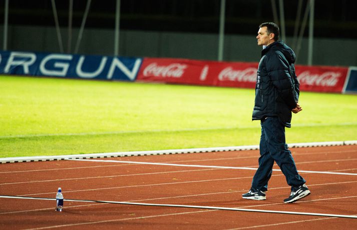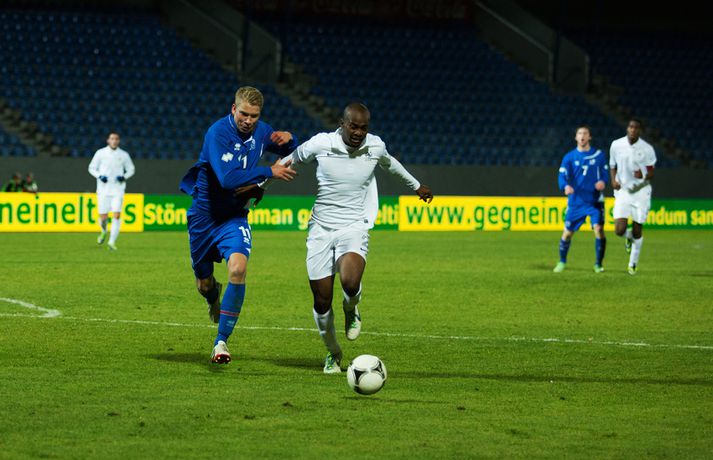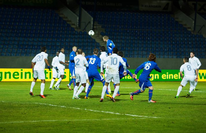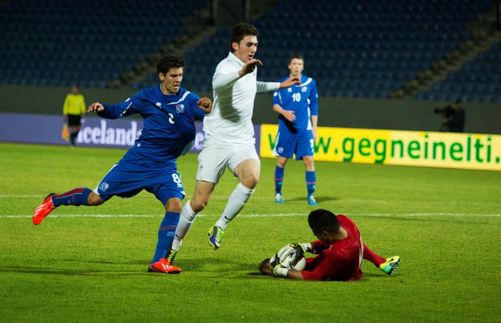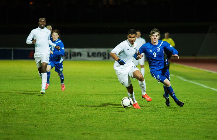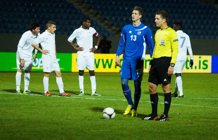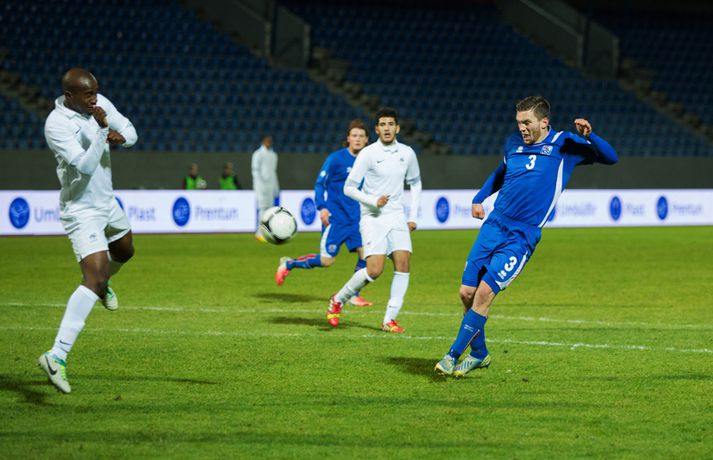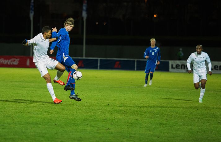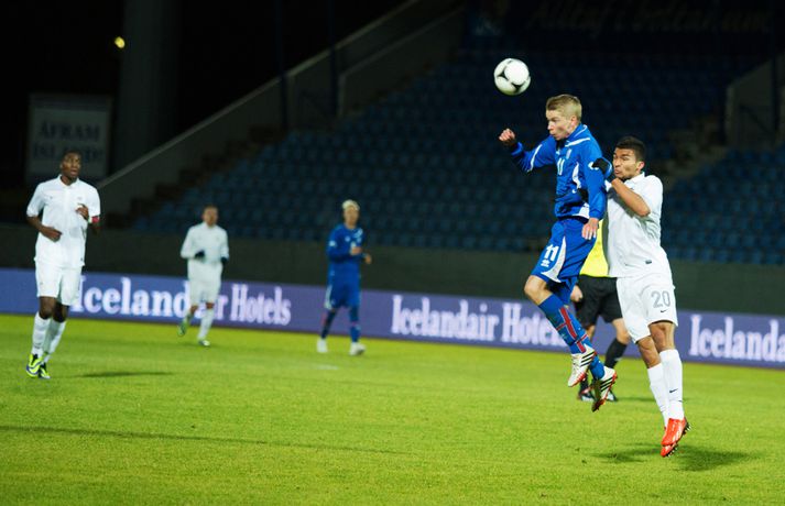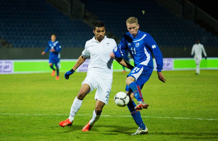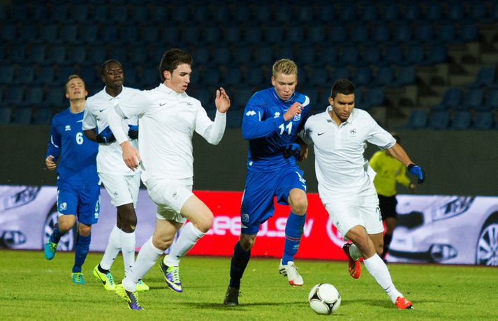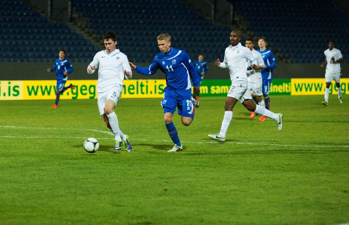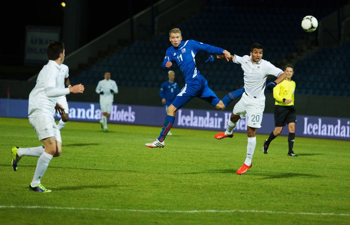 Umfjöllun, viðtöl og myndir: Ísland U-21 - Frakkland U-21 | 3-4 Fyrsta tap Íslands Sigmar Sigfússon á Laugardalsvelli skrifar 14. október 2013 11:21 Frá leiknum gegn Frökkum í kvöld. myndir / arnþór Íslenska U21 landslið karla í knattspyrnu tapaði sínum fyrsta leik í undankeppni EM, 3-4, á móti Frökkum á Laugardalsvelli í kvöld. Ísland komst tvisvar yfir í leiknum en Frakkar eru með gríðarlega sterkt lið og unnu leikinn sanngjarnt þar sem þeir voru sterkara aðilinn heilt yfir. Íslenska liðið byrjaði vel í leiknum og strákarnir voru ógnandi á upphafsmínútum. Sverrir Ingi Ingason fékk dauðafæri á 7. mínútu eftir hornspyrnu frá Guðmundi Þórarinssyni sem fór yfir markið. Sverrir skallaði knöttinn niður í grasið og yfir. Félagarnir tveir frá því fyrr í leiknum endurtóku leikinn. Guðmundur átti þá frábæra sendingu inn á teig úr aukaspyrnu. Þar stekkur Sverrir Ingi hæst allra og skallar knöttinn snyrtilega í markið. Ísland komið í eins marks forystu á 9. mínútu. Eftir markið hjá Íslandi settu Frakkar sig í gírinn. Þeir pressuðu stíft að marki Íslands nánast allan hálfleikinn þar til þeir jöfnuðu leikinn á 41. mínútu. Þar var að verki Lindsey Rose með frábærum skalla eftir sendingu inn á teig úr aukaspyrnu. Staðan var jöfn, 1-1, í hálfleik. Lindsey Rose var aftur á ferðinni 56. mínútu en í þetta sinn skoraði hann í sitt eigið mark. Hörður Björgvin Magnússon átti þá langt innkast inn á teiginn og eftir barning í teignum misheppnast hreinsun frá Lindsey sem endar í markinu. Íslands komið aftur yfir í leiknum, 2-1, og útlitið gott. En franska liðið er sterkt og þeir skoruðu næstu tvö mörkin með tveggja mínútna millibili. Yassine Benzia skoraði bæði mörkin á 67. mínútu og á 69. mínútu. Frakkar komnir yfir 2-3 og sýndu hversu fljótt þeir geta refsað liðum. Hólmbert Aron Friðþjófsson kom inn á sem varamaður á 74. mínútu og hann var ekki lengi að setja mark sitt á leikinn. Ísland fékk dæmda vítaspyrnu þegar að boltinn fór í höndina á frönskum leikmanni eftir þrumskot frá Brynjari Gauta Guðjónssyni. Hólmbert fór á punktinn og skoraði örugglega í sinni fyrstu snertingu í leiknum. Staðan jöfn, 3-3, og leikurinn orðinn spennandi á ný. Hörður Björgvin fékk þá dæmda á sig vítaspynu hinum megin á vellinum þegar hann fékk boltann í höndina inn í teig. Aðalstjarna og fyrirliði Frakka, Geoffrey Kondogbie, leikmaður Monaco, skoraði úr vítaspyrnunni á 83. mínútu með föstu skoti. Lengra komust okkar menn ekki og Frakkar sigruðu leikinn, 3-4, í skemmtilegum marka leik. Eyjólfur: Liðið er að verða betra og betra„Við áttum meira skilið úr þessum leik. Að skora þrjú mörk á móti svona frábæru liði er stórkostlegt. Við erum mjög sterkir í föstum leikatriðum“, sagði Eyjólfur Sverrisson, þjálfari Íslands eftir leikinn. „Liðið hefur verið að vaxa og er alltaf að verða betra og betra. Við ætlum okkur stóra hluti og erum farnir að einbeita okkur að næsta leik.“ „Svona leikur fer í reynslubankann hjá leikmönnum og menn koma sterkari tilbaka. Ég er sáttur með að skora þrjú mörk á svona öflugt lið og vinnsluna í liðinu sömuleiðis.“ „Við vorum mjög skipulagðir og vorum að gefa fá færi á okkur. Ég er sáttastur með það úr þessum leik,“ sagði Eyjólfur að lokum. Sverrir Ingi: við ætluðum að fá meira út úr þessum leik.„Mjög svekkjandi að ná engu út úr þessum leik. Við lögðum okkur allir 100% fram, vorum að spila við besta liðið í heiminum í þessum aldurflokki og áttum í fullu tré við þá,“ sagði Sverrir Ingi Ingason, sem skoraði fyrsta mark íslenska liðsins, eftir leikinn. „Þeir voru gífurlega öflugir en það er of mikið að fá á sig fjögur mörk. Við skoruðum samt þrjú á móti þeim sem er mjög jákvætt.“ „Þeir fengu víti sem var mjög vafasamt og svo áttu þeir tvær góðar sóknir sem þeir brutu vörnina. Annars gáfum við þeim ekki mörg færi.“ „Við skorum þrjú mörk sem á að vera nóg til þess að vinna fótboltaleik og við ætluðum að fá meira út úr þessum leik. Við erum með flotta fótboltamenn sem vilja fara sem lengst. Við erum ekkert hættir, við ætlum okkur sem lengst og í þetta umspil,“ sagði Sverrir ákveðinn að lokum. HM 2014 í Brasilíu Mest lesið Ekkert bit í snáknum: „Hörmulegur og ætti að hætta“ Sport Stoltur af stráknum en ætlar ekki að kaupa hann aftur Handbolti „Þú birtir falsfrétt um mig, þú ert í banni“ Fótbolti United horfir til Þýskalands eftir höfnun Semenyo Enski boltinn Haaland stóðst vigtun eftir jólin Enski boltinn Þessi tíu eru tilnefnd sem Íþróttamaður ársins 2025: 23 ára aldursmunur Sport Goðsögn fallin frá Enski boltinn Cunha vill skemmta og Howe treystir leikmönnum Enski boltinn Kærður af knattspyrnusambandinu Enski boltinn Meisturunum fatast flugið „af því hitt liðið er betra“ Körfubolti Fleiri fréttir Cunha vill skemmta og Howe treystir leikmönnum United horfir til Þýskalands eftir höfnun Semenyo „Þú birtir falsfrétt um mig, þú ert í banni“ Haaland stóðst vigtun eftir jólin Hápunktarnir hingað til í enska boltanum Goðsögn fallin frá Zidane sá soninn spila á Afríkumótinu Hótað brottrekstri ef hann færi ekki á börurnar Kærður af knattspyrnusambandinu Bestu jólamörkin: Drogba, Scholes eða Giroud? Býst ekki við að spila aftur fyrir landsliðið Féll úr skíðalyftu og lést Kynntu Sigurð á slaginu sex á aðfangadag Van de Ven bað Isak afsökunar: „Vildi ekki meiða hann“ Var frústreraður vegna landsliðsins Hvers vegna heillast stórliðin svo af Semenyo? Stewart, Snoop og Modric í eina sæng Mahrez batt enda á bið Alsíringa Heyrði hvorki frá Blikum né Víkingum Ruglaðar loka