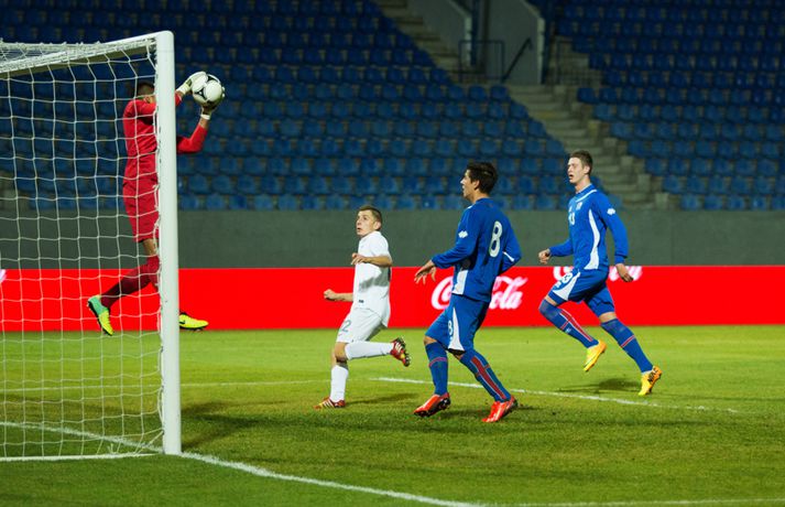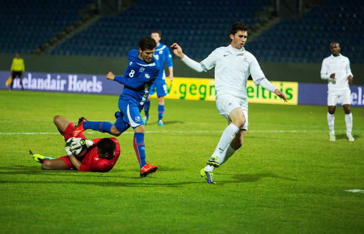 Íslenska U21 landslið karla í knattspyrnu tapaði sínum fyrsta leik í undankeppni EM, 3-4, á móti Frökkum á Laugardalsvelli í kvöld. Ísland komst tvisvar yfir í leiknum en Frakkar eru með gríðarlega sterkt lið og unnu leikinn sanngjarnt þar sem þeir voru sterkara aðilinn heilt yfir. Íslenska liðið byrjaði vel í leiknum og strákarnir voru ógnandi á upphafsmínútum. Sverrir Ingi Ingason fékk dauðafæri á 7. mínútu eftir hornspyrnu frá Guðmundi Þórarinssyni sem fór yfir markið. Sverrir skallaði knöttinn niður í grasið og yfir. Félagarnir tveir frá því fyrr í leiknum endurtóku leikinn. Guðmundur átti þá frábæra sendingu inn á teig úr aukaspyrnu. Þar stekkur Sverrir Ingi hæst allra og skallar knöttinn snyrtilega í markið. Ísland komið í eins marks forystu á 9. mínútu. Eftir markið hjá Íslandi settu Frakkar sig í gírinn. Þeir pressuðu stíft að marki Íslands nánast allan hálfleikinn þar til þeir jöfnuðu leikinn á 41. mínútu. Þar var að verki Lindsey Rose með frábærum skalla eftir sendingu inn á teig úr aukaspyrnu. Staðan var jöfn, 1-1, í hálfleik. Lindsey Rose var aftur á ferðinni 56. mínútu en í þetta sinn skoraði hann í sitt eigið mark. Hörður Björgvin Magnússon átti þá langt innkast inn á teiginn og eftir barning í teignum misheppnast hreinsun frá Lindsey sem endar í markinu. Íslands komið aftur yfir í leiknum, 2-1, og útlitið gott. En franska liðið er sterkt og þeir skoruðu næstu tvö mörkin með tveggja mínútna millibili. Yassine Benzia skoraði bæði mörkin á 67. mínútu og á 69. mínútu. Frakkar komnir yfir 2-3 og sýndu hversu fljótt þeir geta refsað liðum. Hólmbert Aron Friðþjófsson kom inn á sem varamaður á 74. mínútu og hann var ekki lengi að setja mark sitt á leikinn. Ísland fékk dæmda vítaspyrnu þegar að boltinn fór í höndina á frönskum leikmanni eftir þrumskot frá Brynjari Gauta Guðjónssyni. Hólmbert fór á punktinn og skoraði örugglega í sinni fyrstu snertingu í leiknum. Staðan jöfn, 3-3, og leikurinn orðinn spennandi á ný. Hörður Björgvin fékk þá dæmda á sig vítaspynu hinum megin á vellinum þegar hann fékk boltann í höndina inn í teig. Aðalstjarna og fyrirliði Frakka, Geoffrey Kondogbie, leikmaður Monaco, skoraði úr vítaspyrnunni á 83. mínútu með föstu skoti. Lengra komust okkar menn ekki og Frakkar sigruðu leikinn, 3-4, í skemmtilegum marka leik. Eyjólfur: Liðið er að verða betra og betra„Við áttum meira skilið úr þessum leik. Að skora þrjú mörk á móti svona frábæru liði er stórkostlegt. Við erum mjög sterkir í föstum leikatriðum“, sagði Eyjólfur Sverrisson, þjálfari Íslands eftir leikinn. „Liðið hefur verið að vaxa og er alltaf að verða betra og betra. Við ætlum okkur stóra hluti og erum farnir að einbeita okkur að næsta leik.“ „Svona leikur fer í reynslubankann hjá leikmönnum og menn koma sterkari tilbaka. Ég er sáttur með að skora þrjú mörk á svona öflugt lið og vinnsluna í liðinu sömuleiðis.“ „Við vorum mjög skipulagðir og vorum að gefa fá færi á okkur. Ég er sáttastur með það úr þessum leik,“ sagði Eyjólfur að lokum. Sverrir Ingi: við ætluðum að fá meira út úr þessum leik.„Mjög svekkjandi að ná engu út úr þessum leik. Við lögðum okkur allir 100% fram, vorum að spila við besta liðið í heiminum í þessum aldurflokki og áttum í fullu tré við þá,“ sagði Sverrir Ingi Ingason, sem skoraði fyrsta mark íslenska liðsins, eftir leikinn. „Þeir voru gífurlega öflugir en það er of mikið að fá á sig fjögur mörk. Við skoruðum samt þrjú á móti þeim sem er mjög jákvætt.“ „Þeir fengu víti sem var mjög vafasamt og svo áttu þeir tvær góðar sóknir sem þeir brutu vörnina. Annars gáfum við þeim ekki mörg færi.“ „Við skorum þrjú mörk sem á að vera nóg til þess að vinna fótboltaleik og við ætluðum að fá meira út úr þessum leik. Við erum með flotta fótboltamenn sem vilja fara sem lengst. Við erum ekkert hættir, við ætlum okkur sem lengst og í þetta umspil,“ sagði Sverrir ákveðinn að lokum.