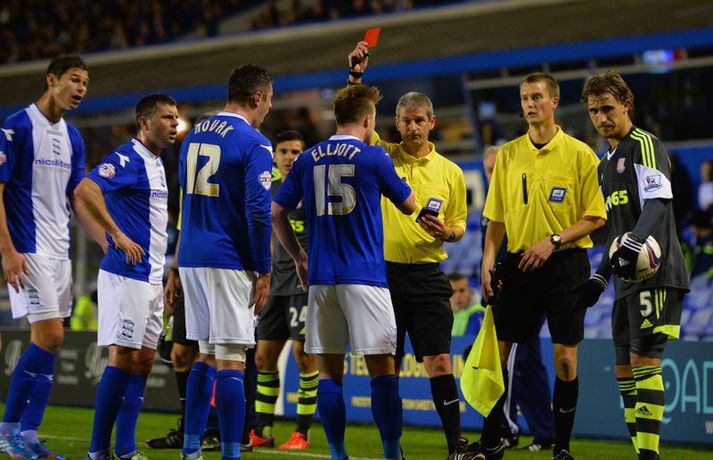 Hetjuleg barátta tíu Birmingham-manna í kvöld endaði í vítaspyrnukeppni þegar Stoke City tryggði sér sæti í átta liða úrslitum enska deildarbikarsins í fótbolta. Stoke City vann vítaspyrnukeppnina 4-2 eftir að leikurinn sjálfur hafði endaði með 4-4 jafntefli. Stoke nýtti allar sínar vítaspyrnur en leikmenn Birmingham klikkaði á tveimur fyrstu vítum sínum. Birmingham lék manni færri í 75 mínútur og náði að koma til baka og tryggja sér vítaspyrnukeppni eftir að hafa lent 1-3 undir í leiknum og 3-4 undir í framlengingu. Wade Elliott, leikmaður Birmingham, fékk rauða spjaldið á lokamínútu fyrri hálfleiks en staðan var 1-1 í hálfleik. Oussama Assaidi kom Stoke yfir á 10. mínútu en Tom Adeyemi jafnaði metin á 28. mínútu. Peter Crouch og Marko Arnautović komu Stoke í 3-1 í seinni hálfleik en varmaðurinn Peter Lövenkrands jafnaði með tveimur mörkum á síðustu fimm mínútunum. Kenwyne Jones kom Stoke enn á ný yfir í framlengingunni með marki á 94. mínútu en Olly Lee jafnaði á 118. mínútu og tryggði Birmingham vítaspyrnukeppni.Vítaspyrnukeppnin: Birmingham-Stoke 2-4 Mitch Hancox, Birmingham 0-0 (slá og yfir) Kenwyne Jones, Stoke 0-1 Callum Reilly, Birmingham 0-1(framhjá) Ryan Shawcross, Stoke 0-2 Peter Lövenkrands, Birmingham 1-2 Marc Muniesa, Stoke 1-3 Olly Lee, Birmingham 2-3 Steven N'Zonzi, Stoke 2-4 Chelsea, Manchester United, West Ham, Leicester og Stoke tryggðu sér sæti í átta liða úrslit enska deildabikarsins sem klárast síðan með þremur leikjum á morgun.