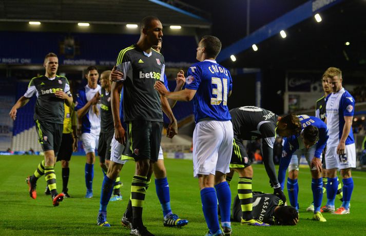 Tíu Birmingham-menn féllu ekki fyrr en í vítaspyrnukeppni Óskar Ófeigur Jónsson skrifar 29. október 2013 22:31 Callum Reilly klikkaði á víti í kvöld. Mynd/NordicPhotos/Getty Hetjuleg barátta tíu Birmingham-manna í kvöld endaði í vítaspyrnukeppni þegar Stoke City tryggði sér sæti í átta liða úrslitum enska deildarbikarsins í fótbolta. Stoke City vann vítaspyrnukeppnina 4-2 eftir að leikurinn sjálfur hafði endaði með 4-4 jafntefli. Stoke nýtti allar sínar vítaspyrnur en leikmenn Birmingham klikkaði á tveimur fyrstu vítum sínum. Birmingham lék manni færri í 75 mínútur og náði að koma til baka og tryggja sér vítaspyrnukeppni eftir að hafa lent 1-3 undir í leiknum og 3-4 undir í framlengingu. Wade Elliott, leikmaður Birmingham, fékk rauða spjaldið á lokamínútu fyrri hálfleiks en staðan var 1-1 í hálfleik. Oussama Assaidi kom Stoke yfir á 10. mínútu en Tom Adeyemi jafnaði metin á 28. mínútu. Peter Crouch og Marko Arnautović komu Stoke í 3-1 í seinni hálfleik en varmaðurinn Peter Lövenkrands jafnaði með tveimur mörkum á síðustu fimm mínútunum. Kenwyne Jones kom Stoke enn á ný yfir í framlengingunni með marki á 94. mínútu en Olly Lee jafnaði á 118. mínútu og tryggði Birmingham vítaspyrnukeppni.Vítaspyrnukeppnin: Birmingham-Stoke 2-4 Mitch Hancox, Birmingham 0-0 (slá og yfir) Kenwyne Jones, Stoke 0-1 Callum Reilly, Birmingham 0-1(framhjá) Ryan Shawcross, Stoke 0-2 Peter Lövenkrands, Birmingham 1-2 Marc Muniesa, Stoke 1-3 Olly Lee, Birmingham 2-3 Steven N'Zonzi, Stoke 2-4 Chelsea, Manchester United, West Ham, Leicester og Stoke tryggðu sér sæti í átta liða úrslit enska deildabikarsins sem klárast síðan með þremur leikjum á morgun. Enski boltinn Tengdar fréttir Chicharito með tvö fyrir Man. United - úrslit kvöldsins Chelsea, Manchester United, West Ham og Leicester City tryggðu sér öll í kvöld sæti í átta liða úrslitum enska deildarbikarsins í fótbolta. Óvæntustu úrslitin voru þegar Leicester City sló út úrvalsdeildarliðið Fulham í miklum markaleik. 29. október 2013 21:46 Chelsea sló Arsenal út á Emirates - sjötti sigurinn í röð Chelsea sló Arsenal út úr sextán liða úrslitum enska deildabikarsins þegar lærisveinar Jose Mourinho unnu 2-0 sigur á Emirates-leikvanginum í kvöld. 29. október 2013 21:37 Mest lesið Hafnaði 34 milljónum: „Vil ekki styðja kerfi sem býr til fíkn og eyðileggur líf“ Sport Littler sjóðheitur en sá fjórði besti varð fyrir áfalli Sport Liverpool-skotmarkið ekki á förum í janúar Enski boltinn Arnar Þór ráðinn til FIFA: „Himinlifandi að hafa fengið þetta starf“ Fótbolti Syrgja átján ára fimleikakonu Sport Haukur náði hundrað og hundrað fyrir EM Handbolti Salah sakaður um dýfu: „Getum ekki keppt við Egypta og dómarana“ Fótbolti Írar ætli að fylgja eftir tillögu Heimis Fótbolti Skoraði og fékk gult fyrir að benda Fótbolti Stjórnin leyst frá störfum eftir að tólf ára drengur drukknaði Sport Fleiri fréttir Liverpool-skotmarkið ekki á förum í janúar Aldrei spilað þarna en sagði strax já „Viss um að ég myndi skora einn daginn“ Watkins hélt ótrúlegri sigurgöngu Villa áfram Schade og Jiménez sendu Brentford og Fulham í efri hlutann Arsenal aftur á toppinn Fyrsta mark Wirtz í þriðja sigrinum í röð Cherki aðalmaðurinn í sigri City Úlfarnir heiðruðu minningu Jota Andri Lucas frá í mánuð Sjáðu dönsku þrumuna sem færði United-mönnum öll þrjú stigin Segir að Arsenal stefni á sögulega fernu á þessu tímabili Amorim endaði viðtalið á gamansömum nótum „Við eigum heima í Evrópu“ Daninn skaut Man. United upp fyrir Liverpool Amorim segir strákinn í frystinum vera framtíðin hjá Man. United Martinez með fyrirliðabandið og báðir Fletcher-bræðurnir á bekknum Havertz gæti snúið aftur á næstu dögum Alfons og Willum sáu tvö rauð spjöld fara á loft Synir Diogo Jota leiða leikmenn út á Anfield Cunha vill skemmta og Howe treystir leikmönnum United horfir til Þýskalands eftir höfnun Semenyo Haaland stóðst vigtun eftir jólin Hápunktarnir hingað til í enska boltanum Goðsögn fallin frá Kærður af knattspyrnusambandinu Bestu jólamörkin: Drogba, Scholes eða Giroud? Van de Ven bað Isak afsökunar: „Vildi ekki meiða hann“ Hvers vegna heillast stórliðin svo af Semenyo? Stewart, Snoop og Modric í eina sæng Sjá meira