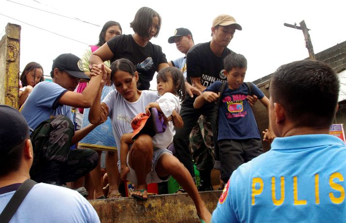 Myndir frá hamfarasvæðunum á Filippseyjum Guðsteinn Bjarnason skrifar 8. nóvember 2013 12:30 Móðir heldur ásamt tveimur börnum sínum í bráðabirgðaskýli í borginni Cebu, þar sem úrhellisrigning og hvassviðri hefur dunið á íbúum. Nordicphotos/AFP Fellibylurinn Hayian hefur farið hratt yfir á Filippseyjum í nótt og í morgun og gert þar mikinn usla. Aurskriður hafa fallið á mörgum stöðum, tré fokið upp með rótum og fjölmörg hús eyðilagst eða hreinlega horfið. Vitað er um fjögur dauðsföll af völdum fellibylsins, sem nefndur hefur verið Hayian. Fellibyljir eru algengir á Filippseyjum, en þessi er einn sá allra stærsti og öflugasti sem komið hefur á þessum slóðum. Vindstyrkurinn hefur víða farið yfir 65 metra á sekúndu og allt upp undir 80 metra í hviðum. Meira en 700 þúsund manns yfirgáfu heimili sín. Álíka öflugur fellibylur kom árið 1990 og varð hann meira en 500 manns að bana. Mest lesið „Ég hef aldrei upplifað annan eins harm“ Innlent Hrindir af stað söfnun fyrir móður stúlkunnar sem lést í Suður-Afríku Innlent Breiddi út faðminn fyrir rasista: „Þið þurfið ekki að biðjast afsökunar á að vera hvít lengur“ Erlent „Þetta hefur verið þungur tími“ Innlent Hundrað og fjörutíu milljarða bótakrafa á Samherja sé súrrealísk Innlent Gaf fingurinn á Miklubraut Innlent Sprengdu rússneskan hershöfðingja í loft upp í Moskvu Erlent Undirbúningur árásarinnar stóð yfir í marga mánuði Erlent Naut aðstoðar samskiptasérfræðinga vegna veiðigjaldamálsins Innlent Appelsínugular og gular viðvaranir á aðfangadag Veður Fleiri fréttir Gaf fingurinn á Miklubraut Birtir drög að lögum um lagareldi: Hyggst leggja niður Fiskeldissjóð Hundrað og fjörutíu milljarða bótakrafa á Samherja sé súrrealísk Skemmdir í kirkjugörðum vegna aksturs utan vegar Ólýsanlegur harmur fyrir fjölskylduna og söfnun hleypt af stokkunum „Ég hef aldrei upplifað annan eins harm“ Vill leiða lista Sjálfstæðismanna í Reykjanesbæ „Þetta hefur verið þungur tími“ Naut aðstoðar samskiptasérfræðinga vegna veiðigjaldamálsins Hrindir af stað söfnun fyrir móður stúlkunnar sem lést í Suður-Afríku Varð vitni að ótrúlegum norðurljósum: „Mér fannst þetta magnað“ Færir nýársboðið fram á þrettándann Fjórir fluttir á sjúkrahús eftir bílveltu á Suðurlandi Leggur aftur til hverfislögreglustöð í Breiðholti Nú má heita Love, Tóní, Ranimosk og Draumur Kvartar til umboðsmanns og vonar að Vegagerðin sjái að sér Ætlar ekki að beita sér í máli starfsmanns Útlendingastofnunar „Ég vil ekki nokkurn tímann sjá neitt svona aftur“ Gyðingar á Íslandi upplifa aukinn ótta Ferðaþjónusta blómstrar í uppsveitum Árnessýslu „Þetta er bara ljótt“ Hljóti að vera komið að því að skoða öryggisgæslu við skóla Ætlar að skýra hvenær rjúfa megi þagnarskyldu Þagnarskylda heilbrigðisstarfsfólks og öryggisgæsla við grunnskóla Eyjólfur í orlof og Inga þrefaldur ráðherra Vegagerðin segir flóðin í Vík fyrirséð Fjölmiðlar, bókmenntir og hægrimennska á Sprengisandi „En hver sagði að þetta ætti að vera auðvelt?“ Milljónir til almannatengla og átta sinnum meira en í fyrra Grunuð um að koma til landsins til að brjóta á öldruðum Sjá meira