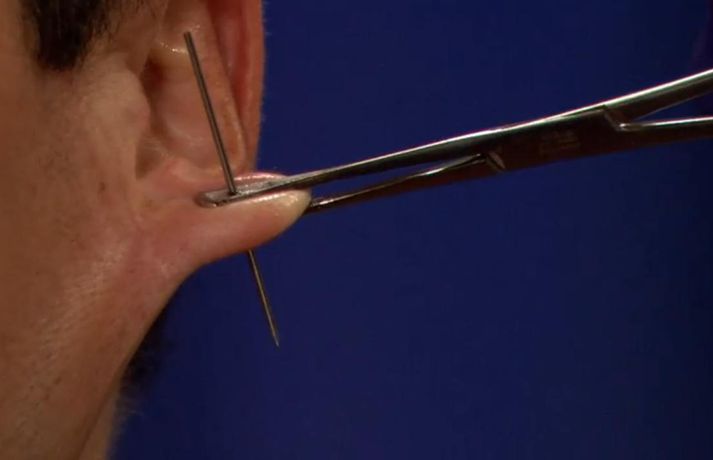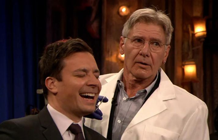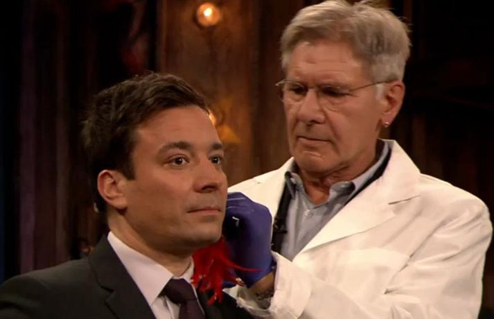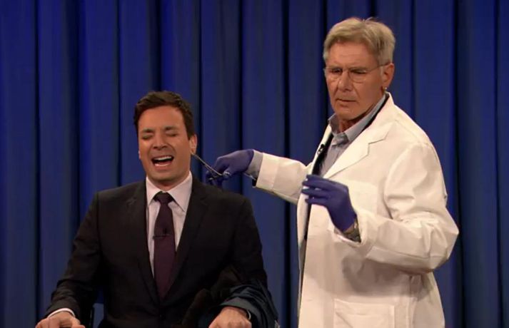 Stórleikarinn Harrison Ford fór á kostum í sjónvarpsþætti grínarans Jimmy Fallon þar sem hann gataði annað eyrað á Jimmy. „Ég hef beðið Harrison Ford um að gata eyra mitt því hann er ein svalasta manneskja sögunnar og mig langar að vera eins og hann,“ sagði Jimmy við áhorfendur áður en ballið byrjaði. Harrison lét gata eyra sitt árið 1997 þegar hann var 55 ára. Harrison bar sig að verkinu eins og fagmaður en hann mætti í þáttinn til að kynna nýjustu mynd sína Ender‘s Game. Jimmy þurfti að taka á honum stóra sínum til að fríka ekki út í sjónvarpssal en allt er gott sem endar vel og tókst götunin eins og í sögu eins og sést í myndbandinu hér fyrir neðan. Jimmy er litríkur karakter og valdi að skarta ansi skrautlegum fjaðraeyrnalokki. Óvíst er hvort lokkurinn fái að staldra lengi við í eyranu en uppátækið er engu að síður skemmtilegt.