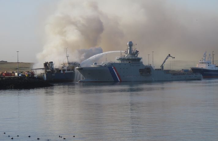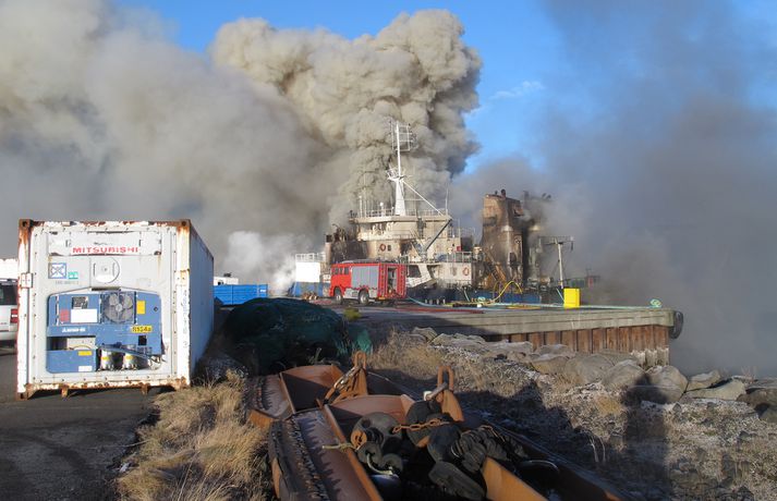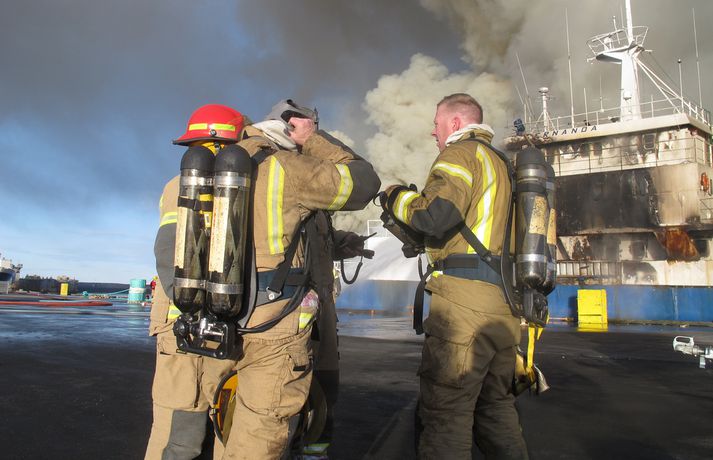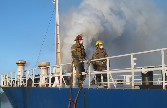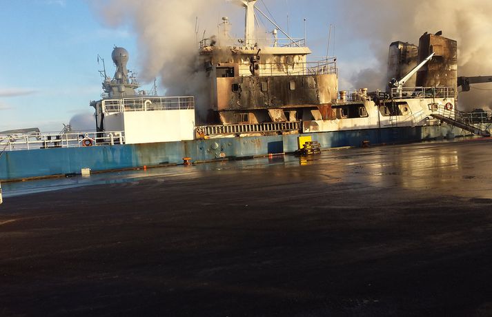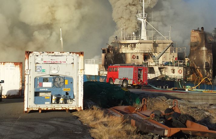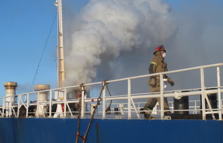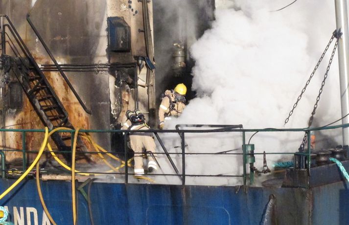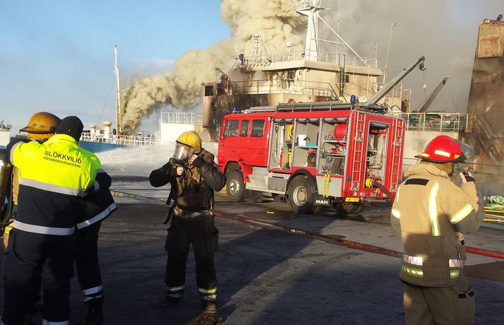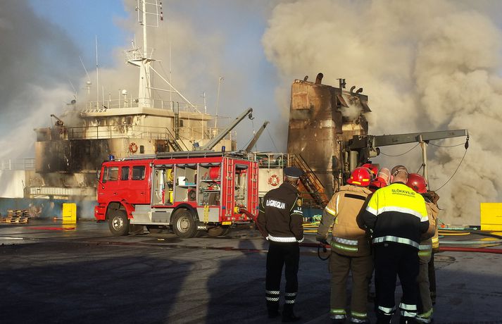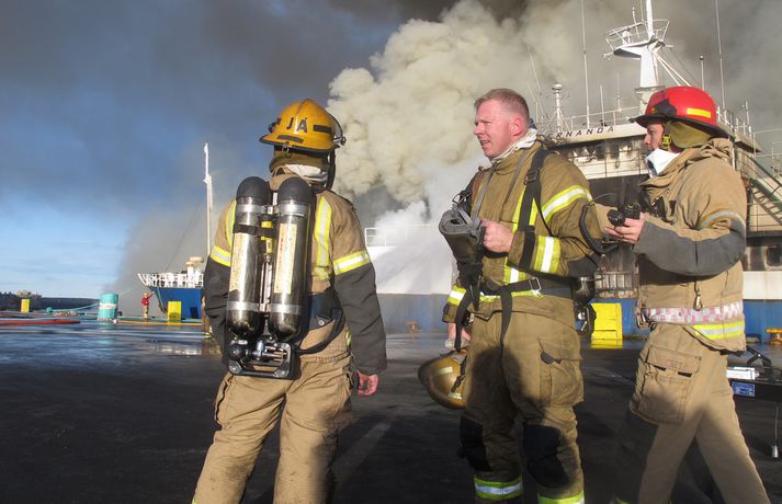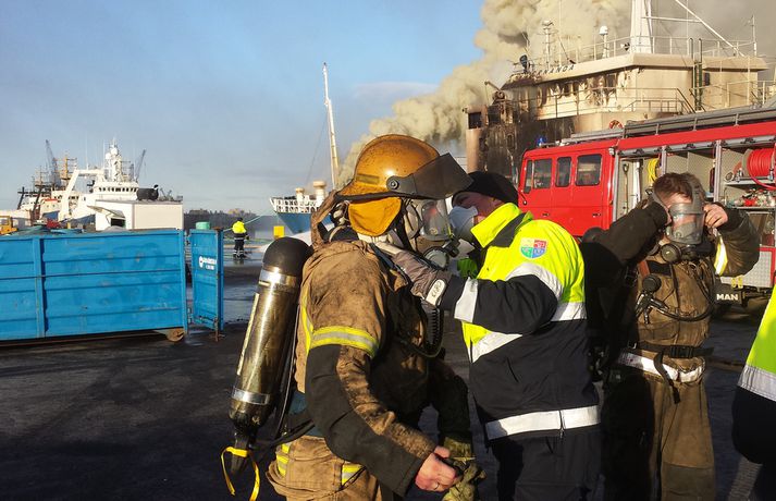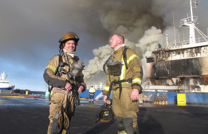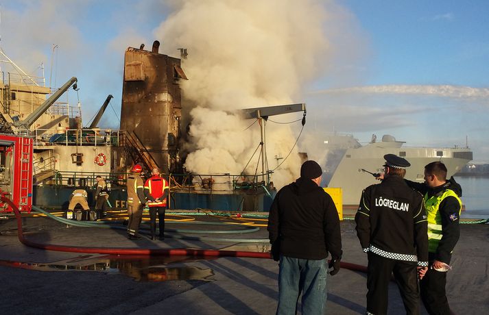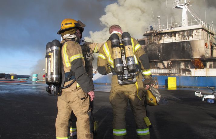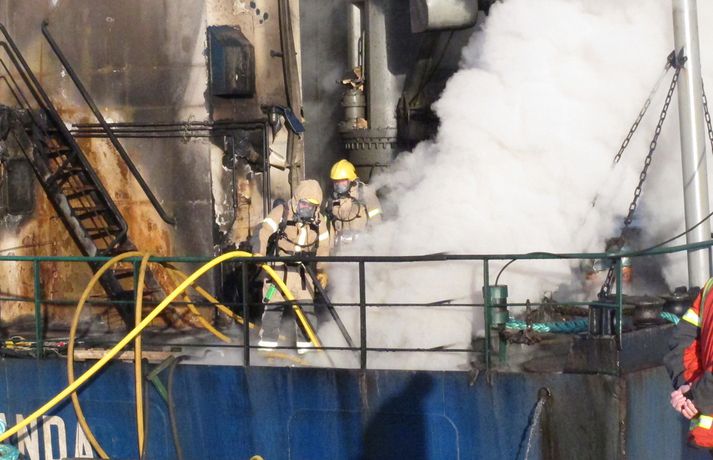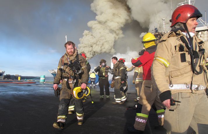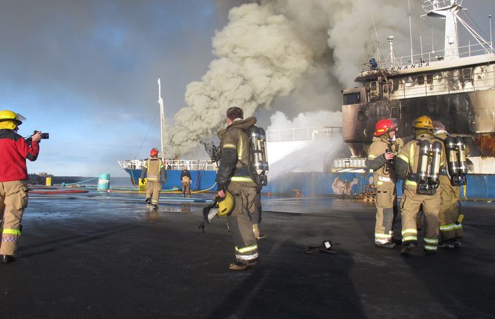 Magnaðar myndir úr brunanum: Svavar Halldórs liðtækur ljósmyndari Jón Júlíus Karlsson skrifar 1. nóvember 2013 15:38 Mynd/Svavar Halldórsson Svavar Halldórsson, fyrrverandi fréttamaður á RUV, náði mögnuðum myndum af slökkviliðsmönnum við störf í Hafnarfjarðarhöfn í dag. Slökkviliðsmenn unnu hörðum höndum að því að slökkva eld í Flutningaskipinu Fernöndu sem gaus upp eftir að skipið lagðist að bryggju í Hafnarfirði. „Ég er með skrifstofu við Strandgötu og sá að það var eitthvað mikið að gerast niður á höfn. Ég er alltaf með myndavél með mér og ákvað að taka nokkrar myndir. Það var magnað að sjá slökkviliðsmenn að stöfum í dag,“ segir Svavar í samtali við Vísi. Svavar er margreyndur fjölmiðlamaður og starfaði sem fréttamaður á RUV í um áratug. Hann segist hafa lært eitt og annað í ljósmyndum á tíma sínum í fjölmiðlum. „Ég hef unnið með mörgum færum kvikmyndatökumönnum og ljósmyndurum og maður lærir auðvitað mikið af því,“ segir Svavar. „Ég hef gaman af því að taka myndir og geri töluvert af því. Ég náði líka nokkrum ótrúlegum myndum með Samsung-símanum. Það er ótrúlegt hvað það er hægt að ná góðum myndum með símanum nú til dags.“ Sjá má fleiri frábærar myndir á Flickr-síðu Svavars. Mest lesið Tveir lögreglumenn sprengdir í loft upp Erlent Blússandi hagvöxtur í Bandaríkjunum Erlent Bæta við allt að 200 íbúðum og mathöll í Spöngina Innlent Minni rekstrarkostnaður fyrir eigendur bensínháka Innlent Maður í umferðarslysi reyndist fíkniefnasali Innlent Hvar er opið á aðfangadag? Innlent Foreldrar skipverjans fá áheyrn í Hæstarétti Innlent Hafnar „jólakveðju“ ríkisins Innlent Innflytjendamálin almenningi efst í huga Innlent Innanlandsflugi aflýst Innlent Fleiri fréttir Arion banki varar við svikaherferð Innanlandsflugi aflýst Foreldrar skipverjans fá áheyrn í Hæstarétti Hvar er opið á aðfangadag? Innflytjendamálin almenningi efst í huga Bæta við allt að 200 íbúðum og mathöll í Spöngina Maður í umferðarslysi reyndist fíkniefnasali Minni rekstrarkostnaður fyrir eigendur bensínháka Hafnar „jólakveðju“ ríkisins Hefði þurft hjólbörur undir öll verðlaunin sín Ýmis ráð til taugatrekktra á Þorláksmessu Ekkert því til fyrirstöðu að Ásthildur Lóa verði aftur ráðherra Óvissa um ráðherraskipan og skata fyrir byrjendur Maðurinn fundinn Sigríður Halldórsdóttir nýr ritstjóri Kastljóss Íslendingur í gæsluvarðhaldi í Kólumbíu vegna gruns um kynferðisbrot Forsætisráðuneytið eyddi meiru í almannatengla í fyrra en í ár Inkalla snuð vegna of mikils magns BPA-plastefna Svanhildur Sif heiðruð Falskar netverslanir: Auglýsir rýmingarsölu nokkrum dögum eftir opnun Meðallaun upplýsingafulltrúa hækkuðu hlutfallslega mest Skötuilmurinn leggst yfir landið og Samkeppniseftirlitið ætlar að fylgjast vel með bensínverðinu Áfram auknar líkur á eldgosi Sektaður um hundruð þúsunda fyrir að sparka í hund Stýra fjármálum og mannauðsmálum Þjóðleikhússins Sló mann í höfuðið með glerflösku á ísfirskum skemmtistað Ekið á konu á Langholtsvegi Ríkissjóður greiðir fyrir flutning hinna látnu til Íslands Undrandi á ráðningu ráðgjafa „Krítískur massi af snarbrjáluðu fólki nær yfirhöndinni“ Sjá meira