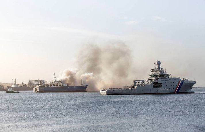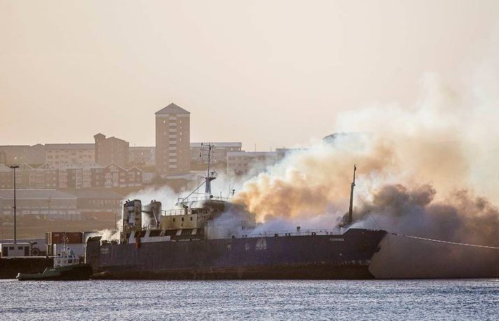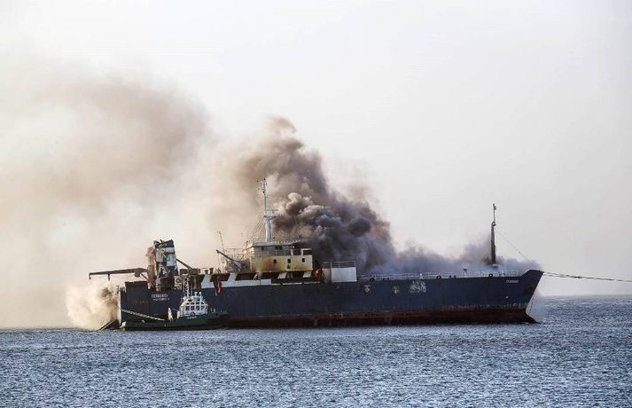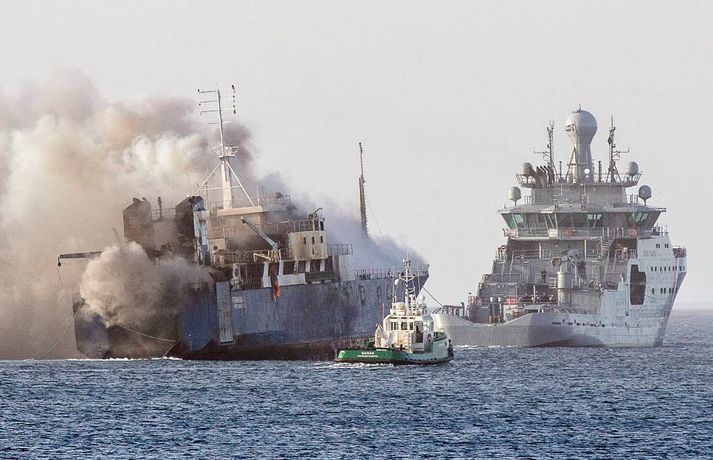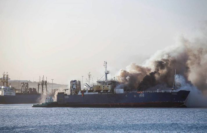 Fernanda dregin út úr höfninni Kristján Hjálmarsson skrifar 1. nóvember 2013 11:53 Fernanda var dregin út úr höfninni í Hafnarfirði. myndir/pjetur og vilhelm Slökkvilið höfuðborgarsvæðisins og Landhelgisgæslan eru byrjuð að draga flutningaskipið Fernöndu út úr Hafnarfjarðarhöfn. Ekki er vitað hvert farið verður með skipið. Fulltrúar Hafrannsóknarstofnunar og Umhverfisstofnunar munu funda strax eftir hádegi hvert best sé að fara með skipið en finna þarf stað þar sem minnsta hættan skapast fari svo að Fernanda sökkvi. Um hundrað tonn af olíu eru um borð í skipinu. Um tuttugu slökkviliðsmenn taka þátt í slökkvistarfinu auk varðskipsins Þórs. Sprengjusérfræðingur Landhelgisgæslunnar segir þetta einu erfiðustu aðstæður sem slökkviliðsmenn hafa lent í og heppni að ekki sé um stærra skip að ræða. Reyk leggur yfir suðurbæinn í Hafnarfirði og hvetur slökkviliðið fólk að loka gluggum svo heimili þeirra fyllist ekki af reyk.mynd/pjeturmynd/pjeturmynd/pjeturmynd/vilhelmmynd/pjeturmynd/pjeturmynd/pjeturmynd/stöð 2 Tengdar fréttir Gríðarleg hætta af logandi skipi í Hafnarfjarðarhöfn Að sögn sprengjusérfræðings hjá Landhelgisgæslunni er skipið að hitna og mikill eldsmatur um borð - um hundrað tonn af olíu. 1. nóvember 2013 10:43 Ennþá logar vel í skipinu Varðskipið Þór er komið á staðinn og notar slökkvibyssur við að kæla skipið að utanverðu. 30. október 2013 22:10 Tollverðir tóku á móti skipverjum Tollverðir tóku á móti skipverjum flutningaskipsins Fernanda þegar þeir lentu við stjórnstöð landhelgisgæslunnar í Skógarhlíð á fjórða tímanum í dag. 30. október 2013 17:01 Magnaðar myndir af slökkvistarfi í Fernöndu Varðskipið Þór hefur tekið flutningaskipið Fernöndu í tog og mun draga það til hafnar í Hafnarfirði. 31. október 2013 15:18 Skipverjarnir heilir á húfi Skipverjarnir 11 sem þyrla landhelgisgæslunnar TF-GNA bjargaði fyrr í dag eru heilir á húfi samkvæmt upplýsingum frá landhelgisgæslunni. 30. október 2013 15:58 Leikskólabörnum haldið inni út af brunanum „Það er svo mengað loftið að við fórum ekkert út í morgun og erum með lokaða glugga. Öll börnin eru inni,“ segir Særún Þorláksdóttir leikskólastjóri. 1. nóvember 2013 11:28 Fernanda á reki Flutningaskipið hefur rekið undan austanáttinni í nótt og er komið vestur á Selvogsbanka. 31. október 2013 07:29 Brú skipsins alelda - Öllum skipverjum bjargað Þyrla landhelgisgæslunnar TF-GNA bjargaði fyrir öllum 11 skipverjum flutningaskipsins Fernanda. 30. október 2013 13:55 Mest lesið Fátækari eftir að hafa svindlað á ferðakonum Innlent Hvar er opið á aðfangadag? Innlent Tveir lögreglumenn sprengdir í loft upp Erlent Blússandi hagvöxtur í Bandaríkjunum Erlent Minni rekstrarkostnaður fyrir eigendur bensínháka Innlent Bæta við allt að 200 íbúðum og mathöll í Spöngina Innlent Foreldrar skipverjans fá áheyrn í Hæstarétti Innlent Maður í umferðarslysi reyndist fíkniefnasali Innlent Arion banki varar við svikaherferð Innlent Innflytjendamálin almenningi efst í huga Innlent Fleiri fréttir Gleðileg jól, kæru lesendur Einn fluttur á sjúkrahús eftir bílslys Skiluðu hagnaði á kosningaári Hátíðarveisla á kaffistofu Samhjálpar: „Það er ró og friður yfir fólki“ Björgunarsveitin kölluð út í fokverkefni Grjóthrun undir Eyjafjöllum Fátækari eftir að hafa svindlað á ferðakonum Arion banki varar við svikaherferð Innanlandsflugi aflýst Foreldrar skipverjans fá áheyrn í Hæstarétti Hvar er opið á aðfangadag? Innflytjendamálin almenningi efst í huga Bæta við allt að 200 íbúðum og mathöll í Spöngina Maður í umferðarslysi reyndist fíkniefnasali Minni rekstrarkostnaður fyrir eigendur bensínháka Hafnar „jólakveðju“ ríkisins Hefði þurft hjólbörur undir öll verðlaunin sín Ýmis ráð til taugatrekktra á Þorláksmessu Ekkert því til fyrirstöðu að Ásthildur Lóa verði aftur ráðherra Óvissa um ráðherraskipan og skata fyrir byrjendur Maðurinn fundinn Sigríður Halldórsdóttir nýr ritstjóri Kastljóss Íslendingur í gæsluvarðhaldi í Kólumbíu vegna gruns um kynferðisbrot Forsætisráðuneytið eyddi meiru í almannatengla í fyrra en í ár Inkalla snuð vegna of mikils magns BPA-plastefna Svanhildur Sif heiðruð Falskar netverslanir: Auglýsir rýmingarsölu nokkrum dögum eftir opnun Meðallaun upplýsingafulltrúa hækkuðu hlutfallslega mest Skötuilmurinn leggst yfir landið og Samkeppniseftirlitið ætlar að fylgjast vel með bensínverðinu Áfram auknar líkur á eldgosi Sjá meira