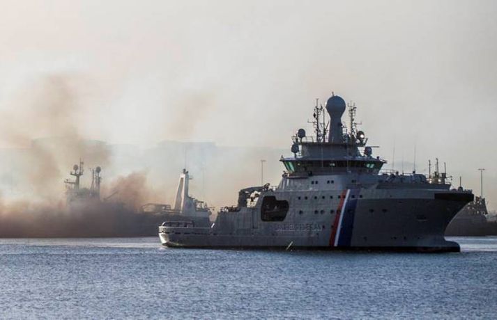 Ennþá logar vel í skipinu Varðskipið Þór er komið á staðinn og notar slökkvibyssur við að kæla skipið að utanverðu. 30. október 2013 22:10