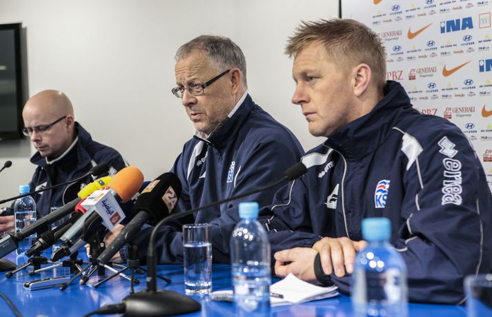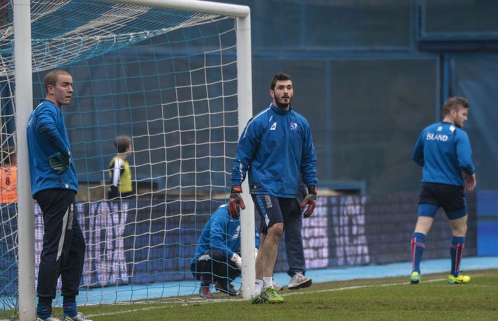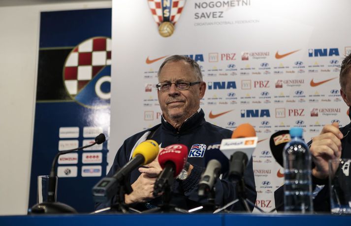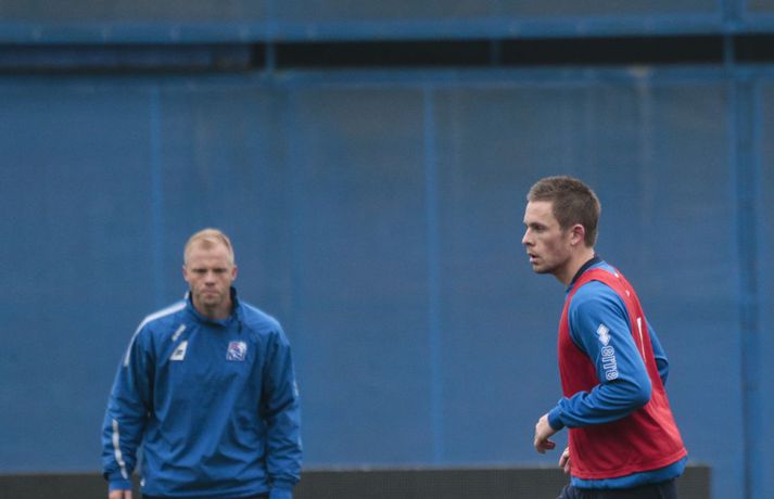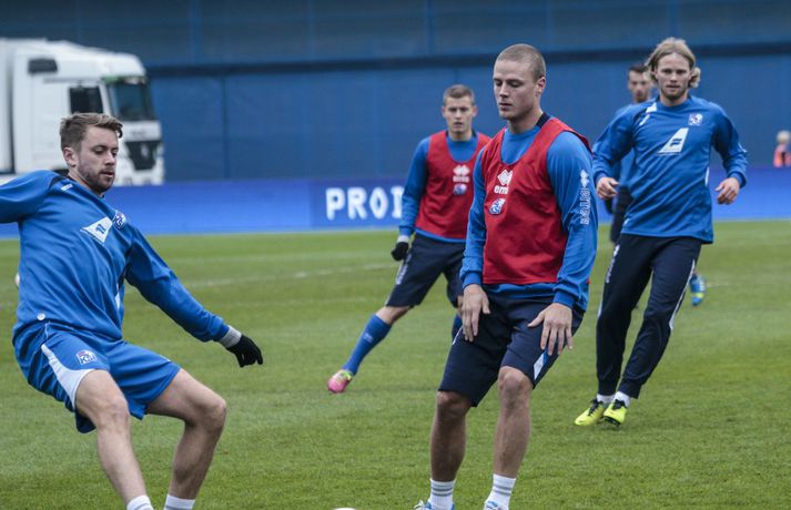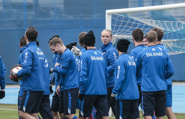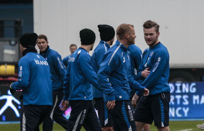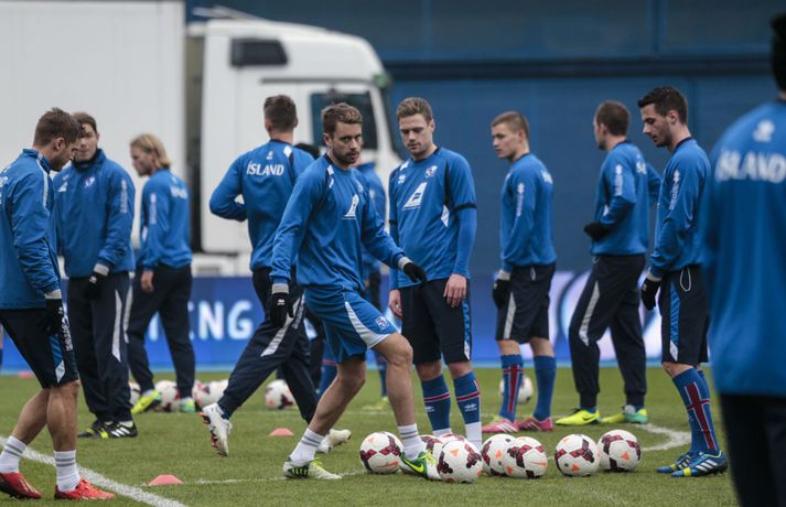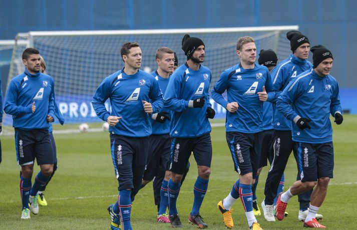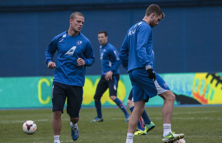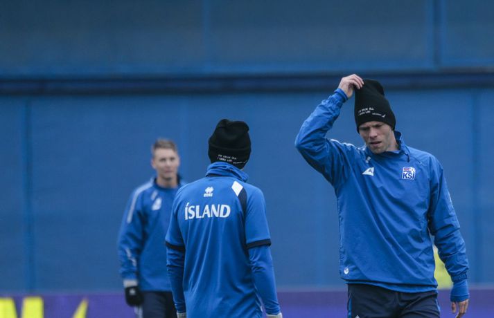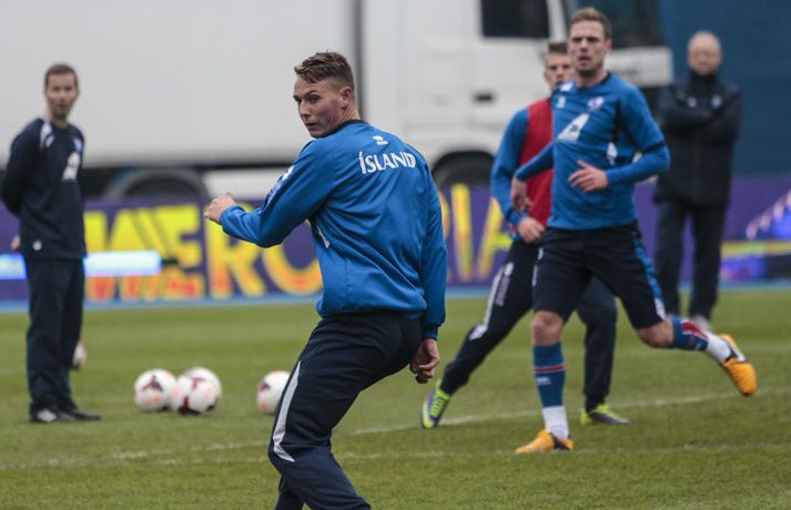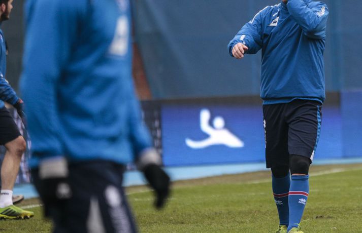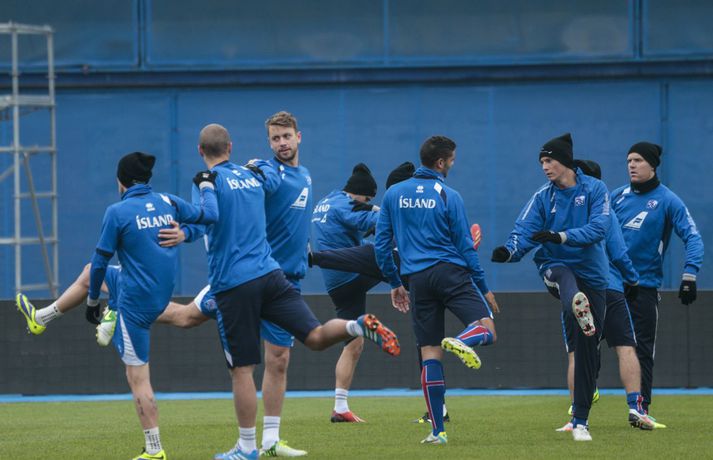 Allir leikmenn karlalandsliðs Íslands í knattspyrnu tóku þátt í æfingu liðsins á Maksimir-leikvanginum í Zagreb í Króatíu í dag. Leikmönnum gekk misvel að festa svefn í nótt eftir ferðalagið frá Íslandi. Sumir sofnuðu í vélinni sem hjálpaði ekki til en vafalítið spilar inn í að spennan hjá leikmönnum liðsins, líkt og fjölmörgum landsmönnum, er mikil. Landsliðsþjálfarinn Lars Lagerbäck var ánægður að æfingunni lokinni. Hann sagði æfinguna aðallega hafa snúist um að hlaupa úr sér þreytu, leikmenn væru kannski ekki alveg 100 prósent búnir að jafna sig en þeir yrðu klárir í slaginn á morgun. Strákarnir virkuðu í það minnsta eldhressir á æfingunni sem Vilhelm Gunnarsson, ljósmyndari Fréttablaðsins og Vísis, myndaði í bak og fyrir í dag. Leikurinn annað kvöld hefst svo klukkan 19.15 að íslenskum tíma.