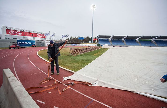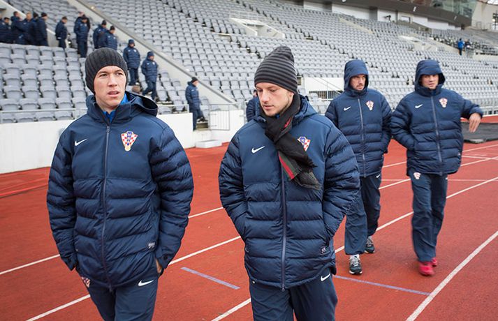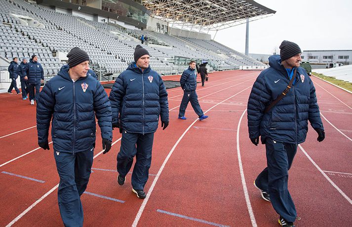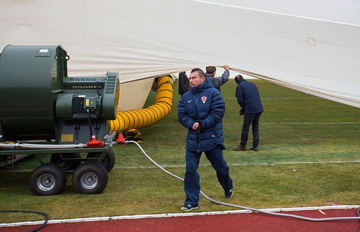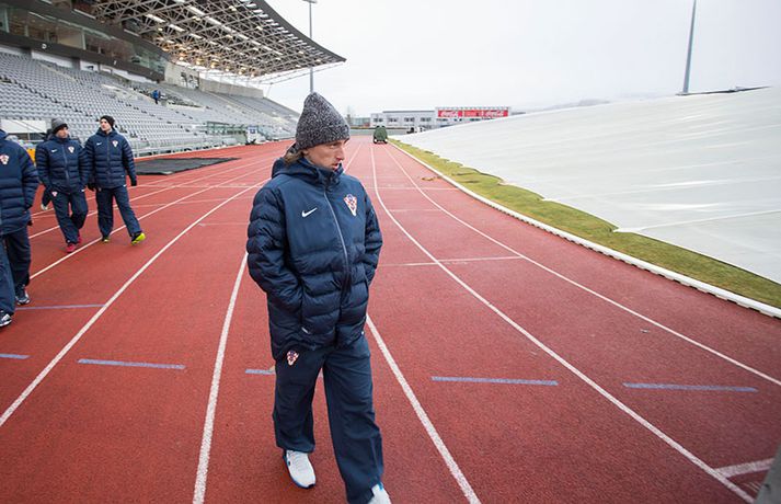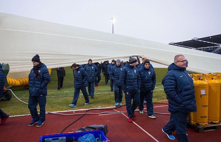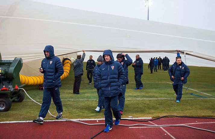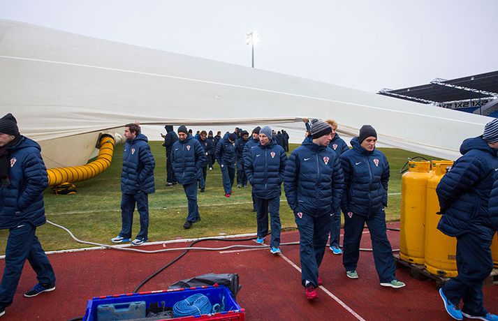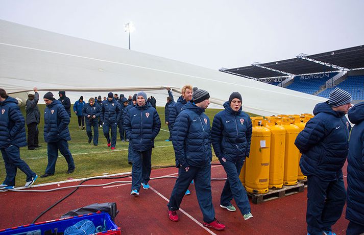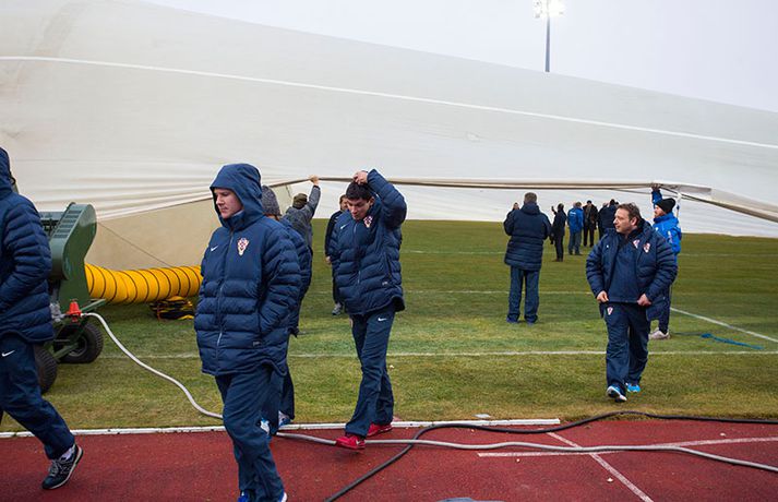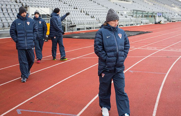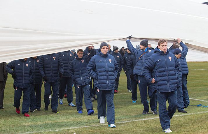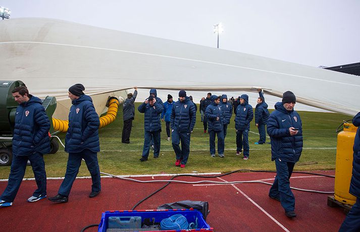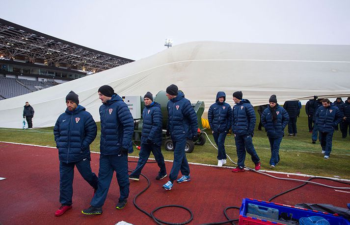 Leikmenn króatíska landsliðsins fengu ekki að æfa á Laugardalsvelli í gær. Þeir voru aftur mættir á völlinn rétt fyrir hádegi til þess að kíkja á völlinn. Það þurfti að fresta því að taka hitadúkinn af vellinum í smá tíma þar sem Króatarnir þurftu að komast á grasið. Það var líka eðlilega stemning í því fyrir leikmennina að komast undir dúkinn fræga. Þegar Króatarnir voru farnir var loksins hægt að fjarlægja dúkinn. Við blasti iðagrænn og fallegur Laugardalsvöllur. Daníel Rúnarsson, ljósmyndari Fréttablaðsins og Vísis, var venju samkvæmt í Laugardalnum og tók myndir af Króötunum undir dúknum. Daníel tók einnig myndir af því er dúkurinn var tekinn af og þegar forsvarsmenn Tólfunnar settu upp nýjan borða á stúkuna. Myndirnar má sjá hér að ofan.Luka Modric, miðjumanni Real Madrid, var kalt á Laugardalsvellinum í hádeginu.mynd/daníel