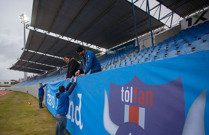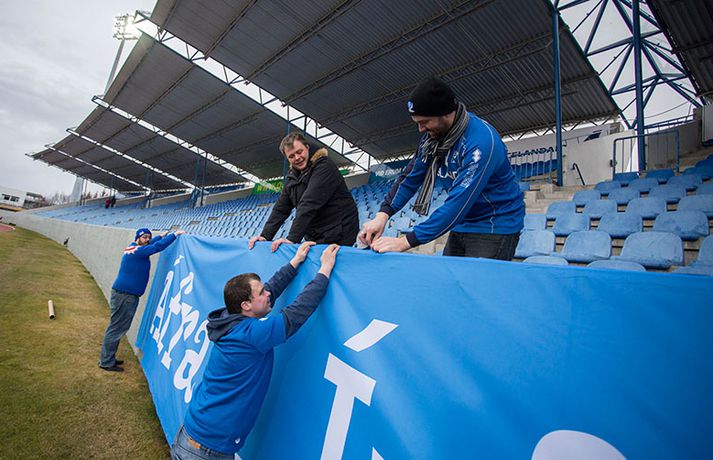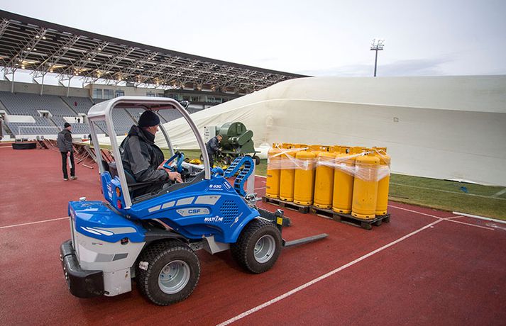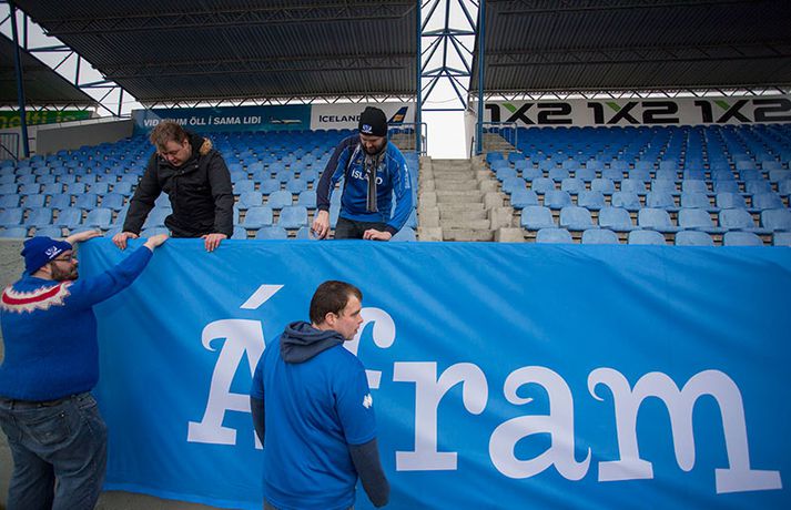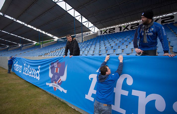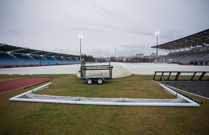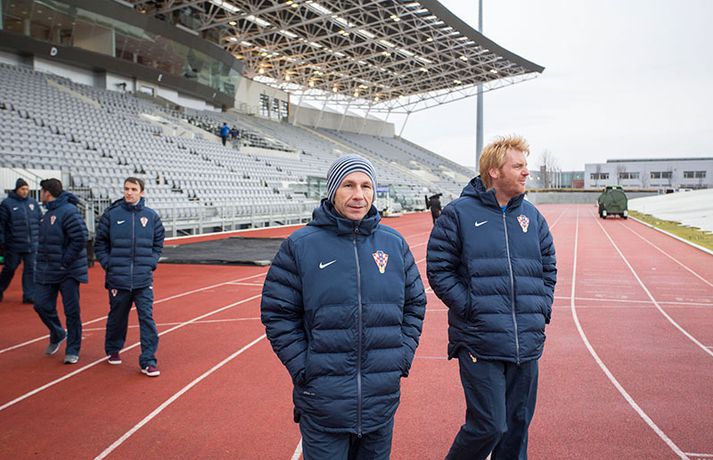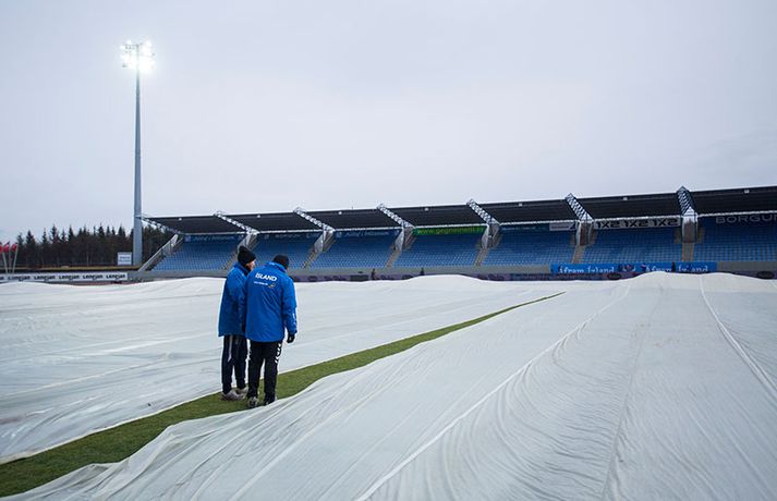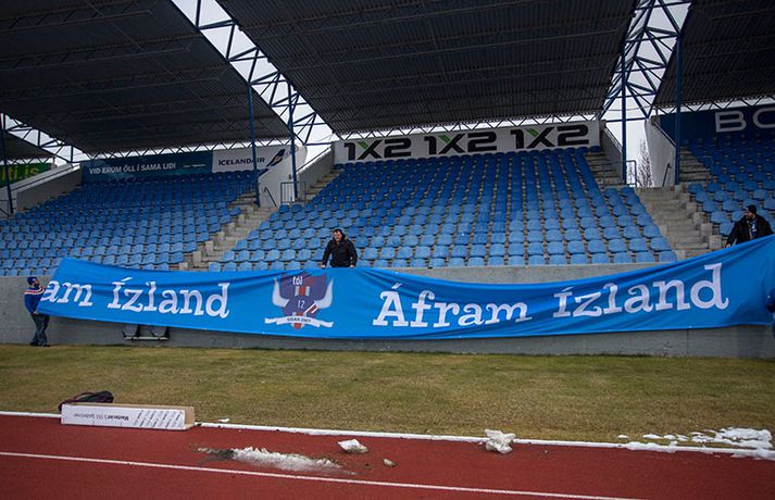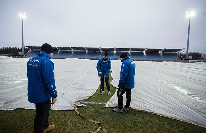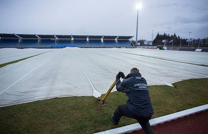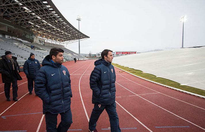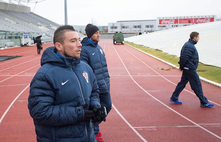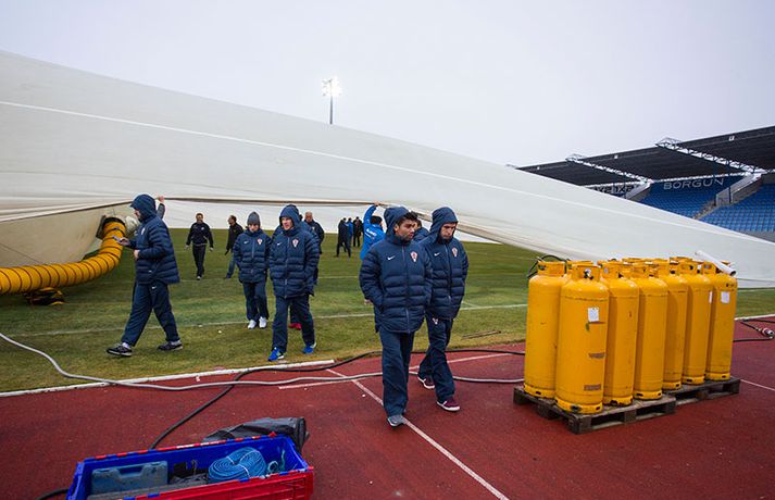 Leikmenn króatíska landsliðsins fengu ekki að æfa á Laugardalsvelli í gær. Þeir voru aftur mættir á völlinn rétt fyrir hádegi til þess að kíkja á völlinn. Það þurfti að fresta því að taka hitadúkinn af vellinum í smá tíma þar sem Króatarnir þurftu að komast á grasið. Það var líka eðlilega stemning í því fyrir leikmennina að komast undir dúkinn fræga. Þegar Króatarnir voru farnir var loksins hægt að fjarlægja dúkinn. Við blasti iðagrænn og fallegur Laugardalsvöllur. Daníel Rúnarsson, ljósmyndari Fréttablaðsins og Vísis, var venju samkvæmt í Laugardalnum og tók myndir af Króötunum undir dúknum. Daníel tók einnig myndir af því er dúkurinn var tekinn af og þegar forsvarsmenn Tólfunnar settu upp nýjan borða á stúkuna. Myndirnar má sjá hér að ofan.Luka Modric, miðjumanni Real Madrid, var kalt á Laugardalsvellinum í hádeginu.mynd/daníel