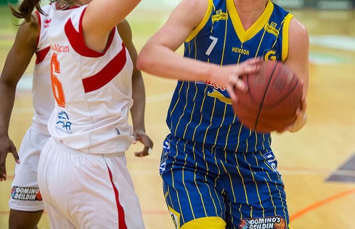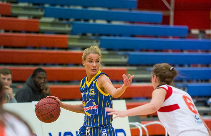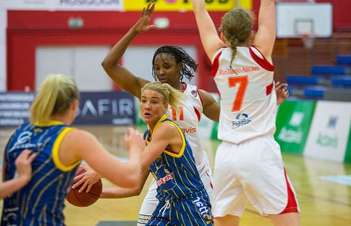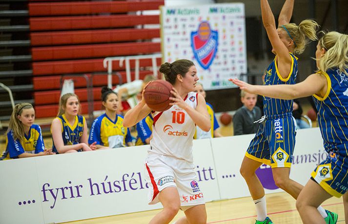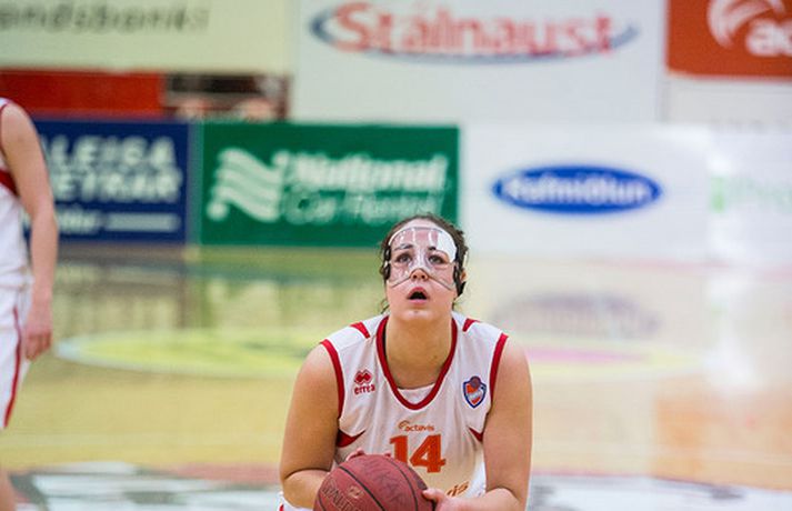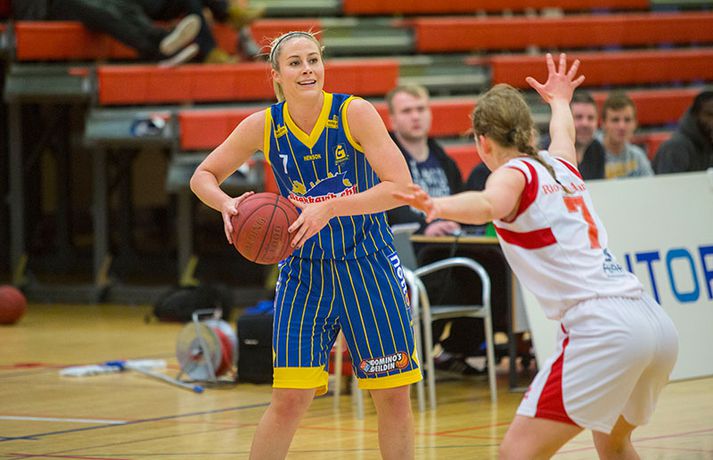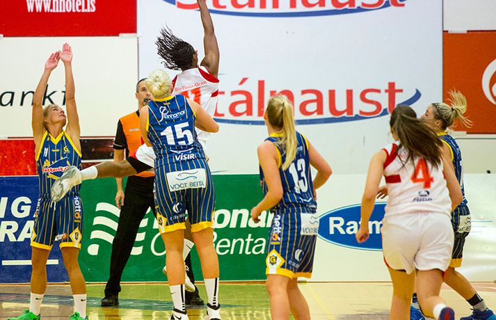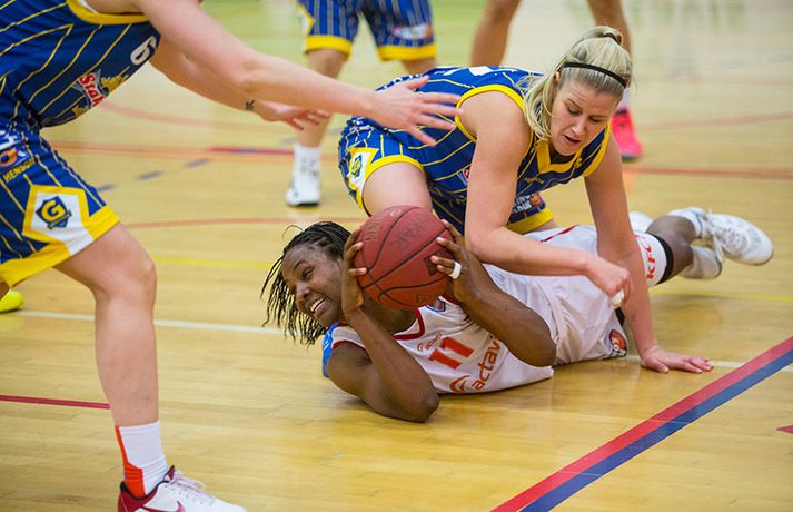Haukastúlkur tryggðu sér 3. sætið í Dominos-deild kvenna með, 86-68, sigri á Grindavík í kvöld. Heimastúlkur voru sterkari aðilinn allan leikinn og Grindavík komst lítið áfram. Frábær vörn og hraðar sóknir skiluðu þessum tveimur punktum í hús fyrir Hauka. Lele Hardy átti mjög góðan leik fyrir þær rauðklæddu.Daníel Rúnarsson, ljósmyndari Vísis og Fréttablaðsins, var á Ásvöllum í kvöld og náði þessum myndum hér fyrir ofan. Haukastúlkur byrjuðu leikinn af krafti og með góðri vörn og hröðum sóknum náðu þær forystu snemma í leiknum. Grindvíkingar voru lengi að byrja og voru alveg út á þekju í vörninni fyrsta korterið. Eftir fyrsta leikhluta voru þær rauðklæddu komnar með átta stiga forskot. Lele Hardy var gestunum erfið og bar hún sóknaleik Hauka uppi á löngum köflum. Ef Lele skoraði ekki spilaði hún samherja sína uppi sem voru að hitta vel. Haukastúlkur spiluðu vel fyrstu 20 mínúturnar og Grindavík elti allan tíman. Staðan í hálfleik var, 44-36 og Haukar með átta stiga forystu. Heimastúlkur héldu uppteknum hætti í síðari hálfleik og bættu við forskot sitt hægt en örugglega. Lele Hardy spilaði áfram frábærlega. Hún tók hvert frákastið niður eftir öðru og átti margar flottar stoðsendingar. Leiðindaratvik átti sér stað á 28. mínútu þegar að Pálína Gunnlaugsdóttir, lykilmaður Grindavíkur, féll í gólfið og hélt um hnéð. Pálína rak upp mikil óhljóð og augljóst að meiðslin voru alvarleg. Hún var borin út á börum til frekari aðhlynningar. Sjúkraþjálfari Grindavíkur sagði að þetta væri alvarlegt en þó ekki slitin krossbönd. Pálína var búin að vera þeirra besti leikmaður til þessa og útlitið því svart. Haukar héldu áfram að spila öfluga vörn og sóttu stíft í bakið á gestunum. Lengra komust Grindvíkingar ekki í leiknum og Haukar sigruðu því sanngjarnan 18 stiga sigur og komust þar með í 3. sæti í deildinni. Eins og fyrr segir var Lele Hardy frábær fyrir heimaliðið og skoraði 31 stig og tók 21 fráköst. Margrét Rósa Hálfdánardóttir átti sömuleiðis flottan leik fyrir Hauka og skoraði 14 stig. Hjá Grindavík var Palína stigahæst með 15 stig þrátt fyrir að fara meidd af velli á 28. mínútu.Bjarni: Vorum að fá framlag frá mörgum leikmönnum „Ég er mjög ánægður hvernig við komum inn í leikinn. Það var góður andi í þessu hjá okkur allan tímann,“ sagði Bjarni Magnússon, þjálfari Hauka eftir leikinn. „Svona á heildina að þá er ég mjög ánægður með þennan leik.“ „Það sem við lögðum upp með varnarlega gekk upp. Eina sem má gagnrýna í okkar leik er að við fáum á okkur í þrígang slæman kafla í lok leikhlutans. Þær taka þrisvar sinnum 9 stig í röð á okkur,“ sagði Bjarni en bætti við: „ Við vorum öflug í fráköstum. Við tókum yfir 50 fráköst og vorum með tæplega 30 stoðsendingar í leiknum. Þar erum við að bæta boltaflæðið hjá okkur frá því síðasta leik. Við vorum að fá aukasendingar og framlag frá mörgum leikmönnum. Þannig að þetta var góður dagur hjá okkur og því ber að fagna,“ sagði Bjarni. Lele Hardy var frábær í leiknum í kvöld. Er hún besti leikmaður deildarinnar að þínu mati? „Já, hún er besti leikmaðurinn í deildinni og ég held að það mótmæli því engin. Hún er með 9 stolna bolta, sjö stoðsendingar og yfir 20 fráköst hérna í kvöld. Lele er ótrúlegur leikmaður inn á vellinum jafnt sem utan hans og hefur smollið vel inn þetta lið já okkur,“ sagði Bjarni að lokum.Haukar-Grindavík 86-68 (25-17, 19-19, 21-16, 21-16)Haukar: Lele Hardy 31/20 fráköst/6 stoðsendingar/9 stolnir, Margrét Rósa Hálfdanardóttir 14/7 fráköst, Dagbjört Samúelsdóttir 13, Íris Sverrisdóttir 9, Jóhanna Björk Sveinsdóttir 7/4 fráköst, Gunnhildur Gunnarsdóttir 7/5 fráköst/5 stoðsendingar, Auður Íris Ólafsdóttir 3/5 fráköst/5 stoðsendingar, Lovísa Björt Henningsdóttir 2/4 fráköst.Grindavík: Pálína Gunnlaugsdóttir 15/4 fráköst, Jóhanna Rún Styrmisdóttir 10/10 fráköst, María Ben Erlingsdóttir 9/5 fráköst, Lauren Oosdyke 9/4 fráköst, Marín Rós Karlsdóttir 8, Katrín Ösp Eyberg 5, Helga Rut Hallgrímsdóttir 5/7 fráköst, Jeanne Lois Figeroa Sicat 4, Ingibjörg Jakobsdóttir 3.Leiklýsing: Haukar - GrindavíkLeik lokið () : Haular klára þennan leik. Þær voru heilt yfir sterkara liðið á öllum sviðum. Frábær vörn og hraðar skyndisóknir skiluðu þessu tveimur punktum í hús.38. mínúta (84-68) : Íris Sverrisdóttir er að hitta vel fyrir heimastúlkur sem líta út fyrir að vera sigla þessum sigri í höfn36. mínúta (82-63) : Haukar bæta í hægt en örugglega. Grindavík er sem fyrr ekki að finna sig sóknalega og þá eru þær alltof seinar tilbaka þegar Haukar sækja hratt á þær.34. mínúta (76-56) : Virkilega góður kafli hjá heimastúlkum. Gengur lítið sem ekkert hjá gestunum og Haukar ganga á lagið. Lele rífur niður frákast og skorar.32. mínúta (75-54) : Jóhanna Björk Sverrisdóttir með flottan þrist fyrir Hauka. Lele stelur svo boltanum og er eldsnögg fram og skorar.Þriðja leikhluta lokið (65-52) : Grindavík með ágætis loka kafla og minnka muninn fyrir síðasta leikhlutann. Unnu niður sjö stig á síðustu tveimur mínútunum.28. mínúta (65-43) : Grindvíkingar eru farnir að pirra sig á dómaranum ofan á allt annað. Lele Hardy hirðir hvert frákastið á eftir öðru og er að spila algjöran stjörnuleik. Pálína Gunnlaugsdóttir liggur kvalin á vellinum. Þvílík óhljóð. Hún hlýtur að hafa slitið krossbönd þar sem hún heldur um hnéið á sér. 26. mínúta (60-41) : Haukar eru að stinga af. Gengur ekkert hjá Grindavík og þjálfari liðsins er brjálaður á hliðarlínunni.24. mínúta (55-41) : Haukastúlkur með góðan kafla o