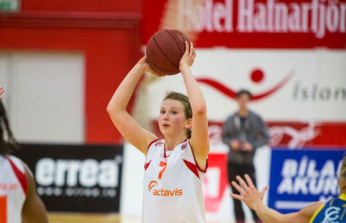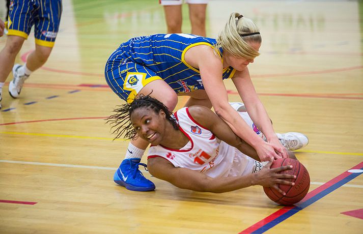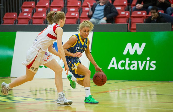 Umfjöllun, viðtöl og myndir: Haukar - Grindavík 86-68 | Haukastúlkur upp í 3. sæti Sigmar Sigfússon á Ásvöllum skrifar 20. nóvember 2013 18:30 Mynd/Daníel Haukastúlkur tryggðu sér 3. sætið í Dominos-deild kvenna með, 86-68, sigri á Grindavík í kvöld. Heimastúlkur voru sterkari aðilinn allan leikinn og Grindavík komst lítið áfram. Frábær vörn og hraðar sóknir skiluðu þessum tveimur punktum í hús fyrir Hauka. Lele Hardy átti mjög góðan leik fyrir þær rauðklæddu.Daníel Rúnarsson, ljósmyndari Vísis og Fréttablaðsins, var á Ásvöllum í kvöld og náði þessum myndum hér fyrir ofan. Haukastúlkur byrjuðu leikinn af krafti og með góðri vörn og hröðum sóknum náðu þær forystu snemma í leiknum. Grindvíkingar voru lengi að byrja og voru alveg út á þekju í vörninni fyrsta korterið. Eftir fyrsta leikhluta voru þær rauðklæddu komnar með átta stiga forskot. Lele Hardy var gestunum erfið og bar hún sóknaleik Hauka uppi á löngum köflum. Ef Lele skoraði ekki spilaði hún samherja sína uppi sem voru að hitta vel. Haukastúlkur spiluðu vel fyrstu 20 mínúturnar og Grindavík elti allan tíman. Staðan í hálfleik var, 44-36 og Haukar með átta stiga forystu. Heimastúlkur héldu uppteknum hætti í síðari hálfleik og bættu við forskot sitt hægt en örugglega. Lele Hardy spilaði áfram frábærlega. Hún tók hvert frákastið niður eftir öðru og átti margar flottar stoðsendingar. Leiðindaratvik átti sér stað á 28. mínútu þegar að Pálína Gunnlaugsdóttir, lykilmaður Grindavíkur, féll í gólfið og hélt um hnéð. Pálína rak upp mikil óhljóð og augljóst að meiðslin voru alvarleg. Hún var borin út á börum til frekari aðhlynningar. Sjúkraþjálfari Grindavíkur sagði að þetta væri alvarlegt en þó ekki slitin krossbönd. Pálína var búin að vera þeirra besti leikmaður til þessa og útlitið því svart. Haukar héldu áfram að spila öfluga vörn og sóttu stíft í bakið á gestunum. Lengra komust Grindvíkingar ekki í leiknum og Haukar sigruðu því sanngjarnan 18 stiga sigur og komust þar með í 3. sæti í deildinni. Eins og fyrr segir var Lele Hardy frábær fyrir heimaliðið og skoraði 31 stig og tók 21 fráköst. Margrét Rósa Hálfdánardóttir átti sömuleiðis flottan leik fyrir Hauka og skoraði 14 stig. Hjá Grindavík var Palína stigahæst með 15 stig þrátt fyrir að fara meidd af velli á 28. mínútu.Bjarni: Vorum að fá framlag frá mörgum leikmönnum „Ég er mjög ánægður hvernig við komum inn í leikinn. Það var góður andi í þessu hjá okkur allan tímann,“ sagði Bjarni Magnússon, þjálfari Hauka eftir leikinn. „Svona á heildina að þá er ég mjög ánægður með þennan leik.“ „Það sem við lögðum upp með varnarlega gekk upp. Eina sem má gagnrýna í okkar leik er að við fáum á okkur í þrígang slæman kafla í lok leikhlutans. Þær taka þrisvar sinnum 9 stig í röð á okkur,“ sagði Bjarni en bætti við: „ Við vorum öflug í fráköstum. Við tókum yfir 50 fráköst og vorum með tæplega 30 stoðsendingar í leiknum. Þar erum við að bæta boltaflæðið hjá okkur frá því síðasta leik. Við vorum að fá aukasendingar og framlag frá mörgum leikmönnum. Þannig að þetta var góður dagur hjá okkur og því ber að fagna,“ sagði Bjarni. Lele Hardy var frábær í leiknum í kvöld. Er hún besti leikmaður deildarinnar að þínu mati? „Já, hún er besti leikmaðurinn í deildinni og ég held að það mótmæli því engin. Hún er með 9 stolna bolta, sjö stoðsendingar og yfir 20 fráköst hérna í kvöld. Lele er ótrúlegur leikmaður inn á vellinum jafnt sem utan hans og hefur smollið vel inn þetta lið já okkur,“ sagði Bjarni að lokum.Haukar-Grindavík 86-68 (25-17, 19-19, 21-16, 21-16)Haukar: Lele Hardy 31/20 fráköst/6 stoðsendingar/9 stolnir, Margrét Rósa Hálfdanardóttir 14/7 fráköst, Dagbjört Samúelsdóttir 13, Íris Sverrisdóttir 9, Jóhanna Björk Sveinsdóttir 7/4 fráköst, Gunnhildur Gunnarsdóttir 7/5 fráköst/5 stoðsendingar, Auður Íris Ólafsdóttir 3/5 fráköst/5 stoðsendingar, Lovísa Björt Henningsdóttir 2/4 fráköst.Grindavík: Pálína Gunnlaugsdóttir 15/4 fráköst, Jóhanna Rún Styrmisdóttir 10/10 fráköst, María Ben Erlingsdóttir 9/5 fráköst, Lauren Oosdyke 9/4 fráköst, Marín Rós Karlsdóttir 8, Katrín Ösp Eyberg 5, Helga Rut Hallgrímsdóttir 5/7 fráköst, Jeanne Lois Figeroa Sicat 4, Ingibjörg Jakobsdóttir 3.Leiklýsing: Haukar - GrindavíkLeik lokið () : Haular klára þennan leik. Þær voru heilt yfir sterkara liðið á öllum sviðum. Frábær vörn og hraðar skyndisóknir skiluðu þessu tveimur punktum í hús.38. mínúta (84-68) : Íris Sverrisdóttir er að hitta vel fyrir heimastúlkur sem líta út fyrir að vera sigla þessum sigri í höfn36. mínúta (82-63) : Haukar bæta í hægt en örugglega. Grindavík er sem fyrr ekki að finna sig sóknalega og þá eru þær alltof seinar tilbaka þegar Haukar sækja hratt á þær.34. mínúta (76-56) : Virkilega góður kafli hjá heimastúlkum. Gengur lítið sem ekkert hjá gestunum og Haukar ganga á lagið. Lele rífur niður frákast og skorar.32. mínúta (75-54) : Jóhanna Björk Sverrisdóttir með flottan þrist fyrir Hauka. Lele stelur svo boltanum og er eldsnögg fram og skorar.Þriðja leikhluta lokið (65-52) : Grindavík með ágætis loka kafla og minnka muninn fyrir síðasta leikhlutann. Unnu niður sjö stig á síðustu tveimur mínútunum.28. mínúta (65-43) : Grindvíkingar eru farnir að pirra sig á dómaranum ofan á allt annað. Lele Hardy hirðir hvert frákastið á eftir öðru og er að spila algjöran stjörnuleik. Pálína Gunnlaugsdóttir liggur kvalin á vellinum. Þvílík óhljóð. Hún hlýtur að hafa slitið krossbönd þar sem hún heldur um hnéið á sér. 26. mínúta (60-41) : Ha