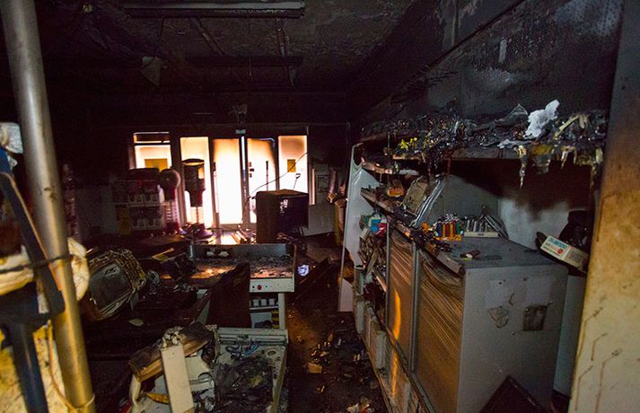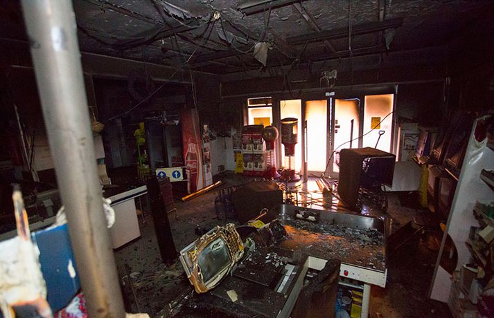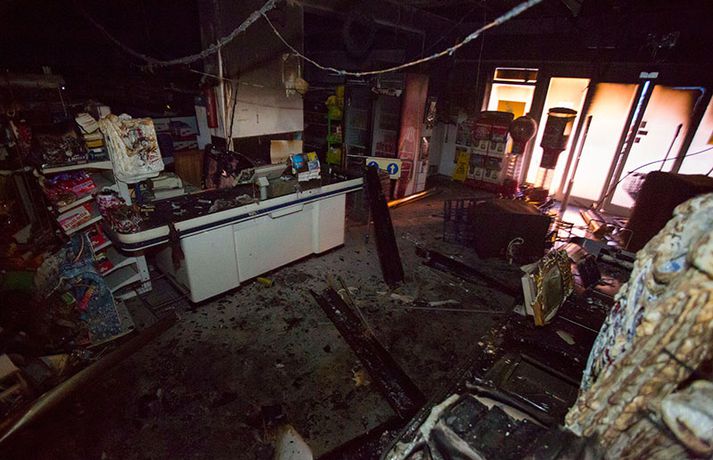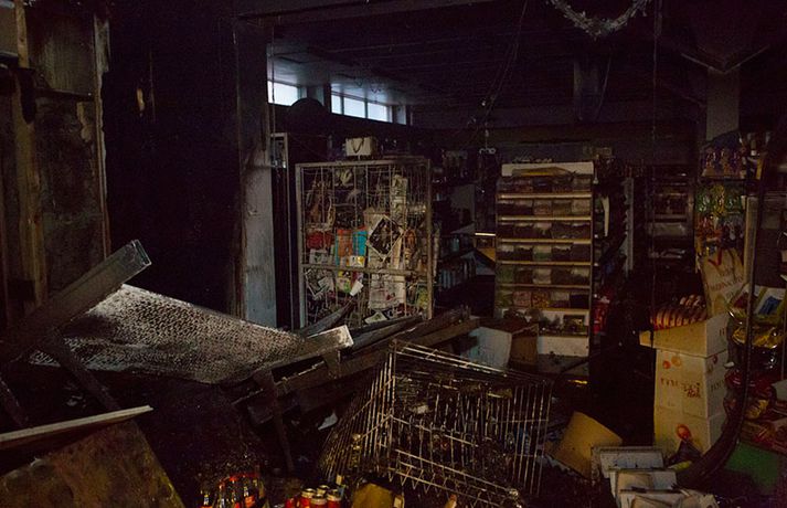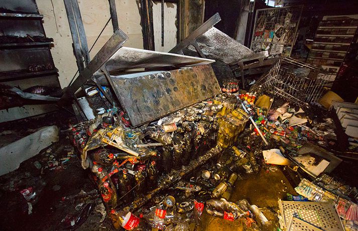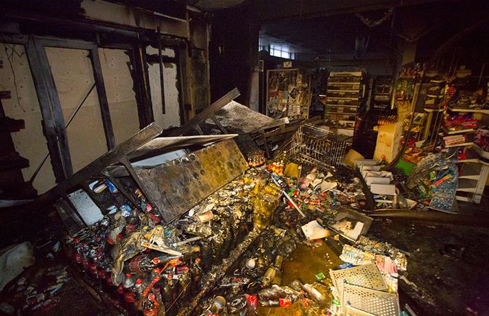 Bruninn sem gjöreyðilagði matvöruverslun í Breiðholtinu Stefán Árni Pálsson skrifar 9. desember 2013 13:04 Eigandinn náði ekki að bjarga neinu úr versluninni. myndir / daníel Rúnarsson Matvöruverslunin Mini-Market í Eddufellinu brann til kaldra kola í nótt og er verslunin gjörónýt. Piotr Jakuubek, eigandi verslunarinnar, hefur rekið Mini-Market undanfarin átta ár en nú er framhaldið í mikilli óvissu. Grunur er á að um íkveikju sé að ræða en lögreglan á höfuðborgarsvæðinu sér um rannsókn á málinu. Það er ljóst að Mini-Market verður ekki opnuð á ný næstu vikurnar en með fréttinni má sjá ótrúlegar myndir sem Daníel Rúnarsson, ljósmyndari 365, náði á vettvangi. Blaðamaður Vísis ræddi einnig við Piotr í morgun um brunann og framhaldið en viðtalið má sjá í heild sinni hér. Mest lesið Vanhelgunin ýmist skemmdarverk eða persónuleg árás Innlent Árið gert upp í Kryddsíld 2025 Innlent „Margir sem því miður eru ekki jafn heppnir og ég“ Innlent Segir myndbandsupptöku af því þegar skórnir voru teknir Innlent Tveir með alvarlega áverka eftir hnífstunguárás Innlent Dótturdóttir JFK er látin Erlent Grunaður um stórfellda líkamsárás og frelsissviptingu Innlent Kamilla Bretadrottning greinir frá kynferðisofbeldi Erlent Enn fleirum sagt upp hjá Árvakri Innlent Hafþór Freyr maður ársins að mati lesenda Vísis og hlustenda Bylgjunnar Innlent Fleiri fréttir Eitthvað í íslensku samfélagi fjandsamlegt börnunum okkar Simmi vinsælasti leynigesturinn „Þetta er Íslandsmet, Íslandsmet í svikum“ Tal um Ingu eftir kosningar ekki til sóma Gummi lögga er maður ársins 2025 Árangur breyti ekki alltaf upplifun fólks „Viðreisn jafnvel erfiðari viðfangs en Flokkur fólksins“ Vara við hættu á sinubruna Haldlögðu metmagn af fíkniefnum á árinu Vanhelgunin ýmist skemmdarverk eða persónuleg árás Árið gert upp í Kryddsíld 2025 Hafþór Freyr maður ársins að mati lesenda Vísis og hlustenda Bylgjunnar Segir myndbandsupptöku af því þegar skórnir voru teknir Tveir með alvarlega áverka eftir hnífstunguárás Vonast til að rafmagn verði komið á seinni partinn Rúmur helmingur bjartsýnn fyrir 2026 Grunaður um stórfellda líkamsárás og frelsissviptingu „Við bara svolítið sitjum uppi með þetta“ Börn niður í leikskólaaldur um helmingur þeirra sem slasast „Margir sem því miður eru ekki jafn heppnir og ég“ Sátt við fyrsta árið og taka stöðuna vegna forfalla ráðherra á næstu dögum Tíu létust í umferðinni á árinu og alvarlegustu slysunum fækkar ekki Árangur aðgerða ekki staðist væntingar almennings Enn fleirum sagt upp hjá Árvakri Ríkisstjórnin sek um ósanngjarna mismunun Vonbrigði í menntamálum og áramótasprengja Hafa áhyggjur af frelsissviptingu barna í brottfararstöð Kristrún ræðir við Pétur um borgarstjórnarframboð Níu ráðherrar funda með Höllu Söfnun fyrir Kjartan gengur vel Sjá meira