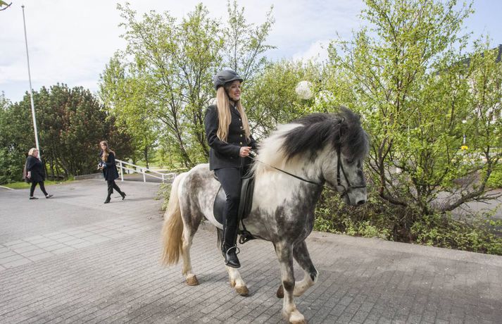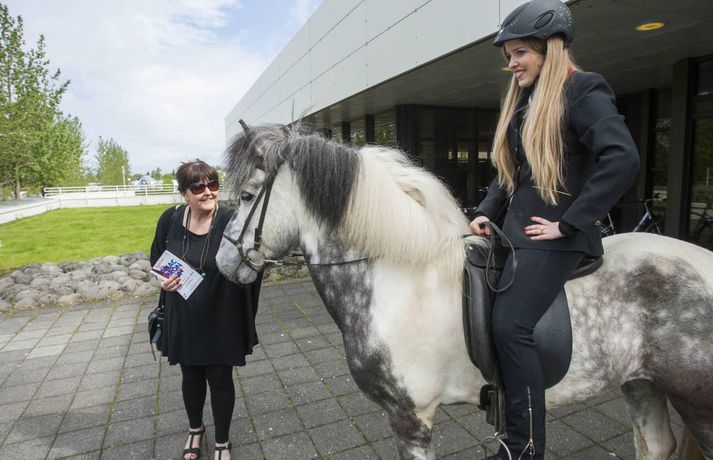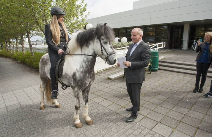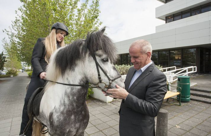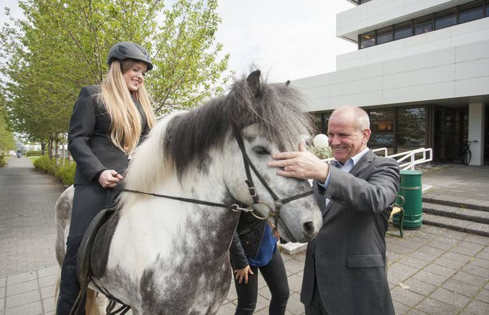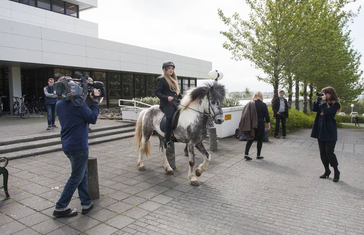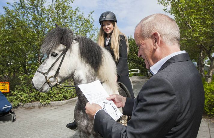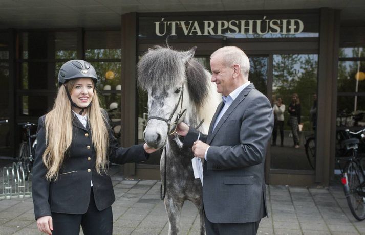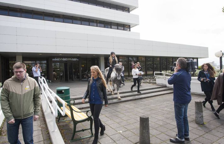 Hestur sagði upp áskrift að RÚV 14. júní 2013 13:49 „Hann var bara ánægður með þetta og sagði meðal annars að hesturinn væri fallegur," segir Áslaug Arna Sigurbjörnsdóttir, formaður Heimdallar, sem kom ríðandi í höfuðstöðvar Ríkisútvarpsins í dag og afhenti Páli Magnússyni útvarpsstjóra uppsagnarbréf fyrir hönd stóðhestsins Tóns frá Austurkoti. „Þetta var sem sagt uppsagnarbréf af útvarpi og sjónvarpi ríkisins. Stóðhesturinn er skilgreindur sem eignarhlutafélag og greiðir nefskatt, en hann getur eðli málsins samkvæmt ekki nýtt sér áskriftina," segir Áslaug Arna. Þá sendi félagið einnig bréf á Illuga Gunnarsson menntamálaráðherra þar sem skorað er á hann að afnema nefskattinn.Bréfið sem Páli var afhentÍ tilkynningu frá Heimdalli segir að félagið telji að íslenska ríkið eigi ekki að standa fyrir rekstri fjölmiðils, hvort sem um er að ræða ljósvakamiðil eða prentmiðil. „Ætli ríkið sér á annað borð þó að reka fjölmiðil væri nær að slík stofnun verði sett á fjárlög. Þannig væri stofnunin í samkeppni við aðrar ríkisstofnanir og hægt að huga að auknu aðhaldi hjá Ríkisútvarpinu. Það er fráleitt að skattgreiðendur og fyrirtæki séu þvinguð til að halda uppi Ríkisútvarpinu með sérstökum skatti og njóti þannig sérstöðu í tekjuöflun umfram aðrar ríkisstofnanir eins og t.d. Landspítalann,“ segir í tilkynningunni.Páll Magnússon les uppsagnarbréfið í Ofanleitinu í dag.Mynd/Anton Brink Mest lesið Gengst ekki við falsfréttum en viðurkennir að tímasetningar séu misvísandi Innlent Beitir sér ekki fyrir sveigjanlegri tilhögun fæðingarorlofs Innlent Vill að allt verði gert til að ná bróður hans úr sprungunni Innlent ESB frystir rússneskar eignir ótímabundið Erlent Afrituðu viðkvæmar heilsufarsupplýsingar úr kerfinu Innlent Kallar eftir samtali: Ekki spurning hvort heldur hvenær næsta slys verður Innlent Bergþór með brjósklos og blæs á slúður Innlent „Þessar fréttir ollu mér og fleirum vanlíðan“ Innlent Einn fluttur á slysadeild vegna brunans Innlent Svandís stígur til hliðar Innlent Fleiri fréttir Beitir sér ekki fyrir sveigjanlegri tilhögun fæðingarorlofs Afrituðu viðkvæmar heilsufarsupplýsingar úr kerfinu Kallar eftir samtali: Ekki spurning hvort heldur hvenær næsta slys verður Vill að allt verði gert til að ná bróður hans úr sprungunni Einn fluttur á slysadeild vegna brunans Vill finna bróður sinn „Þessar fréttir ollu mér og fleirum vanlíðan“ Bergþór með brjósklos og blæs á slúður Virkjunarleyfi Hvammsvirkjunar endurnýjað Svandís stígur til hliðar Flugvél á leið til Egilsstaða snúið við yfir Hallormsstað Gengst ekki við falsfréttum en viðurkennir að tímasetningar séu misvísandi Sigmundur Davíð og Kemi Badenoch meðal gesta í boði Meloni Keyptu ekki skýringar um neyðarvörn í Mjóddinni Bakkaði á ofsahraða með lyfjakokteil í blóðinu Laufey Rún hætt störfum hjá Miðflokknum Sanna býður sig fram undir merkjum Vors til vinstri Styggur svanur í sundi handsamaður og skilað í næstu tjörn Viðreisn stundi hræðsluáróður í stað þess að ræða málin Inflúensan á uppleið og seinni bylgjan handan við hornið Flensan á flugi og Sundlaugarmenningunni fagnað í Vesturbæjarlauginni Játaði en áfrýjaði samt og krafðist sýknu Páll Winkel meðal umsækjenda um embætti ráðuneytisstjóra Vilja takmarka fjölda barna sem getin eru með sama sæði Fjöldi svæða á landinu sambandslaus með öllu Fjölskyldur fórnarlamba krefjast ábyrgðar Sádi-Arabíu Staðsetning Íslands „hernaðarlega mjög mikilvæg“ Fjögur ár fyrir smygl á rúmum fjórum kílóum af kókaíni 325 milljónir í næsta áfanga LED-ljósavæðingar í Reykjavík Krafa um fjöldabrottvísanir fólks nemur land á Íslandi Sjá meira