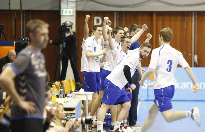 Stjarnan gerði sér lítið fyrir og sigraði Akureyri 26-24 í seinni undanúrslitaleik Síma bikars karla í handbolta í kvöld. Stjarnan mætir því ÍR í úrslitum á sunnudaginn. Stjarnan mætti mjög ákveðin til leiks og byrjaði mun betur. Liðið skoraði sex mörk gegn þremur á 12 fyrstu mínútum leiksins en þá vaknaði Akureyri til lífsins. Stjarnan skoraði aðeins eitt mark næstu tíu mínútur leiksins og jafnaði Akureyri metin í 7-7. Varnarleikur Akureyri fram til hálfleiks var mjög góður og Kukobat varði vel í markinu. Með það að vopni náði Akureyri tveggja marka forystu fyrir hálfleik 12-10. Stjarnan hóf seinni hálfleik eins og leikinn sjálfann, af krafti. Liðið lék góða vörn og Svavar Már Ólafsson fór á kostum í markinu. Hægt og rólega náði Stjarnan frumkvæðinu í leiknum og þegar hálfleikurinn var hálfnaður var munurinn kominn í þrjú mörk 20-17 Stjörnunni í vil. Stjarnan hélt áfram og komst mest fimm mörkum yfir 23-18 þegar níu mínútur voru eftir. Egill Magnússon, 17 ára strákur, fór á kostum á þessum tíma. Hann skoraði tvö mörk og átti tvær stoðsendingar og réð Akureyri ekkert við hann. Bjarni Fritzson var eini leikmaður Akureyri með lífsmarki í leiknum og þá sérstaklega í seinni hálfleik. Bjarni var frábær í leiknum en það dugði ekki til að Akureyri næði að jafna leikinn. Akureyri náði að minnka muninn í eitt mark þegar mínúta var eftir en Stjarnan skoraði í síðustu sókn sinni og Akureyri varð að játa sig sigrað 26-24. 1. deildarlið komið í úrslit en Akureyri saknaði Bergvins Gíslasonar sárlega í leiknum þar sem það vantaði einhvern til að draga vagninn með Bjarna. Það skal ekkert tekið af Stjörnunni. Markaskor dreifðist vel á liðið og skiptust leikmenn liðsins á að stíga upp. Jakob Oktoson sem skoraði til að mynda tvö af þremur síðustu mörk Stjörnunnar í leiknum en hann hafði skorað eitt mark fram að því í leiknum. Gunnar Berg: Ætla ekki í leikinn á móti ÍR til að vinna„Það tekur kvöldið og morgundaginn til að jafna sig á þessu. Þetta var auðvitað bara undanúrslitaleikur, við unnum engan titil. Fyrir okkur var þetta stóra þrautin og allt annað er plús. Við erum komnir á stóra gólfið fyrir framan fullt af fólki," sagði Gunnar Berg Viktorsson sigurreifur í leikslok. „Þetta býr í þessum strákum. Það var mikil gleði í þessu hjá okkur. Þeir þurftu að vinna og það bjuggst allir við því á meðan við höfðum engu að tapa. Það var gleði allan tímann og menn fögnuðu upp í stúku. Áhorfendur voru frábærir allan tímann og það er svo gaman að Stjörnumönnunum. Þeir koma í úrslitaleikina. Ég kann að meta það og þeir ætlast til þess að við séum að spila um titla og séum í efstu deildina. Það væri gaman að fá þá í leikina á móti Þrótti en þetta er fínt," sagði Gunnar Berg sem sagði úrslit fyrri leiks kvöldsins þegar ÍR vann stóran sigur á Selfossi ekki hafa hjálpað liðinu mikið. „Við vissum að við þyrftum að halda hraðanum niðri. Selfoss keyrði hraðaupphlaup í lok fyrri hálfleik og það kom þeim í koll. Ég var rólegur og þegar við fengum boltann þá reyndum við að halda boltanum og halda honum sem lengst, þá skora þeir ekki," sagði Gunnar sem hældi innkomu Egils Magnússonar í seinni hálfleik. „Hann er rosalegt efni. Hann var stressaður í byrjun og missti boltann nokkrum sinnum en hann er með flottar hreyfingar og flott skot. Ég bjóst ekki við að hann yrði svona góður því hann er ekki nógu sterkur líkamlega ennþá en hann svo flottur á fótunum og með flott skot að þeir áttu ekki séns í hann. Það er mikill bolti í honum. „Svavar var líka góður og þá sérstaklega í seinni hálfleik, hann var frábær í seinni hálfleik. Það er þannig með þessa stráka að þeir eru ungir og þeir eiga upp og niður leiki og tímabil í leikjum og Svavar kom upp í seinni hálfleik og seinni hálfleikurinn kom mér rosalega á óvart. Við vorum góðir í fyrri hálfleik og ég bjóst ekki við að við myndum halda þetta út. Strákarnir sýndu í seinni hálfleik að það er mikið spunnið í þá," sagði Gunnar sem sagði lið sitt ekki eiga mikla möguleika gegn ÍR. „Þeir eru miklu betri en við en við munum gera okkar besta og koma með gleðina að vopni. Við erum sigurvegarar núna og það verður ekki tekið af okkur en svo sjáum við til með næsta leik. Ég ætla ekki að fara í leikinn á móti ÍR og ætla að vinna, það eru þeir sem ætla að gera það. Ég ætla að hafa gaman að leiknum og ná strákunum niður á jörðina," sagði Gunnar Berg að lokum. Heimir Örn: Eyðilögðum þessa bikarhelgi hjá körlunum„Þetta var aumingjaskapur. Bjarni var eini maðurinn með viti þarna inni á," sagði allt annað en sáttur Heimir Örn Árnason. „Kannski er þetta sálfræðilegt, að horfa á ÍR vinna og allir að tala um að við ættum að fara að panta okkur hótel og gista fram á sunnudag og svona kjaftæði. Menn voru greinilega ekki að höndla það," sagði Heimir sem var allt annað en ánægður með að Egill Magnússon á 17. ári hafi farið svona illa með hans lið eins gerðist á vendipunkti leiksins um miðbik seinni hálfleiks. „Ég hef aldrei séð annað eins. Hann labbaði framhjá allri vörninni. Þó hann sé stór þá er hann ekki sá sterkasti sem ég hef séð. Hann labbaði í gegn, einhver gaur sem ég hef aldrei séð áður. „Við erum því miður búnir að eyðileggja þessa bikarhelgi fyrir karla boltann. Þó þeir hafi tekið okkur í dag þá vorum við eins og beljur á vorin og spila eins og hálfvitar," sagði Heimir sem telur Stjörnuna ekki eiga mörguleika í ÍR. „Öxlin á Bergvin er handónýt og ég er eins og aumingi þarna inni á. Ég get ekki fintað einn einasta m