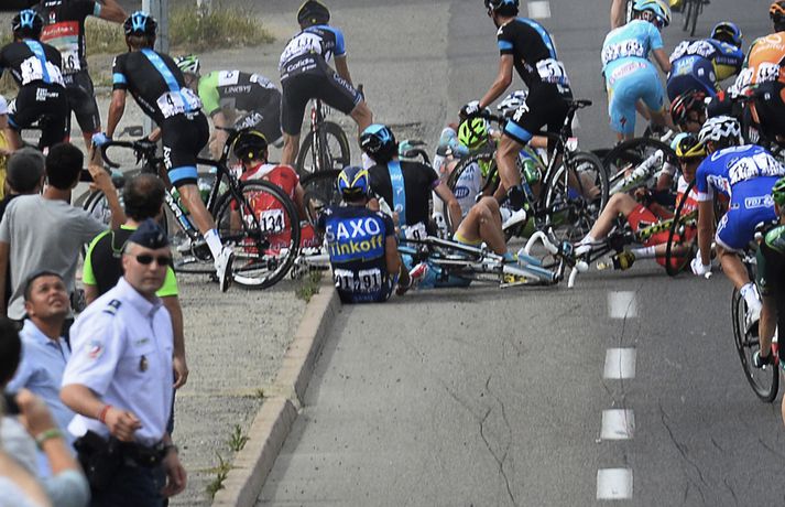 Ótrúleg uppákoma átti sér stað á fyrsta keppnisdegi Frakklandshjólreiðanna, Tour de France, í dag. Rúta eins keppnisliðsins festist við marklínuna skömmu áður en fyrstu hjólreiðakapparnir áttu að koma í mark. Þá voru góð ráð dýr en mótshaldarar ákváðu að færa marklínuna til um þrjá kílómetra. En svo var hætt við allt saman eftir að tókst að losa rútuna. En skömmu áður en keppendur komu í mark varð mikill árekstur og fjölmargir keppendur rákust saman. Englendingurinn Mark Cavendish sagði algjöra ringulreið hafa ríkt á keppnisstað. „Fyrst heyrðum við að marklínan hafði verið færð en því var svo aftur breytt. Sú breyting olli árekstrinum. Þetta var blóðbað.“ Vegna þessa fengu allir keppendur skráðan sama tíma eftir fyrsta keppnisdaginn en Þjóðverjinn Marcel Kittel fékk gulu treyjuna eftir að hafa komið fyrstur í mark.