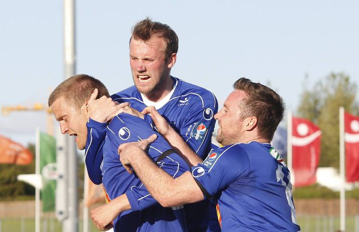 Umfjöllun, viðtöl og myndir: Stjarnan - FH 3-1 | FH úr leik í bikarnum Guðmundur Marinó Ingvarsson skrifar 20. júní 2013 13:31 Garðar fagnar einu marka sinna í kvöld. Mynd/valli Stjarnan er komið í átta liða úrslit Borgunar bikars karla eftir 3-1 sigur á FH á heimavelli í kvöld þar sem Garðar Jóhannsson skoraði þrennu. Staðan í hálfleik var 2-1 fyrir Stjörnuna. FH byrjaði leikinn betur og komst yfir þegar Björn Daníel Sverrisson skallaði boltann í netið á 8. mínútu. Leikurinn var bráð fjörugur og opinn og óðu liðin í færum framan af leik. Stjarnan náði þó betri tökum á miðjunni upp úr miðjum fyrri hálfleik og komst yfir þegar Garðar Jóhannsson skoraði tvö mörk á fjórum mínútum eftir rúmlega hálftíma leik. Stjarnan var mikið betri aðilinn í seinni hálfleik. Liðið óð í færum á sama tíma og sóknarlína FH missti taktinn og skapaði sér lítið sem ekkert. Þegar rétt innan við 20 mínútur voru eftir af leiknum braut Guðmann Þórisson af sér innan vítateigs og óð í Þórodd Hjaltalín í kjölfarið og fékk réttilega að líta sitt annað gula spjald. Halldór Orri Björnsson sem fékk vítið vippaði boltanum kæruleysislega í slána en Halldór Orri fékk nokkur góð færi í leiknum til að skora auk þess að búa til fjölmörg færi fyrir félaga sína. Öll sóknarlína Stjörnunnar lék frábærlega í leiknum vel studd af sterkri miðjunni og var vörnin traust er leið á leikinn. Það var þó Garðar Jóhannsson sem stal senunni þegar hann fullkomnaði þrennuna á 92. mínútu eftir góða sendingu Halldórs Orra. Stjarnan er því síðasta liðið til að tryggja sér sæti í átta liða úrslitum en bikardraumur FH er úti enn eitt árið. Heimir: Ef ég næ ekki til hópsins hef ég ekki mikið að gera hér lengur„Við byrjuðum þennan leik mjög vel og það gekk flest upp sem við vorum að gera. Við komumst í 1-0 og það voru ákveðnar forsendur fyrir því að gera góða hluti en svo einhverra hluta vegna þá hættum við því eftir 20 og eitthvað mínútur og þeir komast inn í leikinn og komast yfir. Í seinni hálfleik vorum við ekki nógu góðir og þeir komast áfram,“ sagði Heimir Guðjónsson þjálfari FH allt annað en sáttur við leik sinna manna og tók hann það allt á sig. „Það sem bregst í dag er að þjálfarinn stillti upp vitlausu liði með vitlausa leikaðferð og var ekki nógu klókur og þess vegna tapaði FH liðið þessum leik. Ég tek þetta tap algjörlega á mig. „Það sem var sett upp fyrir leikinn virkaði ekki enda töpum við leiknum. Uppstillingin á liðnu var ekki rétt og þá verður maður sem þjálfari að spyrja sig einhverra spurninga sem þjálfari liðsins ef maður tapar og þegar FH tapar. Líka í ljósi þess að FH hefur yfirleitt verið mjög agað og vel skipulagt lið og agaleysið sem var til staðar í dag á ekki að sjást hjá FH. „Ég gerði mistök með því að stilla þessu svona upp og ef ég er ekki að ná til hópsins þá hef ég ekki mikið að gera hér lengur. Ef þjálfarinn gerir mistök þarf hann að taka á sig líka,“ sagði Heimir sem var allt annað en sáttur við agaleysið sem Guðmann Þórisson sýndi þegar hann fékk að líta rauða spjaldið í stöðunni 2-1. „Það er agaleysi og ég er ósáttur við það hvernig hann brást við,“ sagði Heimir sem segir næstu skref vera æfingu á morgun. „Það byrjar undirbúningur fyrir Fylkisleik á mánudaginn. Við förum ekkert lengra nema vera jákvæðir en það eru vonbrigði að vera dottnir út úr bikarnum enn eitt árið. Það er ekki nógu gott fyrir klúbb eins og FH,“ sagði Heimir. Logi: Höldum spennu í þessu fyrir áhorfendur„Ég er virkilega ánægður með frammistöðu liðsins eftir að við gerum mistök í aukaspyrnu gegn okkur. Það er einn sem spilar Björn Daníel sennilega réttstæðan en að komast inn í leikinn og ná að sigra svona sannfærandi er mjög ánægjulegt,“ sagði Logi Ólafsson þjálfari Stjörnunnar eftir leikinn í kvöld. „Við vorum ekki góðir á miðjunni um miðbik fyrri hálfleiks, þá réðu þeir lögum og lofum en hvernig við vinnum okkur inn í leikinn og hvað við sköpum okkur mörg marktækifæri og skorum jú aðeins þrjú mörk en ef ekki hefði verið fyrir Róbert í markinu þá hefðu þetta verið mun stærra. „Við erum sáttir svo lengi sem við vinnum og höldum spennu í þessu. Áhorfendur voru frábærir og við þurfum að gera eitthvað fyrir þá eins og þeir gera fyrir okkur. „Við höfum vitað allan tímann að það myndi opnast fyrir Garðar. Þetta er eins og með rithöfundinn, stundum eru ritstíflur og það er sama með markaskorara,“ sagði Logi um þrennuna sem Garðar Jóhannsson skoraði. „Ég held að það sé ekki góð nálgun á þessa keppni að óska sér einhvers. Það er ekki á vísan að róa í þessari keppni en það væri voðalega gaman að fá heimaleik,“ sagði Logi aðspurður hvort Grótta væri óska mótherji í næstu umferð. Garðar: Okkar besta í sumar„Það var kominn tími á eitt að minnsta kosti. Ég var búinn að segja að þegar liðið þyrfti á marki að halda þá myndi ég skora og það var svoleiðis í dag,“ sagði Garðar Jóhannsson markaskorari Stjörnunnar í dag. „Við vorum mjög góðir í dag og sköpuðum okkur helling af færum. Ég hefði getað skoraði tvö til þrjú í viðbót. Hinir líka. Við klikkum á víti og vorum miklu betri en þeir í dag. „Það fer ekkert um okkur þegar við klikkum úr vítinu því við vorum svo miklu betri. Þeir voru ekki að skapa neitt og við vorum alltaf að skapa einhverja hættu. „Þetta var mun öruggara en tölurnar gefa til kynna eða það fannst mér.“ „Við spiluðum fínan bolta og börðumst vel. Við létum boltann ganga ágætlega og þegar við förum að fá f