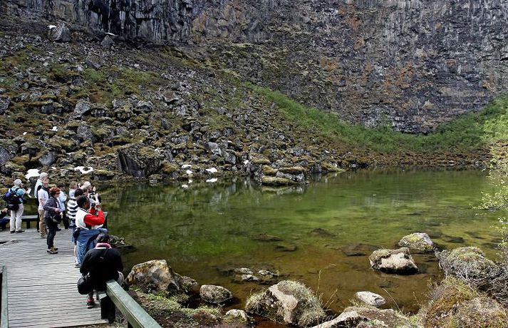 Vetur breyttist beint í sumar í Ásbyrgi Garðar Örn Úlfarsson skrifar 26. júlí 2013 06:45 Vatnið í Botnstjörn innst í Ásbyrgi er að mestu leyti lindarvatn. Þar synda silungar sem væntanlega eru afsprengi seiðasleppingar fyrri tíma. Töluvert af rauðhöfðaönd verpir við tjörnina og endurnar eru þar með unga sína. Fréttablaðið/Pjetur Aðsókn að Ásbyrgi í sumar hefur verið góð enda umhverfið fagurt og veðrið hefur leikið við Norðausturland. Hjörleifur Finnsson þjóðgarðsvörður segir hitann nærri of mikinn til að hægt sé að vinna. Pjetur Sigurðsson ljósmyndari heimsótti Ásbyrgi. „Við misstum eina árstíð. Það var bara vetur og svo kom sumar 1. júní,“ segir Hjörleifur Finnsson, þjóðgarðsvörður í Ásbyrgi. Hjörleifur segir júní hafa verið einstaklega veðurmildan og góðan fyrir ferðamennsku nema að því leyti að snjó hafi ekki tekið upp af öllum vegum fyrr en um 20. júní, miklu seinna en eðlilegt sé. „Júlí hefur líka verið góður. Það liggur við að það hafi verið of heitt til þess að vinna,“ segir Hjörleifur, sem segir aðsókn að þjóðgarðinum hafa verið mikla. „Það hafa margir komið á tjaldsvæðin og allt gengið vel fyrir sig,C segir Hjörleifur. Á meðfylgjandi myndum má meðal annars sjá Botnstjörn, sem er innst í Ásbyrgi. „Botnstjörn er paradís undir þessum klettum sem hamfaraflóðin sköpuðu á sínum tíma. Í raun er tjörnin gamall fosshylur,“ segir Hjörleifur Finnsson þjóðgarðsvörður. Við Botnstjörn eru rauðhöfðaendur og dálítið af silungi unir sér í vatninu. „Bleikjan sést oft vel,“ segir Hjörleifur. „Seiðum var líklega sleppt í tjörnina á sínum tíma en það er ekki alveg vitað,“ segir Hjörleifur, sem kveður fiskana alls ekki vera til veiða. „Enda eru þeir ekki margir og eru eins og gullfiskarnar okkar.Aðsókn að Ásbyrgi í sumar hefur verið góð enda umhverfið fagurt og veðrið hefur leikið við Norðausturland. Hjörleifur Finnsson þjóðgarðsvörður segir hitann nærri of mikinn til að hægt sé að vinna. Pjetur Sigurðsson ljósmyndari heimsótti Ásbyrgi. Mest lesið Samþykktu aldrei að Sanna fengi oddvitasætið Innlent Minnir á hvernig Hitler komst til valda Innlent Þjóðverjar yfirgefa Grænland Erlent Rúmlega tuttugu látnir eftir árekstur tveggja hraðlesta Erlent Önnur stúlka með móður sinni þegar Högni var klófestur Innlent Ræddi við Trump: „Hlakka til að sjá hann“ Erlent Boðar leiðtogaráðið á aukafund vegna hótana Trumps Erlent Sambandið aldrei verra: Ísland gæti bæst á listann Innlent Vilja beita „ofurvopni“ ESB gegn Bandaríkjunum Erlent Líkir kærunni við „faglega aftöku“ Innlent Fleiri fréttir Samþykktu aldrei að Sanna fengi oddvitasætið Minnir á hvernig Hitler komst til valda VG og Sanna sameina krafta sína Sala á grænlenskum á Íslandi nær tvöfaldast Ekkert athugavert við fundinn og stjórnin starfshæf Stjórnvöld „í blindflugi“ í menntamálum í rúman áratug Haldið upp á 80 ára afmæli Hveragerðis allt afmælisárið Sambandið aldrei verra: Ísland gæti bæst á listann Dæmi um að nemendur hafi aldrei mætt í leikfimi Grænlandstollar vonbrigði og verðbólga spillir kjarasamningum Stöðugleikasamningarnir gætu sprungið strax í haust Heimsmálin, Grænland, menntun og fjölmiðlun á Sprengisandi Karólína Helga skákaði sitjandi oddvita í Hafnarfirði Ísland standi með Grænlandi og Danmörku Vonar að skólarnir verði frjálsir frá símum í haust Álagning aldrei hærri: Eldsneytisverð hefði átt að lækka enn frekar Líkir kærunni við „faglega aftöku“ „Vegferð ákæruvaldsins til skammar“ Menntamálaráðherra tekur yfir hjúkrunarheimilin Fjögur handtekin á Akureyri grunuð um innbrot Viðvarandi óvissuástand bitni á langtímaáætlunum fyrirtækja Einn endaði á hliðinni og þrjú klemmdust á milli Var í símanum við neyðarlínuna þegar ekið var aftan á hann Ákvörðunin á ábyrgð stjórnenda Icelandair en ekki flugmanna „Hef hvergi hallað réttu máli“ Önnur stúlka með móður sinni þegar Högni var klófestur Fá þau að vera aftur á lista með Hildi? Fimm bíla árekstur á Reykjanesbraut og tveir fluttir á slysadeild Eigum eftir að sjá hvort Guðbrandur bæti upp fyrir hegðun sína Umfangsmikil lögregluaðgerð við Glerárgötu á Akureyri Sjá meira