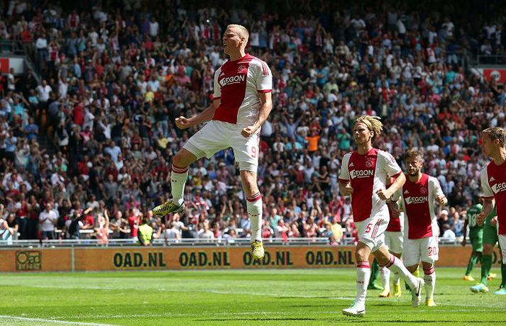 Kolbeinn Sigþórsson, Alfreð Finnbogason og Aron Jóhannsson voru allir á skotskónum um helgina og það stefnir í mikið markastríð á milli íslensku framherjanna í hollensku deildinni ef heldur áfram sem horfir. Kolbeinn og Aron fögnuðu einnig þremur stigum í húsi með liðum sínum Ajax og AZ Alkmaar en Alfreð og félagar í Heerenveen töpuðu sínum fyrsta leik í vetur. Alfreð og Aron hafa báðir skorað í öllum leikjum tímabilsins til þessa en Alfreð er nú markahæsti leikmaður hollensku deildarinnar með fjögur mörk í þremur umferðum. Aron hefur skorað eitt mark í öllum þremur leikjum AZ Alkmaar og hann skoraði einnig eitt mark í Meistarakeppninni og er því kominn með fjögur mörk í fjórum leikjum. Missir íslenska landsliðsins er því augljóslega mikill. Kolbeinn afgreiddi Feyenoord með tveimur mörkum í gær en þetta voru fyrstu deildarmörk hans á tímabilinu. Kolbeinn skoraði aftur á móti eitt mark í Meistarakeppninni og hefur því skorað þrjú mörk í fjórum leikjum á tímabilinu. Kolbeinn missti af fimm mánuðum af síðasta tímabili vegna meiðsla en skoraði sex mörk í síðustu níu leikjunum á tímabilinu og minnti síðan verulega á sig í gær. Kolbeinn hefur verið óheppinn með meiðsli fyrstu tímabilin sín með Ajax en hefur þegar fagnað tveimur meistaratitlum. Mörkin hans í gær þýða að hann hefur nú skorað fleiri deildarmörk fyrir Ajax (16) en hann gerði á sínum tíma fyrir AZ Alkmaar (15). Alfreð Finnbogason bætti markamet Péturs Péturssonar í hollensku úrvalsdeildinni í fyrra þegar hann skoraði 24 mörk í 31 leik fyrir Heerenveen. Aron Jóhannsson lýsti því yfir fyrir tímabilið að hann ætlaði að taka metið af Alfreð og miðað við þessa byrjun er honum greinilega full alvara. Á sama tíma er Alfreð að sýna okkur að hann ætlar að gera betur en í fyrra. Íslensku leikmennirnir hafa nú gert níu deildarmörk í fyrstu þremur umferðunum. Það eru rúmar 30 umferðir eftir með vonandi nóg af íslenskum mörkum. Íslensku mörkin urðu alls 38 talsins í hollensku deildinni á síðasta tímabili (Alfreð 24, Kolbeinn 7, Aron 3, Jóhann Berg 2 og Guðlaugur Victor 2) og gætu orðið mun fleiri á þessu tímabili.