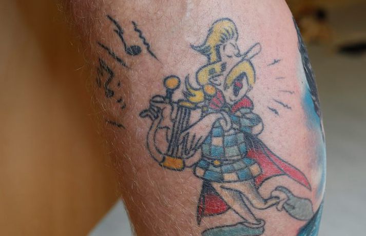 Skartar skemmtilegum húðflúrum Gunnar Leó Pálsson skrifar 19. september 2013 09:00 Ólafur Hrannar Kristjánsson skartar skemmtilegum flúrum. FRÉTTABLAÐIÐ/VALLI „Þetta var nú búið að blunda í mér í einhvern tíma en ég ákvað svo bara að kýla á þetta og pantaði tíma í janúar,“ segir hinn 23 ára gamli Ólafur Hrannar Kristjánsson, starfsmaður í Seljaskóla, um aðdraganda húðflúrs á kálfa hans af David Hasselhoff.Ólafur Hrannar skartar nokkrum af skemmtilegustu húðflúrum sem sést hafa á Íslandi. Á kálfanum er hann ekki eingöngu með mynd af bandarísku goðsögninni David Hasselhoff heldur einnig húðflúr af teiknimyndapersónunum Svampi Sveinssyni og Óðríki algaula úr teiknimyndaflokknum um Ástrík og Steinrík.„Þegar ég var í 9. til 10. bekk áttaði ég mig á því hversu mikill snillingur þessi maður er, sérstaklega þegar ég sá tónlistamyndbandið við lagið Jump In My Car,“ segir Ólafur Hrannar um álit sitt á sjarmörnum. Hann kveðst mikill áhugamaður um húðflúr. „Ég er með fimm önnur tattú, ég skoða síður og reyni að uppgötva nýja flúrara.“Hasselhoff-flúrið vakti mikla athygli á Icelandic Tattoo Expo-hátíðinni sem haldin var á Hótel Sögu síðustu helgi. „Gunnar á Íslensku húðflúrstofunni gerði þetta,“ bætir Ólafur Hrannar við en hann segir að fólk sé almennt mjög hrifið af þessu athyglisverða flúri, enda fjölmargir Hasselhoff-aðdáendur á Íslandi.Sætur Svampur.Óður Óðríkur.Heitur Hasselhoff. Mest lesið Viðskila í London eftir að hafa hent vegabréfinu í ruslið Ferðalög „Ég er mamman sem gat aldrei gefið honum það sem hann óskaði sér“ Lífið Segja Helenu fara með „hreinar rangfærslur“ Lífið Kristófer Acox og Guðrún Elísabet eiga von á barni Lífið Áttu að hitta Reiner-hjónin daginn örlagaríka Lífið Sannkölluð útsýnisperla með potti í Skerjafirði Lífið Helvítis jólapizzan slær í gegn á Eldofninum Lífið samstarf Þingmaður selur húsið Lífið Leynigesturinn hitti Heimi Karls beint í hjartastað Lífið Bestu myndir Robs Reiner Bíó og sjónvarp Fleiri fréttir Hreimur og Ólafur Darri perluvinir sem horfa á enska boltann saman „Ég er mamman sem gat aldrei gefið honum það sem hann óskaði sér“ Áttu að hitta Reiner-hjónin daginn örlagaríka Leynigesturinn hitti Heimi Karls beint í hjartastað Sannkölluð útsýnisperla með potti í Skerjafirði Kristófer Acox og Guðrún Elísabet eiga von á barni Reynihvammur 39 jólahús Kópavogsbæjar Þingmaður selur húsið Segja Helenu fara með „hreinar rangfærslur“ Skrifaði eftirréttasöguna: „Er hann geðbilaður?“ Palestínskir fánar leyfðir og óánægjuhróp áhorfenda ekki falin Féllu örmagna til jarðar eftir langa þriðju vakt „Þegar maður er með einhverjum sem elskar að borða, þá er svo gaman að elda“ Katie Melua með tónleika í Hörpu í júní Segir síðasta ár hafa verið strembið Snjókorn falla eins og þú hefur aldrei heyrt það Stjörnulífið: Skýrslutaka hjá lögreglu, æla og Æðis-legir endurfundir Ungfrú Ísland rýfur tengslin við Ungfrú Ísland Draumadís Þórhildar og Hjalta skírð Ískaldir IceGuys jólatónleikar Bríet ældi á miðjum tónleikum Hver mínúta tók heilan mánuð af vinnu Þátttökulöndin ekki færri síðan 2003 Fordæmir barnaskap „skáeygðra“ sannra Finna „Litlu aumingjarnir þurftu að fara heim að sofa“ „Góður vetrardagur hér er 23 gráður“ Prestarnir sem passa þau sem samfélagið afskrifar eða dæmir Eldsvoðinn í Reykjavík sem líkt var við náttúruhamfarir Ebba Katrín hlaut styrk úr Minningarsjóði Stefaníu Krakkatían: HúbbaBúbba, Eurovision og handbolti Sjá meira
