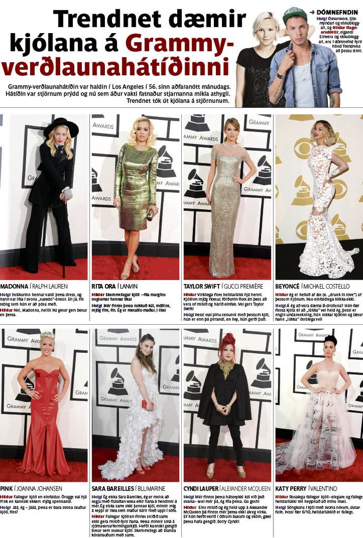 Trendnet dæmir kjólana á Grammy-verðlaunahátíðinni 28. janúar 2014 14:00 Mest lesið Íslendingar tjá sig um skaupið: „Versta skaup ever“ eða það besta í manna minnum? Lífið Opnar sig um augnlokaaðgerðina Lífið Króli og Birta eignuðust lítinn prins Lífið Þórdís Elva bað poppstjörnunnar Lífið Þetta fengu ráðherrarnir gefins Lífið Maður geti þurft að díla við „konu sem er á túr“ og í vondu skapi Lífið Þegar Bardot fór í „leyniferðalag“ til Íslands Lífið Móðurmorð í blóðugu jólaboði Gagnrýni Egill Ólafs og Gísli Marteinn sprækir á annan í jólum Menning Illugi Jökuls gómaði rottuunga eftir klukkutíma eltingaleik Lífið Fleiri fréttir Nýársbingó Blökastsins á rólegasta degi ársins Þórdís Elva bað poppstjörnunnar Króli og Birta eignuðust lítinn prins Íslendingar tjá sig um skaupið: „Versta skaup ever“ eða það besta í manna minnum? Opnar sig um augnlokaaðgerðina Blö byrjar árið á bingói Isiah Whitlock Jr. látinn Þetta fengu ráðherrarnir gefins Sautján ára Glúmur leigði bíl og leitaði Bardot á frönsku rivíerunni Illugi Jökuls gómaði rottuunga eftir klukkutíma eltingaleik Clooney orðinn franskur Þegar Bardot fór í „leyniferðalag“ til Íslands Idris Elba sleginn til riddara fyrir baráttu gegn hnífaburði Blysröð í anda þjóðhátíðar í stað brennu Von á barni með þeim nýja átta mánuðum eftir skilnaðinn Spurt var um fólkið sem var grátandi, ælandi og öskrandi Kryddsíld fagnar afmæli og öllum er boðið Melanie Watson er látin Telur notkun á lagi í Miðflokks-stuðningsmyndbandi siðlausa Stjörnulífið: „Ég get ekki frestað þessu lengur“ Heldur ótrauð áfram þrátt fyrir að ná ekki milljónamarkmiðinu Brigitte Bardot er látin Glódís Perla og Kristófer gengu í það heilaga Bæði sorg og gleði að ala upp fimm börn með sérþarfir Sjálfur jólasveinninn skotspónn samsæriskenninga Þakkar Trump í ólettutilkynningunni Íslenskur mágur Rex Heuermann efins um ódæði hans Vinsælustu myndböndin á Vísi á árinu Frægir fjölguðu sér árið 2025 Gítarleikari The Cure er látinn Sjá meira