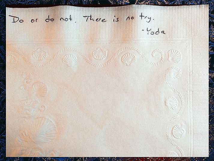 Garth Callaghan, 44 ára, hefur greinst með krabbamein þrisvar á síðustu tveimur árum. Hann er nú laus við meinið en líkurnar á að hann lifi næstu fimm árin eru samt sem áður aðeins átta prósent. Hann ætlar að sjá til þess að gefa dóttur sinni, Emmu, eins mikið af ráðleggingum og hægt er eftir dauðdaga sinn. Hann hefur skrifað orðsendingar á servíettur til dóttur sinnar síðan hún var lítil og laumað þeim í hádegisverðarboxið hennar. Hann ætlar að halda þessu áfram eftir dauðdaga sinn og ætlar að skrifa rúmlega átta hundruð orðsendingar sem ættu að duga þangað til Emma útskrifast úr miðskóla. Garth skrifar Emmu spakmæli frá fólki á borð við Eleanor Roosevelt, Gandhi, Nelson Mandela og Yoda. Þá skrifar hann einnig hjartnæm spakmæli eftir sjálfan sig á sumar servíettanna. Hægt er að fylgjast með þessu uppátæki Garths á vefsíðunni Because I Said I Would, á Facebook, Twitter og vefsíðunni Napkin Notes Dad.Hér er ein orðsendingin eftir meistara Yoda.