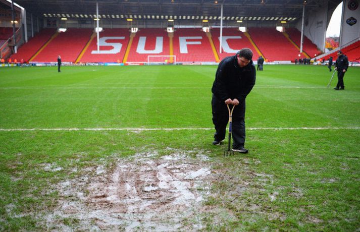 Jafntefli niðurstaðan í drullusvaðinu Kolbeinn Tumi Daðason skrifar 26. janúar 2014 12:20 Úr leiknum í dag. Vísir/Getty Sheffield United og Fulham þurfa að eigast aftur við í 4. umferð enska bikarsins í knattspyrnu eftir 1-1 jafntefli á Bramall Lane í dag. C-deildarliðið mætti vel stemmt til leiks á heimavelli sínum í dag en aðstæður voru fyrir neðan allar hellur. Ákvörðun var tekin í dag að leikurinn færi fram þrátt fyrir að mikið hefði rignt og leikmenn myndu eiga erfitt með að fóta sig. Sú varð raunin. Sheffield United komst yfir á 31. mínútu þegar Chris Porter skoraði af harðfylgi úr teignum eftir misheppnað skot liðsfélaga síns. Heimamenn leiddu í hálfleik. Gestirnir, sem áttu að fá vítaspyrnu í fyrri hálfleik, hresstust eftir hlé. Þeir fengu byr undir báða vængi þegar Íranum Michael Doyle var vikið af velli á 52. mínútu. Jöfnunarmarkið kom þó ekki fyrr en á 75. mínútu þegar Kólumbíumaðurinn Hugo Rodalleca skoraði. Gestirnir fengu nokkur góð færi til að tryggja sér sigurinn en voru klaufar í drullunni í vítateig heimamanna. Dregið verður í fimmtu umferð bikarsins síðar í dag. Enski boltinn Mest lesið Syrgja átján ára fimleikakonu Sport Hafnaði 34 milljónum: „Vil ekki styðja kerfi sem býr til fíkn og eyðileggur líf“ Sport Arnar Þór ráðinn til FIFA: „Himinlifandi að hafa fengið þetta starf“ Fótbolti Fyrsta mark Wirtz í þriðja sigrinum í röð Enski boltinn Írar ætli að fylgja eftir tillögu Heimis Fótbolti Watkins hélt ótrúlegri sigurgöngu Villa áfram Enski boltinn Arsenal aftur á toppinn Enski boltinn Gerir grín að klæðaburði liðsfélaga síns Körfubolti Salah sakaður um dýfu: „Getum ekki keppt við Egypta og dómarana“ Fótbolti Haukur náði hundrað og hundrað fyrir EM Handbolti Fleiri fréttir Liverpool-skotmarkið ekki á förum í janúar Aldrei spilað þarna en sagði strax já „Viss um að ég myndi skora einn daginn“ Watkins hélt ótrúlegri sigurgöngu Villa áfram Schade og Jiménez sendu Brentford og Fulham í efri hlutann Arsenal aftur á toppinn Fyrsta mark Wirtz í þriðja sigrinum í röð Cherki aðalmaðurinn í sigri City Úlfarnir heiðruðu minningu Jota Andri Lucas frá í mánuð Sjáðu dönsku þrumuna sem færði United-mönnum öll þrjú stigin Segir að Arsenal stefni á sögulega fernu á þessu tímabili Amorim endaði viðtalið á gamansömum nótum „Við eigum heima í Evrópu“ Daninn skaut Man. United upp fyrir Liverpool Amorim segir strákinn í frystinum vera framtíðin hjá Man. United Martinez með fyrirliðabandið og báðir Fletcher-bræðurnir á bekknum Havertz gæti snúið aftur á næstu dögum Alfons og Willum sáu tvö rauð spjöld fara á loft Synir Diogo Jota leiða leikmenn út á Anfield Cunha vill skemmta og Howe treystir leikmönnum United horfir til Þýskalands eftir höfnun Semenyo Haaland stóðst vigtun eftir jólin Hápunktarnir hingað til í enska boltanum Goðsögn fallin frá Kærður af knattspyrnusambandinu Bestu jólamörkin: Drogba, Scholes eða Giroud? Van de Ven bað Isak afsökunar: „Vildi ekki meiða hann“ Hvers vegna heillast stórliðin svo af Semenyo? Stewart, Snoop og Modric í eina sæng Sjá meira
