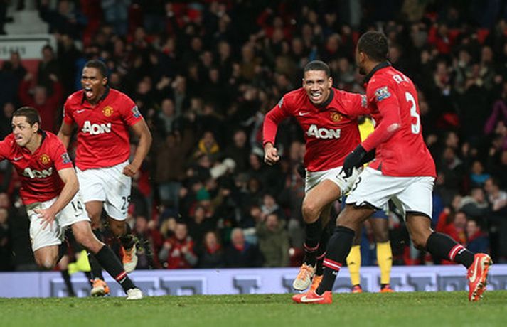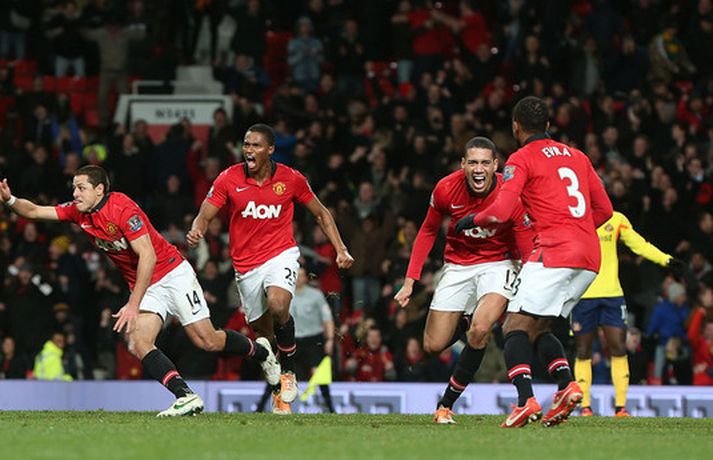 United úr leik eftir vítaspyrnukeppni | Myndir Kolbeinn Tumi Daðason skrifar 22. janúar 2014 20:36 Sir Alex Ferguson var á vellinum í kvöld og fór vafalítið sár og svekktur heim til sín. Vísir/Getty Manchester United skoraði aðeins úr einu víti þegar að Sunderland tryggði sér sæti í úrslitaleik ensku deildabikarkeppninnar með sigri á United í vítaspyrnukeppni. Það var mikil dramatík í leiknum, ekki síst undir lok leiksins. Jonny Evans hafði komið United yfir í venjulegum leiktíma en Sunderland vann fyrri leikinn, 2-1. Samanlögð úrslit voru því 2-2 og þurfti því að framlengja leikinn. Útivallarmarkið hefði hins vegar tryggt United sæti í úrslitaleiknum hefðu þetta orðið úrslit leiksins að framlengingunni lokinni. En þegar að Phil Bardsley skoraði jöfnunarmark Sunderland eftir hörmuleg mistök David de Gea í marki United á lokamínútu framlengingarinnar virtist öll von úti fyrir heimamenn.En þá kom Javier Hernandez til skjalanna og hann náði að skora mark aðeins mínútu síðar - þegar framlengingin var komin í uppbótartíma. Niðurstaðan því 2-1 sigur United og samanlögð úrslit 3-3. Því þurfti vítaspyrnukeppni til að knýja fram úrslit. Þar var aðeins skorað úr þremur spyrnum og var Vito Mannone, markvörður Sunderland, hetjan er hann varði frá Rafael úr fimmtu og síðustu spyrnu heimamanna. Niðurstaðan er því að Sunderland mætir Manchester City í úrslitaleik ensku deildabikarkeppninnar á Wembley í byrjun næsta mánaðar. Manchester United komst 1-0 yfir í fyrri hálfleik með marki Jonny Evans eftir undirbúning Danny Welbeck. Síðari hálfleikur var svo opinn og skemmtilegur en þrátt fyrir að United fengi betri færi var Sunderland ávallt líklegt til að jafna metin. Eftir markalausan síðari hálfleik var gripið til framlengingar.Lengi vel var lítið um opin færi í framlengingunni og hefði 1-0 sigur dugað United til að komast í úrslitaleikinn. En á lokamínútu venjulegs leiktíma skoraði Phil Bardsley, fyrrum leikmaður United, ótrúlegt mark fyrir Sunderland. David de Gea missti skot hans inn í eigið net og virtist Bardsley hafa tryggt sínum mönnum sigur. En leikurinn hélt áfram og náði Javier Hernandez að koma United yfir á nýjan leik með skoti af stuttu færi í slána og inn - og það í uppbótartíma síðari hálfleiks framlengingarinnar. Því þurfti vítaspyrnukeppni til að knýja fram úrslit. Enski boltinn Mest lesið Sviss - Ísland 38-38 | Strákarnir okkar stálu stigi eftir slakan leik Handbolti Hleraði leikhlé Norðmanna Handbolti Slóvenía - Króatía | Slóvenar geta gert Íslandi mikinn greiða Handbolti Dagur hengdi hrakspá handboltasérfræðings upp á króatíska hótelinu Handbolti Svona er staðan: Ekkert svigrúm hjá strákunum okkar Handbolti Gísli gagnrýnir fyrirkomulagið á EM Handbolti „Mjög svekkt og sár“ út í Skíðasamband Íslands Sport Erfitt fyrir Íslendinga að komast að: „Það er bara uppselt“ Handbolti Svona er staðan: Strákarnir okkar þurfa að treysta á sænskt eða króatískt tap Handbolti „Góðu hliðarnar eru helvíti góðar“ Handbolti Fleiri fréttir Sjáðu laglega afgreiðslu hins sjóðheita Barrys Sjóðheitur Dorgu frá í um tíu vikur Barry bjargaði stigi fyrir Everton Ekki gerst hjá Arsenal í átján ár Sjáðu draumamark Dorgu og öll hin í sigri United á Arsenal Varamaðurinn tryggði United sigur gegn Arsenal Aston Villa lifði af orrahríð fyrir norðan og náði Manchester City Hlín utan hóps er Lehmann kom að marki í fyrsta leik Estevao með mark og stoðsendingu gegn lánlausu Palace liði Sjáðu alla dramatíkina úr enska boltanum Van Dijk segir að það hafi „klárlega verið brotið á sér“ í sigurmarkinu „Sigurmark undir lokin er fullkomið fyrir okkur“ Liverpool-vandræðin halda áfram og Bournemouth með sigurmark í blálokin Stórbrotið sigurmark hjá Harry Wilson Haaland fékk smá hvíld í kærkomnum sigri City Hömruðu meðan járnið var heitt í sigri gegn Sunderland Sonur Wayne Rooney spilaði á Old Trafford Arsenal sagt vera að skoða kaup á Julián Álvarez í sumar Gæti farið frá Liverpool til Tottenham Íslenskir spéfuglar vöktu kátínu Spursara en reittu tvo til reiði Konaté syrgir föður sinn Van Dijk: Sýndi Slot vanvirðingu með þessari spurningu Alisha Lehmann verður nýr liðsfélagi Hlínar Þættir um Manchester United í anda „The Crown“ Leikmenn City endurgreiða stuðningsmönnum Óttast að Grealish verði lengi frá Xabi Alonso myndi segja nei við öllum núna nema Liverpool Bauð Paul Scholes heim til sín til að ræða málin Leikmaður Liverpool lenti í eltihrelli Vilja sjá þessa stjóra í brúna hjá United Sjá meira
