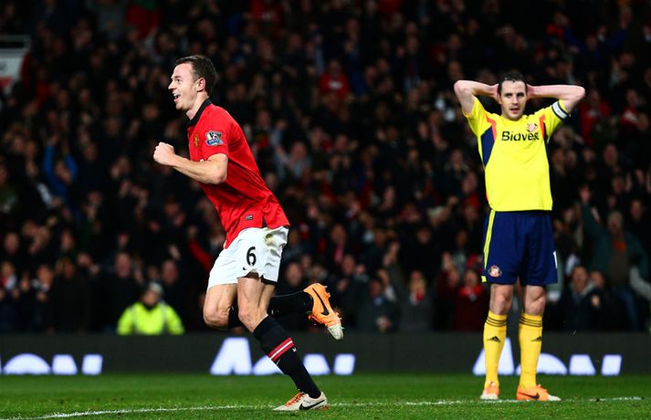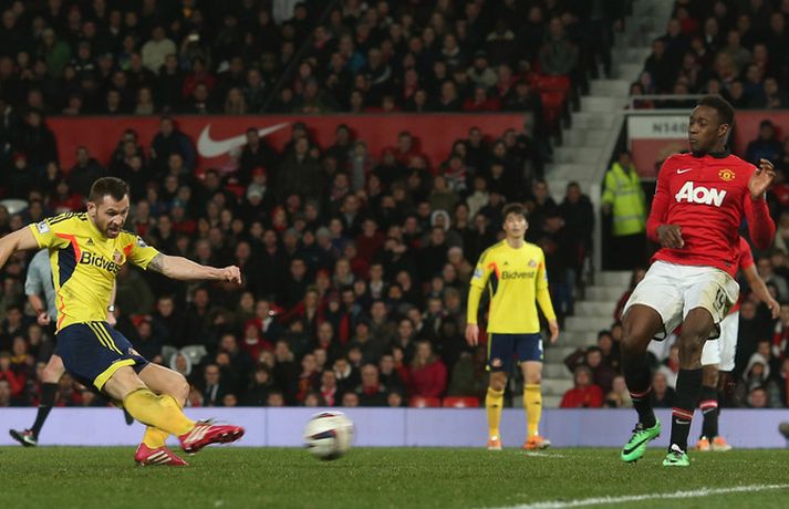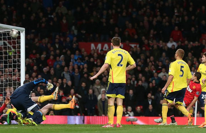 Manchester United skoraði aðeins úr einu víti þegar að Sunderland tryggði sér sæti í úrslitaleik ensku deildabikarkeppninnar með sigri á United í vítaspyrnukeppni. Það var mikil dramatík í leiknum, ekki síst undir lok leiksins. Jonny Evans hafði komið United yfir í venjulegum leiktíma en Sunderland vann fyrri leikinn, 2-1. Samanlögð úrslit voru því 2-2 og þurfti því að framlengja leikinn. Útivallarmarkið hefði hins vegar tryggt United sæti í úrslitaleiknum hefðu þetta orðið úrslit leiksins að framlengingunni lokinni. En þegar að Phil Bardsley skoraði jöfnunarmark Sunderland eftir hörmuleg mistök David de Gea í marki United á lokamínútu framlengingarinnar virtist öll von úti fyrir heimamenn.En þá kom Javier Hernandez til skjalanna og hann náði að skora mark aðeins mínútu síðar - þegar framlengingin var komin í uppbótartíma. Niðurstaðan því 2-1 sigur United og samanlögð úrslit 3-3. Því þurfti vítaspyrnukeppni til að knýja fram úrslit. Þar var aðeins skorað úr þremur spyrnum og var Vito Mannone, markvörður Sunderland, hetjan er hann varði frá Rafael úr fimmtu og síðustu spyrnu heimamanna. Niðurstaðan er því að Sunderland mætir Manchester City í úrslitaleik ensku deildabikarkeppninnar á Wembley í byrjun næsta mánaðar. Manchester United komst 1-0 yfir í fyrri hálfleik með marki Jonny Evans eftir undirbúning Danny Welbeck. Síðari hálfleikur var svo opinn og skemmtilegur en þrátt fyrir að United fengi betri færi var Sunderland ávallt líklegt til að jafna metin. Eftir markalausan síðari hálfleik var gripið til framlengingar.Lengi vel var lítið um opin færi í framlengingunni og hefði 1-0 sigur dugað United til að komast í úrslitaleikinn. En á lokamínútu venjulegs leiktíma skoraði Phil Bardsley, fyrrum leikmaður United, ótrúlegt mark fyrir Sunderland. David de Gea missti skot hans inn í eigið net og virtist Bardsley hafa tryggt sínum mönnum sigur. En leikurinn hélt áfram og náði Javier Hernandez að koma United yfir á nýjan leik með skoti af stuttu færi í slána og inn - og það í uppbótartíma síðari hálfleiks framlengingarinnar. Því þurfti vítaspyrnukeppni til að knýja fram úrslit.