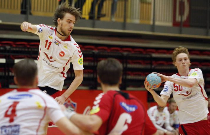 Valur gjörsamlega valtaði yfir HK í Olís-deild karla í kvöld, en lokatölur urðu 48-18. Valsmenn leiddu í hálfleik með ellefu marka mun. Þrjátíu marka munur varð svo raunin. Ótrúlegar tölur. Það var eiginlega ljóst strax frá byrjun í hvað stefndi. Valsmenn komust í 6-2 og síðar meir í 12-4. Þá var eins og gestirnir úr Kópaveginum hefðu kastað inn hvíta handklæðinu. Gestirnir fengu hvað eftir annað á sig hraðaupphlaup enda sóknarleikurinn í flestum tilfellum slakur og Valsmenn voru fljótir að refsa. Þegar þeir náðu loks að koma sér í færi sá Hlynur Morthens við þeim og það var saga fyrri hálfleiks. Staðan 22-11 í hálfleik fyrir heimamenn og gestirnir gengu brúnaþungir til búningsherbergja. Veislan fyrir stuðningsmenn Vals hélt áfram í síðari hálfleik. Munurinn einfaldlega óx og óx, og áfram var sóknarleikur HK skelfilegur. Lárus Helgi Ólafsson kom í markið hjá Val í síðari hálfleik og tók hann bara við Hlyni þar sem frá var horfið, en báðir voru þeir með yfir fimmtíu prósent markvörslu. Lokatölur urðu svo að Valur vann með þrjátíu mörkum, 48-18. Algjörlega kaffærðu gestina sem sáu aldrei til sólar. Andleysið og áhugaleysið var nánast viðvart frá fyrstu mínútu hjá Kópavogsliðinu. Markmenn Vals voru frábærir. Allir útileikmenn nema einn, Ægir Hrafn Jónsson, náðu að skora og allir meira en eitt mark. Það er fáheyrð tölfræði. Sem dæmi um hversu slakan sóknarleik HK var að spila, er að þeir voru einungis með 44% skotnýtingu gegn 84% skotnýtingu hjá Val. Með sigrinum fara Valsmenn upp í þriðja sætið, einu stigi á undan Fram sem eru í fjórða og einu stigi á eftir ÍBV sem er í öðru. HK er enn á botninum með þrjú stig. Leikmenn gestanna þurfa að fara í alvarlega naflaskoðun, það er alveg ljóst.Ólafur Stefánsson, þjálfari Vals: Þetta er bland af tilfinningum ,,Þetta var bara mjög gott. Ég veit ekki alveg hvað gerðist eiginlega. Það voru bara einhver sirkusatriði og læti. Á einn veginn er maður glaður að ná svona toppleik og á hinn veginn er maður bara ennþá stressaðari fyrir leiknum á mánudaginn. Bikarleikur gegn Haukum og það er stórt próf fyrir okkur," sagði Ólafur við Vísi eftir leik. ,,Þetta er jákvætt og við þurfum núna að ná okkur niður og halda fókus fyrir Haukana. Við erum bara strax komnir þangað." Ellefu af tólf útileikmönnum Vals komust á blað í dag og Ólafur er sáttur með framlag alla leikmanna: ,,Við höldum dampi og keyrum, erum "cocky" og vonandi tekst okkur að halda þessum dampi á mánudaginn. Það verður auðvitað allt annar leikur, miklu meiri þungi í Haukunum, þeir eru efstir og allt það. Það verður bara alvöru leikur." ,,Það er alltaf stórt próf að fá Hauka, FH og þessi lið í heimsókn. Þetta er bland af tilfinningum eftir þennan leik, að fara glaður með það sem maður gerði og við það að einbeita sér af risaleiknum á mánudag." ,,Við ætlum okkur í undanúrslitin. Til þess er þessi leikur víst, vinna hann og komast í Höllina. Það væri frábært, en við erum að fara mæta erfiðum andstæðingum," sagði Ólafur að lokum.Guðmundur Hólmar brýst í gegn.vísir/valliOrri Freyr Gíslason, línumaður Vals: Til hvers að hætta þegar þú ert fimm mörkum yfir? ,,Þetta var mjög gott en við ætlum bara vera rólegir. Það er mjög mikilvægur leikur á mánudaginn.Það gekk bara allt upp í dag og þá fer þetta svona hjá okkur," sagði Orri við Vísi. ,,Við höfum alltaf verið að keyra í bakið á liðunum, en það hefur bara aldrei verið að virka almennilega hjá okkur. Það small í dag og þá bara keyrum á þetta. Til hvers að hætta þegar þú ert fimm mörkum yfir, við höldum alltaf áfram að keyra." ,,Það voru allir fjórtán á skýrslu tilbúnir í þetta verkefni í dag. Markmennirnir skiptu hálfleiknum á milli sín og allir voru að skila inn eitthverju. Þetta var þetta klassíska, liðsheildarsigur." Valur fær Hauka í heimsókn á mánudaginn, en um risaslag er um að ræða í 8-liða úrslitum Coca-Cola bikarsins. Orri segist Valsara ekkert vera farnir af jörðinni: ,,Nei nei, það er bara æfing hálf níu í fyrrramálið og æfing aftur á sunnudag. Gott vídeó og við erum klárir," sagði Orri galvaskur.Leó Snær og félagar náðu sér ekki á strik.vísir/valliSamúel Árnason, þjálfari HK: Þetta var bara eins og léleg bíómynd ,,Það var ekkert í lagi hjá okkur í dag. Hvorki vörn, sóknarleikur. Við erum að skapa okkur ágætis færi, en erum að skjóta hrikalega illa. Við hlupum einnig illa til baka og það var í rauninni allt sem hefði mátt betur fara," sagði Samúel vonsvikinn eftir leik. ,,Ég man ekki eftir að hafa tapað sem leikmaður með þrjátíu mörkum og þetta er í fyrsta skipti sem það gerist hjá mér sem þjálfari. Ég er virkilega sár." ,,Mér fannst við vera búnir undir það sem Valsmenn voru að fara gera, en náðum ekki að leysa þessar stöður sem koma upp. Þegar blæs á móti þá þarf maður að grafa djúpt, en það var lítið að sækja þangað í dag." ,,Við vorum að slútta illa og þeir komu bara með hraðaupphlaup í bakið á okkur. Ég veit ekki hvað mörg af þessum hraðaupphlaupum voru mörg, örugglega yfir 20. Það segir sig sjálft, það er enginn það lélegur í handbolta að hann geti ekki varist því að hinn geti skorað 20 mörk úr hraðaupphlaupum. Í dag mættu menn illa stemmdir og með litla trú á verkefninu, með lítið sjálfstraust." Aðspurður hvort botninum hefði verið náð núna, sagði Samúel: ,,Ég ætla rétt að vona það. Þetta er bara einn leikur, leikurinn gífurleg vonbrigði. Þetta er þó bara einn leikur af öllum á tímabilinu, tímabilið hvorki byrjaði né endaði í dag. Það er alveg klárt að við getum lært lítið af s