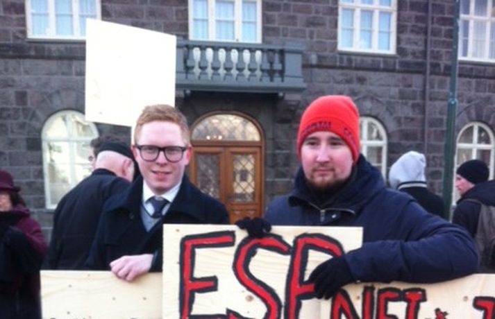 Andrúmsloftið var rafmagnað á Austurvelli í dag en hátt í fjögur þúsund manns var á svæðinu í mótmælaskyni. Mótmælin fóru friðsamlega fram en mikill hávaði var á staðnum. Þónokkur hávaði stafaði af búsáhaldabarningi og fjöldinn allur af fólki tók sér stöðu við öryggisgirðingu sem komið var fyrir framan við Alþingishúsið og barði í. Talsverður fjöldi af lögreglumönnum var á svæðinu, einkennis- og óeinkennisklæddum. Það er nokkuð ljóst að fólk er ósátt við ákvörðun ríkisstjórnarinnar. Fólk lét í sér heyra hafði þetta að segja:Katrín Júlíusdóttir var meðal mótmælenda á svæðinu og segist hún ósátt við vinnubrögð ríkisstjórnarinnar. „Ég er hérna úti til að sýna samstöðu með þeim sem eru hér að mótmæla því að þjóðin fái ekki að taka ákvörðun um framhald viðræðna. Ég er mjög ósátt og þarna er verið að loka einu færu leiðinni til upptöku á nýjum gjaldmiðli fyrir okkur Íslendinga og ég tel það algjöra ósvinnu og mikið skemmdarverk af hálfu ríkisstjórnarinnar.“Soffía Ellý Sigurðardóttir var einnig á meðal mótmælenda. Hún hélt á skilti með slagorðinu „Sigmundur PÚTÍN Gunnlaugsson.“ „Ég er hér vegna þess að ég er gjörsamlega búin að fá leið á brostnum loforðum þeirra manna sem við erum að kjósa í ábyrgðarstöðu í þessu þjóðfélagi. Ég vil kjósa og fá að sjá samninginn og vil fá að taka þátt og vita um hvað málið snýst en ekki láta einhvern segja mér hvað ég eigi að gera.“Benedikt Kristjánsson var fremstur í flokki mótmælenda. Hann vill meira lýðræði og minna einræði. „Minn réttur til að kjósa um áframhaldandi viðræður var tekinn af mér af núverandi ríkisstjórn og ég mótmæli því. Ég tel að hagsmunum Íslands sé borgið innan ESB. Við fáum stöðugri gjaldmiðil og vextir til húsnæðislána eru hagstæðari innan Evrópusambandsins. Ég er Samfylkingarmaður.“Jón Steinþór Valdimarsson, formaður Já Ísland, var einnig á svæðinu. „Við erum hérna til þess að mótmæla því að það sé verið að draga til baka umsókn Íslands að ESB. Við teljum að það eigi ekki að gera það án þess að spyrja þjóðina. Þetta er stórmál sem varðar langan tíma. Þetta er hafið yfir stjórnmálaflokka og þetta er hafið yfir ríkisstjórnina. Þetta er stórmál. Ég tel að það sé rétt að ganga í ESB en til þess að hægt svara því endanlega þá verðum við að fá að sjá samninginn.“Lúther Steinar Kristjánsson hafði þetta að segja. „Það er alveg hreint enginn vafi í mínum huga að þessir menn sem eru þarna inni á þingi núna að þeir eiga ekkert erindi í stjórnsýslu í lýðræðislandi. Það logar heimsbyggðin útaf fólki sem hagar sér eins og þeir haga sér núna. Ég var að vona að ég myndi ekki lifa svo lengi að ég ætti eftir að upplifa svona hluti í landinu mínu. Ég er gamall Íslendingur, fæddur 1934 og þessir menn þurfa að finna sér annað að starfa. Ég vill ekki ganga í Evrópusambandið en ég vil að þjóðin fái að njóta þess réttar að fá að kjósa um málið eins og frjáls borið fólk.“
