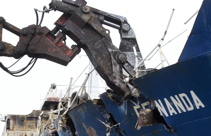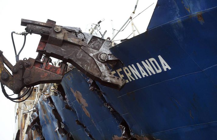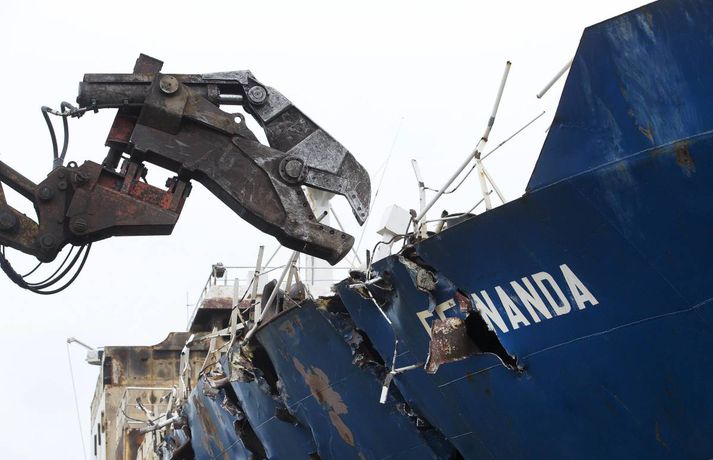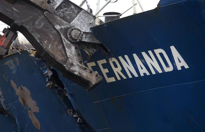 Starfsmenn fyrirtækisins Hringrásar hófu niðurrif flutningaskipsins Fernöndu í Helguvík í gær. Í maí 2012 strandaði Fernanda við Sandgerði og var Landhelgisgæslan kölluð til. Undir lok síðasta árs kom neyðarkall úr skipinu þegar eldur hafði komið upp í vélarrúminu. Skipið var þá statt um 20 kílómetra suður af Vestmannaeyjum. Fernanda var dregin í Hafnarfjarðarhöfn en þá blossaði upp mikill eldur og lagði mikinn reyk yfir Hafnafjarðarbæ. Fernanda var því næst dregið í Grundartanga og var olíu og spilliefnum dælt úr skipinu. Nú hefur Fernanda verið dregið í höfnina í Helguvík þar sem skipið verður rifið niður í brotajárn og selt úr landi. Einar Ásgeirsson, framkvæmdarstjóri Hringrásar, segir ekki ljóst hve langan tíma verkið muni taka en ljóst sé að það fari vel af stað.