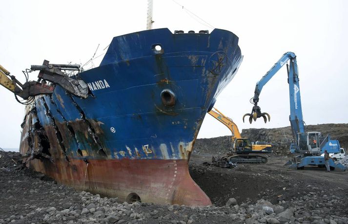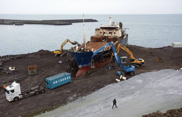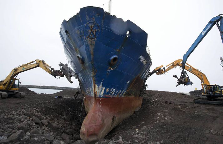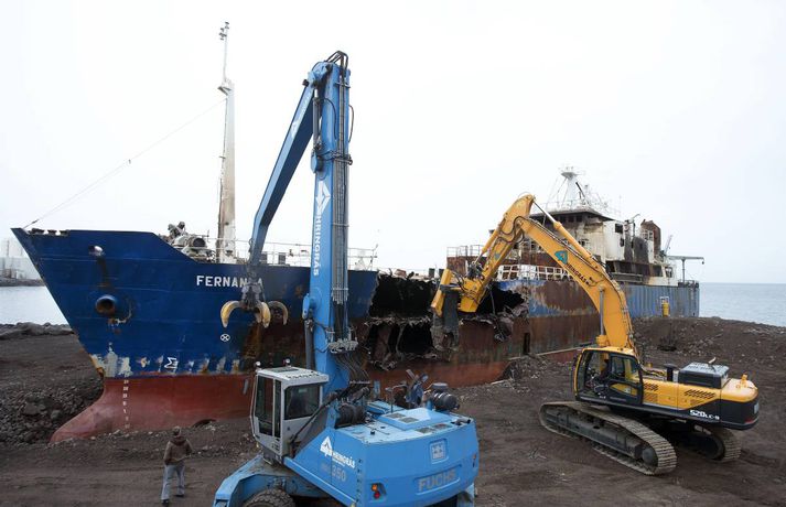 Vel gengur að rífa niður Fernöndu Stefán Árni Pálsson skrifar 12. mars 2014 10:42 Fernanda hefur verið dregið í höfnina í Helguvík þar sem skipið verður rifið niður í brotajárn visir/stefán Starfsmenn fyrirtækisins Hringrásar hófu niðurrif flutningaskipsins Fernöndu í Helguvík í gær. Í maí 2012 strandaði Fernanda við Sandgerði og var Landhelgisgæslan kölluð til. Undir lok síðasta árs kom neyðarkall úr skipinu þegar eldur hafði komið upp í vélarrúminu. Skipið var þá statt um 20 kílómetra suður af Vestmannaeyjum. Fernanda var dregin í Hafnarfjarðarhöfn en þá blossaði upp mikill eldur og lagði mikinn reyk yfir Hafnafjarðarbæ. Fernanda var því næst dregið í Grundartanga og var olíu og spilliefnum dælt úr skipinu. Nú hefur Fernanda verið dregið í höfnina í Helguvík þar sem skipið verður rifið niður í brotajárn og selt úr landi. Einar Ásgeirsson, framkvæmdarstjóri Hringrásar, segir ekki ljóst hve langan tíma verkið muni taka en ljóst sé að það fari vel af stað. Tengdar fréttir Gríðarleg hætta af logandi skipi í Hafnarfjarðarhöfn Að sögn sprengjusérfræðings hjá Landhelgisgæslunni er skipið að hitna og mikill eldsmatur um borð - um hundrað tonn af olíu. 1. nóvember 2013 10:43 Ekki í myndinni að rífa Fernöndu á Grundartanga Slökkvilið Akraness og Hvalfjarðarsveitar lauk í gærkvöldi störfum sínum í skipinu Fernanda eftir að það var dregið að bryggju á Grundartanga á miðvikudaginn. Faxaflóahafnir vilja ekki hafa skipið lengi á Grundartanga. 8. nóvember 2013 14:43 Magnaðar myndir úr brunanum: Svavar Halldórs liðtækur ljósmyndari Svavar Halldórsson, fyrrverandi fréttamaður á RUV, náði mögnuðum myndum af slökkviliðsmönnum við störf í Hafnarfjarðarhöfn í dag. 1. nóvember 2013 15:38 Varðskipið Þór með skipið í togi Það ræðst í dag hvað gert verður við flakið af flutningaskipinu Fernöndu. 6. nóvember 2013 05:00 Fernanda undir Hafnarbergi Skipið Fernanda er enn í togi en varðskipið Þór hefur þurft að leita í var með það vegna vonds veðurs. 4. nóvember 2013 07:28 Fernanda dregin út úr höfninni Flutningaskipið er komið út úr höfninni en óvíst er hvert förinni er heitið. Talsmenn Umhverfisstofnunar og Hafrannsóknarstofnunar funda eftir hádegi. Finna þarf stað þar sem minnsta hættan skapast sökkvi skipið. 1. nóvember 2013 11:53 Löskuð Fernanda enn í vari Allt kapp er lagt á að afstýra umhverfisslysi við Reykjanesskaga þar sem varðsskipið Þór er nú með flutningaskipið Fernöndu í togi. Litlar líkur eru á að Fernanda sökkvi í sæ að mati Landhelgisgæslunnar. 4. nóvember 2013 19:14 Tæknideild rannsakar Fernöndu í dag Tæknideild lögreglunnar á höfuðborgarsvæðinu mun í daga rannsaka eldsumbrot í skipinu Fernanda sem liggur við bryggju á Grundartanga. Ljósmyndari Fréttablaðsins tók myndir af skipinu við bryggju á Grundartanga 7. nóvember 2013 10:02 Ákveða í birtingu hvort Fernanda verði dregin til hafnar Varðskipið Þór dró flutningaskipið Fernöndu inn fyrir Garðskaga í gærkvöldi og eru skipin þar í vari. Í birtingu verður ákveðið hvort Fernanda verður aftur dregin til hafnar, meðal annars til að dæla hundrað tonnum af olíu í land, sem eru í geymum skipsins. 5. nóvember 2013 07:03 Magnaðar myndir af slökkvistarfi í Fernöndu Varðskipið Þór hefur tekið flutningaskipið Fernöndu í tog og mun draga það til hafnar í Hafnarfirði. 31. október 2013 15:18 „Það er náttúrulega bara fáránlegt að skipið sé sett hingað“ Starfsmenn í nágrenni hafnarinnar segja skipið skíðloga stafna á milli og eldtungurnar teygi sig hátt til lofts. 1. nóvember 2013 11:27 Talið að eldurinn sé slokknaður í Fernöndu Þó er enn leitast við að draga úr hita í skrokki skipsins og sprautar varðskipið Þór á skipið eftir því sem aðstæður leyfa. 3. nóvember 2013 10:00 Blása reykinn burt með stórum blásurum Slökkivilið Höfuðborgarsvæðisins hefur komið fyrir stórum blásurum fyrir aftan Fernöndu til að hindra að reyk beri yfir byggð í Hafnafirði. 1. nóvember 2013 11:16 Fernanda dregin á land í Helguvík Verið er að koma flutningaskipinu Fernöndu, sem eyðilagðist í eldi fyrir nokkrum vikum, á fast land í Helguvík nú á há flóðinu, en þar verður það rifið. 19. desember 2013 07:56 Fernanda verður dregin nær höfn í dag Verður að koma skipinu í skjól svo hægt sé að senda menn um borð til að ganga úr skugga um að eldurinn sé slokknaður. 3. nóvember 2013 12:51 Olíutankar í "hæfilegri fjarlægð“ frá eldinum Birgðastöð Atlantsolíu stendur við Hafnarfjarðarhöfn. Fulltrúi fyrirtækisins segir enn ekki stafa hættu af eldi um borð í skipinu Fernöndu. 1. nóvember 2013 11:52 Eigendur Fernöndu koma til landsins á morgun Starfsmenn Norfos Shipping, eiganda flutningaskipsins Fernöndu sem nú liggur stórskemmt í höfn á Grundartanga, koma hingað til lands núna um helgina. Með í för verða fulltrúar tryggingafélaga sem munu meta skemmdirnar. 7. nóvember 2013 20:45 Deilt um ábyrgð í málum Fernöndu Ekki er enn byrjað að dæla olíu og menguðum sjó úr flakinu af flutningaskipinu Fernöndu sem liggur við bryggju á Grundartanga og getur því enn stafað mengunarhætta af því. Hagsmunaaðilar þvers og kruss um heiminn deila um hver beri endanlega ábyrgð á að fjarlægja mengandi efni úr skipinu og rífa það. 12. nóvember 2013 12:10 Vildu skipið ekki aftur í Hafnarfjarðarhöfn Flutningaskipið Fernanda var dregið að höfn við Grundartanga seinni partinn í dag, en yfirvöld í Hafnarfirði vildu ekki fá skipið aftur inn í Hafnarfjarðarhöfn. Slökkvilið Akraness mun yfirfara skipið í kvöld og lögreglurannsókn hefst strax í fyrramálið. 6. nóvember 2013 18:56 Illgerlegt að fjarlægja olíuna Engar rá