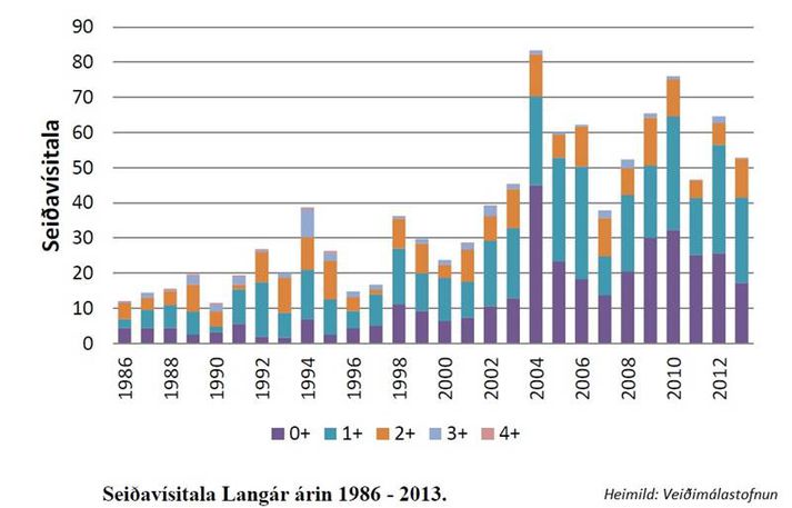 Horfur í Langá góðar fyrir komandi sumur Karl Lúðvíksson skrifar 15. apríl 2014 13:03 Graf sem sýnir seiðavísitölu Langár Langá á Mýrum hefur undanfarin ár verið í flokki aflahæstu laxveiðiáa landsins og miðað við nýjar rannsóknir á seiðabúskap hennar er útlitið gott fyrir komandi ár. Ný rannsókn Veiðimálastofnunar sýnir að horfurnar í ánni eru mjög góðar en þetta byggir á aukinni hrygningu í ánni en seiðaárgangar frá 2009 og 2010 eru með þeim sterkustu sem hafa mælst í ánni. Lax úr þessum árgöngum verður ríkjandi í göngum sumarsins og þar sem seiðabúskapur skýrir um 40-50% veiðinnar benda allar upplýsingar til að gott sumar sé í vændum í ánni. Veiðin 2013 endaði í 2815 löxum en áin hefði leikandi getað farið mun hærra en það ef miklir vatnavextir í lok tímabils hefðu ekki gert veiðimönnum erfitt fyrir. Mesta veiðin var 2008 þegar áin fór í 2970 laxa og unnendur Langár eru þegar farnir að spá henni yfir 3000 laxa í sumar enda allar aðstæður til að svo verði þegar til staðar. Nægur snjór er á hálendinu og staðan í vatnsbúskapnum því afar góð.Veiðimálastofnun hefur unnið árlega að vöktun á laxastofni Langár frá árinu 1986 í samvinnu við veiðifélag Langár, en fyrstu rannsóknir í ánni voru gerðar 1975. Skýrsla stofnunarinnar er mjög fróðleg lesning fyrir veiðimenn en þar segir m.a.: „Seiðaþéttleiki mældist langt yfir meðaltali haustið 2013 og nýliðun seiða úr hrygningu 2012 mældist yfir meðallagi, þrátt fyrir niðursveiflu í laxgengd og veiði á árinu 2012. Uppistaða í laxveiðinni 2013 var klakárgangurinn frá 2009. Árgangar frá 2010 og 2011 hafa mælst svipaðir að styrkleika og er því útlit fyrir að áframhald geti orðið á góðri laxgengd og veiði næstu árin á vatnasvæði Langár.“ Þetta eru góðar fréttir fyrir unnendur Langár á Mýrum en skýrslu Veiðimálastofnunar í heild má nálgast hér að neðan.Vöktunarrannsóknir á laxastofni Langár á Mýrum árið 2013. Stangveiði Mest lesið Svona á að hamfletta rjúpurnar Veiði Gæsaveiðin gengur vel í rokinu Veiði 100 laxa holl lokadagana í Kjósinni Veiði Nú er kominn tími til að grafa lax - uppskrift Veiði Stóra bókin um Villibráð komin út aftur Veiði Kreistu tvo laxa upp úr Krossá í Bitru Veiði Núll í Blöndu á fyrsta degi Veiði Rjúpan kostar allt að 5000 krónur stykkið Veiði Rýnt í tölur úr Stóru Laxá Veiði 18.184 fiskar veiðst í Veiðivötnum Veiði