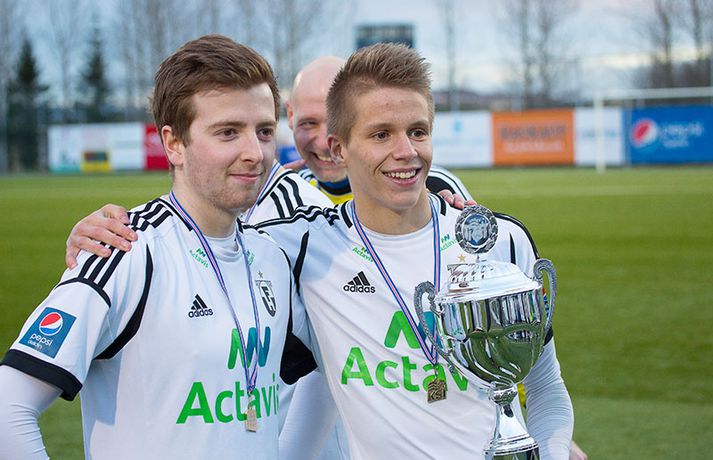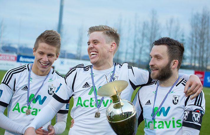 Umfjöllun, viðtöl og myndir: FH - Breiðablik 4-1 | FH Lengjubikarmeistari Anton Ingi Leifsson á Samsung-vellinum skrifar 25. apríl 2014 13:53 Ingimundur Níels glaðbeittur með bikarinn. Vísir/daníel Ingimundur Níels Óskarsson skoraði þrennu fyrir FH þegar liðið lagði Breiðablik 4-1 í úrslitaleik Lengjubikars karla í kvöld. FH-liðið var betri aðilinn og eins fyrr segir lék Ingimundur á alls oddi. Hafnarfjarðarliðið spilaði vel og skapaði meiri usla fram á við en þeir grænklæddu. Fyrri hálfleikur byrjaði afar rólega og lítið var að frétta fyrstu mínúturnar, en bæði lið voru án nokkura öflugra leikmanna. FH tóku þó fljótlega völdin og réðu ferðinni. Þeir voru ekki mikið að skapa sér fyrstu mínúturnar, en það átti eftir að breytast. Ingimundur Níels Óskarsson var að spila afar vel og það var einmitt hann sem skoraði fyrsta markið. Blikavörnin var of hátt á vellinum og Böðvar Böðvarsson sendi boltann inn fyrir vörnina þar sem Ingimundur tók við honum, lék á einn varnarmann sem hafði skilað sér til baka og lagði boltann skemmtilega í fjærhornið framhjá varnarlausum Gunnleifi í markinu. Eins og fyrr segir réðu hvítklæddir Hafnfirðingar lögum og lofum á vellinum. Ingimundur Níels var nálægt því að koma FH í 2-0 á 36. mínútu, en þá sá Gunnleifur við honum. Blikarnir voru afar slakir í fyrri hálfleik og var lítið sem ekkert að frétta í þeirra sóknarleik. Staðan var 1-0 í hálfleik fyrir Hafnfirðinga og gerði Ólafur Kristjánsson, þjálfari Breiðabliks, tvöfalda skiptingu í hálfleik og freistaði þess að eitthvað myndi frískast upp á hans menn. Þeir náðu sinni fyrstu almennilegu sókn eftir rúman klukkutíma leik. Höskuldur Gunnlaugsson sem var þá nýkominn inná gaf þá góða fyrirgjöf fyrir markið sem Ellert Hreinsson, einnig varamaður, skallaði yfir. Nánast í næstu sókn náðu FH-ingar tveggja marka forystu. Eftir ágætis sókn fékk Guðjón Árni boltann, fór upp að endamörkum þar sem hann lagði boltann fyrir markið. Þar var mættur Ingimundur Níels Óskarsson sem ýtti boltanum yfir línuna og FH-ingar komnir í vænlega forystu þegar 63. mínútur voru komnar á klukkuna. Varamenn Blika minntu rækilega á sig í kvöld. Þegar tólf mínútur voru til leiksloka náði Gísli Eyjólfsson að minnka muninn, eftir fyrirgjöf frá hægri náði hann að vinna boltann og skilaði honum í fjærhornið framhjá varnarlausum Kristjáni Finnbogasyni í markinu. Síðustu mínúturnar voru Blikarnir meira með boltann og freistuðu þess að jafna metinn. Allt kom fyrir ekki og Ingimundur Níels Óskarsson kom FH í 3-1 með sínu þriðja marki. Ingimundur slapp einn í gegn og lagði boltann framhjá Gunnleifi í markinu. FH-ingar voru ekki hættir og Hólmar Örn Rúnarsson rak síðasta naglann í líkkistu Blika með flottu marki í uppbótartíma. Hólmar fékk boltann á vítateignum og skoraði með laglegu vinstri fótar skoti, efst í markhornið. FH því Lengjubikarsmeistari KSÍ árið 2014. FH liðið var heilt yfir mun sterkari aðilinn í leiknum í kvöld. Margir leikmenn liðsins spiluðu vel í kvöld en þar ber helst að nefna Ingimund Níels og Sam Hewson. Ingimundur skoraði þrjú mörk auk þess að vera vel ógnandi á hægri kantinum og Sam Hewson kom með skemmtileg hlaup af miðsvæðinu auk þess að spila félaga sína vel uppi. Hjá Breiðablik var fátt um fína drætti fyrr en í síðari hálfleik. Varamennirnir komu frískir inn og Ellert Hreinsson skapaði smá usla í fremstu víglínu. Markaskorari Blika, Gísli Eyjólfsson, átti einnig fína innkomu, en betur má ef duga skal hjá Breiðablik. Taka skal það þó fram að í bæði lið vantaði lykilmenn og liðin mætast aftur eftir rúma viku í fyrsta leik Pepsi-deildarinnar á Kópavogsvelli. Þá verður annar bragur á liðunum og meira undir, þó auðvitað hafi bikar verið í húfi í kvöld.vísir/daníelAndri Rafn: Æfingaleikjabragur á þessu ,,Það er erfitt að segja. Þetta var frekar jafn leikur og æfingarleikjabragur á þessu. Þeir komast í 2-0 og við skorum svo mark. Þá er þetta spurning um að annað hvort jafnaru eða færð mörk í bakið. Það skiptir ekki máli hvort þú tapir þessum leik 2-1 eða 4-1," sagði Andri Rafn við Vísi í leikslok. ,,Við erum að skoða ákveðna hluti og þrátt fyrir að við séum að spila um bikar, þá eru menn með hugann við að fyrsti leikur er einmitt gegn FH. Menn ætla ekki að sýna allt sem þeir eiga inni og sýna andstæðingnum allt. Ég veit ekki hvað eitt fór úrskeiðis, en svona er boltinn." Blikarnir voru afar bitlausir fram á við og þar var Andri sammála: ,,Vissulega. Við vorum ekki að ná að opna þá mikið. Við vildum liggja aftarlega og leyfa þeim að koma, við vildum vinna boltann framarlega á vellinum og koma í hraðar skyndisóknir." ,,Þeir voru að komast alltof mikið aftur fyrir okkur, þrátt fyrir að við höfum legið til baka. Það voru nokkur mistök sem urðu til þess valdandi að við fengum á okkur mörk og við náðum aldrei að stjórna leiknum eins og við vildum gera." Liðin mætast í fyrstu umferð Pepsi-deildarinnar þann 5. maí. Blikarnir stefna að sjálfsögðu á sigur í þeim leik: ,,Það er klárlega það sem við ætlum okkur. Það er bikar hérna í boði, en ég veit ekki hvort skiptir meira máli; bikarinn hérna eða þrjú stig í fyrsta leik. Það er þó aldrei skemmtilegt að tapa og auðvitað ferðu í alla leiki til að vinna, annað væri lygi," sagði Andri Rafn við Vísi í leikslok.vísir/daníelHeimir: Var ekki hræddur ,,Mér fannst við spila vel. Við byrjuðum þennan leik vel og vorum góðir í fyrri hálfleik og skoruðum gott mark," sagði Heimir ,,Við áttum möguleika að skora fleiri í fyrri hálfleik, en héldum áfram í síðari hálfleik. Við komumst í 2-