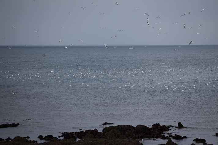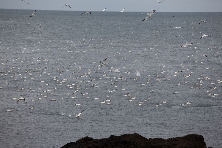 Mikið súlukast fyrir utan Hellissand Stefán Árni Pálsson skrifar 21. apríl 2014 19:33 myndir/þröstur Mikið líf hefur verið fyrir utan Hellissand í dag þar sem gífurlegur fjöldi súla stingur sér eftir æti. Nokkuð er einnig um háhyrninga í sjónum. Veiðiaðferð súlunnar kallast súlukast og steypa þær sér úr margra metra hæð og lóðrétt niður ef bráðin er djúpt í sjó. Framan á fuglinum eru loftsekkir sem virka sem púðar. Mikið súlukast hefur verið í Kolgrafarfirði undanfarna mánuði þar sem fjörðurinn hefur verið fullur af síld og því má gera ráð fyrir að um síld sé að ræða við Hellissand sem er í næsta nágrenni við Kolgrafarfjörð. Þröstur Albertsson tók meðfylgjandi myndir sem fylgja fréttinni en sjón er sögu ríkari. Mest lesið „Ég var kölluð „hryðjuverkamaður““ Innlent Talið að Rob Reiner og eiginkona hans hafi verið myrt Erlent Úkraínumenn reiðubúnir til að falla frá aðild að Nató Erlent Skotinn tvisvar eftir að hafa tæklað annan skotmanninn Erlent Árásarfeðgarnir nafngreindir Erlent Komu sér fyrir í ruslageymslu og kveiktu þar eld Innlent Skotmennirnir feðgar Erlent Heyrði byssuhvellina: Skotvopnalöggjöfin rædd á kaffistofunni Erlent Íslendingur í Brown-háskóla: Oftast í tímum í sömu stofu og árásin var gerð Innlent Ekki mótfallin Fljótagöngum en ekki með nýrri forgangsröðun Innlent Fleiri fréttir Sinntu fimmtán málum í tengslum við Iceguys tónleikana „Ég var kölluð „hryðjuverkamaður““ Magnea sækist eftir 2.-4. sæti á lista Samfylkingar Komu sér fyrir í ruslageymslu og kveiktu þar eld Vinna að því að koma upp efnagreiningu í neyslurýmum Ekki mótfallin Fljótagöngum en ekki með nýrri forgangsröðun Fleiri lífeyrisþegar og leikskólaforeldrar sem þurfa jólaaðstoð „Mjög erfitt starf tilfinningalega“ Handtekinn með stóran hníf Leggja til að bókasafnsgreiðslur verði hækkaðar Íslendingur í Brown-háskóla: Oftast í tímum í sömu stofu og árásin var gerð Ekkert því til fyrirstöðu að Ísland taki þátt í drónakaupum Ekkert ákveðið varðandi framboð: „Ég er í tveimur flokkum“ Hálka þegar bíll valt í Biskupstungum Mikið myrkur þegar ekið var á konu á rafhlaupahjóli 270 íbúðir í byggingu í Þorlákshöfn Ástandið á bráðamóttökunni sýni viðkæmni kerfisins Segir Kristrúnu verja „lögbrot“ samráðherra síns Hryðjuverkaárás í Ástralíu og ástand í heilbrigðiskerfinu Sanna segir frá nýju framboði Dyraverðir handteknir vegna líkamsárásar Skýrsla ráðherra svari ekki mikilvægum spurningum um brúun bilsins Aðstæður bágbornar á spítalanum til að mæta svo miklu álagi Tveir fluttir á spítala vegna umferðarslyss í Biskupstungum Bjarnveig Birta og Stein Olav sigurvegarar forprófkjörs „Ég fæddist inn í pólitískan líkama“ Eldur í íbúð við Snorrabraut Skilur að starfsfólk hafi ekki viljað afgreiða manneskju með hakakross Sjúklingar ekki lengur í bílageymslu bráðamóttökunnar Sameiningu Dalabyggðar og Húnaþings vestra hafnað Sjá meira