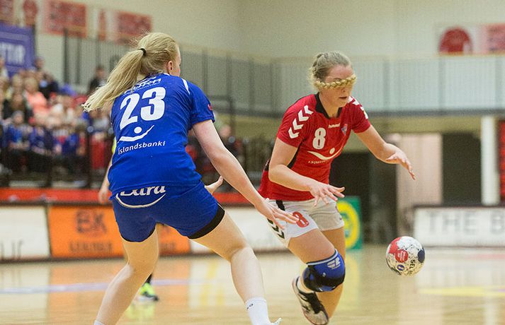 Það þurfti 80 mínútur til að knýja fram úrslit í öðrum leik Vals og Stjörnunnar í lokaúrslitum Olís deildar kvenna sem fór fram í Vodafone höllinni í kvöld. Að lokum voru það heimakonur sem höfðu betur, 25-23, og jöfnuðu þar með metin í einvígi liðanna.Daníel Rúnarsson, ljósmyndari Vísis og Fréttablaðsins, var á leiknum í kvöld og náði þessum skemmtilegu myndum hér fyrir ofan og neðan. Leikurinn var lengst af jafn, næstum óþægilega spennandi á köflum, en það hafa verið spilaðir betri handboltaleikir á Íslandi. Uppsettur sóknarleikur beggja liða var stirður, en það gæti átt sér eðlilegar skýringar eins og Stefán Arnarson, þjálfari Vals, sagði í viðtali við undirritaðan að leik loknum. Þetta eru lið sem gjörþekkja hvort annað og það er erfitt að draga nýja ása upp úr erminni á þessum tímapunkti. Valskonur unnu leikinn fyrst og síðast fyrir tilstuðlan frábærs varnarleiks, góðrar markvörslu Berglindar Írisar Hansdóttur og hraðaupphlaupanna sem þær voru svo duglegar að keyra. Þar fór Karólína Bærhenz Lárusdóttir - besti leikmaður Vals í leiknum ásamt Önnu Úrsúlu Guðmundsdóttur - fremst í flokki en hún skoraði fimm hraðaupphlaupsmörk í leiknum. Þessi auðveldu mörk skiptu sköpum í ljósi þess að Hrafnhildur Skúladóttir komst ekki á blað í leiknum, sem er óvanalegt á þeim bænum. Fyrri hálfleikur var kaflaskiptur í meira lagi. Leikurinn var jafn á upphafsmínútunum, en Stjörnukonur náðu fljótlega undirtökunum. Vörn Garðarbæjarliðsins var sterk og sóknarleikurinn vel skipulagður. Það sama var ekki hægt að segja um sóknarleik heimakvenna sem var staður og ómarkviss. Á 19. mínútu, í stöðunni 5-8, fékk Bryndís Elín Wöhler, leikmaður Vals, tveggja mínútna brottvísun. Skúli Gunnsteinsson, þjálfari Stjörnunnar, tók umsvifalaust leikhlé og skipulagði sóknarleikinn. Stjarnan nýtti sér liðsmuninn, skoraði tvö mörk, bæði eftir sama leikkerfi, og náði fimm marka forystu, 5-10. Þá snerist leikurinn hins vegar við. Valskonur minnkuðu muninn í þrjú mörk og í stöðunni 7-10 missti Stjarnan Esther Viktoríu Ragnarsdóttur út af í tvær mínútur og líkt og Stjarnan, þá nýttu heimakonur sér liðsmuninn vel. Varnarleikur Vals styrktist og hann skilaði liðinu fjórum hraðaupphlaupsmörkum á síðustu sex mínútum fyrri hálfleiks. Valskonum tókst að jafna leikinn og staðan var 10-10 þegar liðin gengu til búningsherbergja. Bæði lið voru mistæk í upphafi seinni hálfleiks og leikurinn var allt að því erfiður á að horfa. Stjarnan komst tveimur mörkum yfir, 11-13, eftir mark Jónu Margrétar Ragnarsdóttur, en þá komu fjögur Valsmörk í röð. Sóknarleikur Stjörnunnar var mjög slakur á þessum kafla, en þegar Esther minnkaði muninn í 15-14 á 47. mínútu, var það aðeins fjórða mark Stjörnukvenna á 27 mínútum. Lokamínúturnar voru æsispennandi. Rebekka Rut Skúladóttir kom heimakonum tveimur mörkum yfir með góðu marki úr horninu, en Stjörnukonur neituðu að gefast upp og Jóna Margrét - sem var markahæst í liði Stjörnunnar með tíu mörk - jafnaði leikinn í 19-19 eftir hraðaupphlaup. Því þurfti að grípa til framlengingar. Hún var jafn spennandi og lokamínúturnar. Aftur voru það Valskonur sem voru yfir þegar skammt var eftir og aftur voru það Stjörnukonur sem jöfnuðu leikinn. Það gerði Sólveig Lára Kjærnested þegar hún fór inn úr horninu og skoraði framhjá Berglindi; ísköld á ögurstundu. Það reyndist hins vegar vera síðasta mark Stjörnunnar í leiknum. Valskonur skelltu í lás í vörninni í seinni framlengingunni og Stjörnukonur áttu engin svör við varnarleik heimakvenna. Stjörnuvörnin var einnig sterk, eins og hún var allan leikinn, en Valskonur fundu leiðina í gegnum hana í tvígang og það dugði til. Lokatölur 25-23, Val í vil. Næsti leikur liðanna fer fram í Garðabæ á sunnudaginn kemur. Stefán: Snýst um karakter og sigurvilja Þegar þetta er komið í tvær framlengingar, þá snýst þetta um karakter og sigurvilja. Við höfðum hann hér í kvöld og ég er gríðarlega ánægður með það," sagði Stefán Arnarson eftir sigurinn á Stjörnunni. Valsliðið spilaði frábæra vörn og þá sérstaklega í seinni framlengingunni þar sem Stjarnan skoraði ekki mark. "Ég var mjög ánægður með það. Og ég hef áður sagt að þegar við spilum okkar vörn, þá eiga lið oft í erfiðleikum með að skora gegn okkur. Ef eitthvað lið átti þennan sigur skilinn, þá var það Valur." Uppsettur sóknarleikur liðanna var fremur slakur í leiknum. Stefán segir það eiga sér eðlilegar skýringar. "Bæði Stjarnan og Valur spila sín kerfi, sem þau þekkja út og inn. Þú getur ekki endalaust komið með eitthvað nýtt og því er eðlilegt að sóknarleikurinn hökti. Það sem er ánægjulegt er að við erum að keyra hraðaupphlaupin mjög vel og í seinni framlengingunni erum við að skora tvö mörk úr seinni bylgju hraðaupphlaupa, sem er frábært," sagði Stefán að lokum.Skúli:Of fáar sem stigu upp í sókninni "Þetta var bara hörku leikur tveggja jafnra liða og sigurinn endaði Valsmegin. Leikurinn einkenndist af miklum og góðum vörnum og fínni markvörslu, en sóknir liðanna voru ekki alltaf nógu beittar. Þetta var hörku leikur og það var mjög mjótt á mununum," sagði Skúli Gunnsteinsson, þjálfari Stjörnunnar, eftir tapið fyrir Val eftir tvíframlengdan leik. "Auðvitað er ég fúll með að tapa, en mér fannst mínar stelpur standa sig mjög vel. Við tökum einhverja hluti út úr þessum leik og vinnum með þá." Sóknarleikur Stjörnunnar var oft á tíðum stirður, en Skúli sagði að liðið hefði ekki fengið framlag frá nógu mörgum leikmönnum. "Það voru of fáar að stíga upp í sókninni, en við eigum þær bara