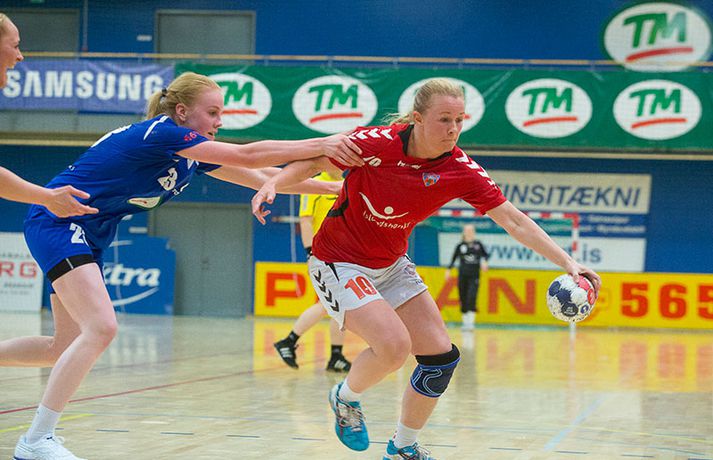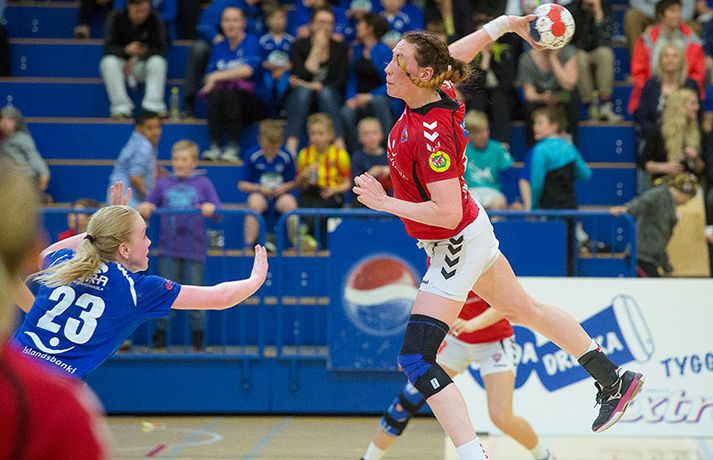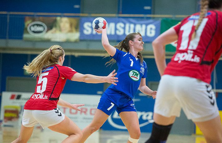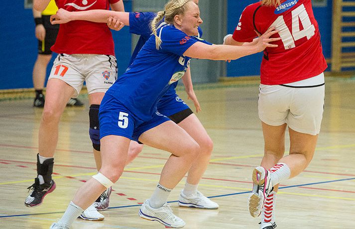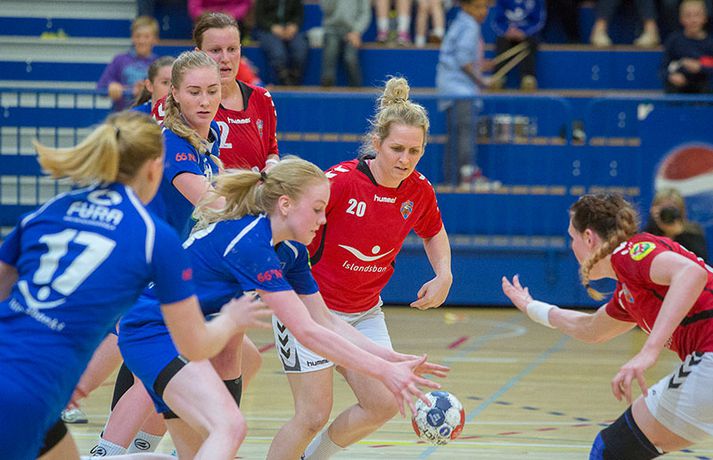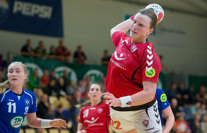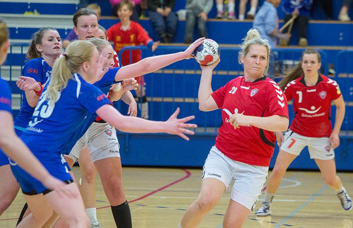 Stjarnan vann Val 22-20 í fyrsta leik liðanna í úrslitum Olís deildar kvenna í handbolta í Mýrinni í Garðabæ í kvöld. Stjarnan var fjórum mörkum yfir í hálfleik 12-8.Daníel Rúnarsson, ljósmyndari Vísis og Fréttablaðsins, var á leiknum í kvöld og náði þessum skemmtilegum myndum hér fyrir ofan og neðan. Stjarnan mætti mjög ákveðin til leiks og fór sérstaklega Jóna Margrét Ragnarsdóttir á kostum í sókninni í byrjun leiks. Hún kom liði sínu á bragðið og var Stjarnan mun betri lengst framan af. Varnarleikur Stjörnunnar var frábær og Florentina Stanciu naut sín í markinu. Valur átti samt sína kafla í leiknum. Vörnin var á köflum góð og framliggjandi vörnin sem liðið fór í eftir að Stjarnan náði sex marka forystu snemma í seinni hálfleik, var mjög öflug. Valur varð fyrir miklu áfalli í fyrri hálfleik þegar Ragnhildur Rósa Guðmundsdóttir skaddaðist á hásin og kom ekki meira við sögu. Ekki bætti úr skák þegar Rebekka Rut Skúladóttir snéri sig á ökkla um miðbik seinni hálfleiks. Það þýddi að Valur þurfti að færa vörnina aftar en sóknarleikur Stjörnunnar var farinn að hiksta verulega. Rebekka jafnaði sig og kom aftur inn þegar fimm mínútur voru til leiksloka og Valur gerði loka tilraun til að fá eitthvað út úr leiknum. Segja má að tapaðir boltar hafi farið illa með Val í leiknum og einn slíkur þegar liðið hafði náð að minnka muninn í þrjú mörk og þrjár mínútur voru eftir, gerði Val erfitt fyrir en liðið náði þó að minnka muninn í eitt mark þegar hálf mínúta var eftir en það var of lítið og of seint því Helena Örvarsdóttir gerði út um leikinn þegar skammt var eftir. Stjarnan leiðir einvígið 1-0 en annar leikur liðanna verður leikinn í Vodafone höllinni að Hlíðarenda á föstudagskvöldið. Jóna Margrét: Gerðum þetta óþarflega spennandi„Við fórum að bakka í staðin fyrir að halda línunum okkar og fórum að hægja á leiknum sem er ekki gott fyrir okkur,“ sagði Jóna Margrét Ragnarsdóttir sem fór fyrir Stjörnunni í sóknarleiknum í dag um síðustu mínútur leiksins í kvöld. „Við lokuðum fyrri hálfleiknum ágætlega og byrjuðum seinni vel. Svo fórum við að hægja á leiknum og þá fóru þær að saxa á og við gerðum þetta óþarflega spennandi í restina. „Maður þarf að klára þetta með stæl. Þetta er síðasta tímabilið og vonandi nær maður að gefa allt í þessa síðustu leiki,“ sagði Jóna sem fór mikinn í upphafi og var sá sóknarmaður Stjörnunnar sem reyndi hvað mest enda tók hún yfir 20 skot í leiknum. „Varnarleikur var mjög góður þangað til við fórum að bakka í restina. Það kemur aftur upp og vonandii höldum við þessu. „Þetta er bara 1-0 og er rétt að byrja. Við þurfum að halda okkar baráttu og gleði og vonandi lendir þetta réttum megin,“ sagði Jóna. Anna Úrsúla: Eins og við værum ekki tilbúnar í leikinn„Það dugar ekki að hrökkva í gang þegar það eru tíu mínútur eftir af leiknum. Sannarlega á maður ekki möguleika á að vinna dollu þannig,“ sagði Anna Úrsúla Guðmundsdóttir línumaður Vals og varnartröll í kvöld. „Það er eins gott að það sé stutt í næsta leik svo við getum hysjað upp um okkur buxurnar. Annars eigum við þetta ekkert skilið. „Við náum ekki að nýta okkur okkar styrkleika sem er vörn og hraðaupphlaup. Það kom ekki fyrr en í lokin. Það þarf að vera 100% allan leikinn til að vinna Stjörnuna. „Sóknarleikurinn var vandræðalegur. Það var eins og við værum ekki tilbúnar í leikinn. Allar sem ein og það er eitthvað sem við þurfum að slípa fyrir næsta leik. „Þegar maður er með svona marga tæknifeila þá er það svo lýjandi. Það gengur ekkert upp. Þetta þurfum við að fara yfir og laga fyrir næsta leik,“ sagði Anna Úrsúla en þrátt fyrir öll þessi vandræði var Valur ekki langt frá því að koma þessum leik í framlengingu og smá heppni í lokin hefði geta gjörbreytt stöðunni. „Maður verður að vera bjartsýnn og skoða betur þessar síðustu tíu mínútur og taka það með okkur í næsta leik. Þá eigum við kannski séns.“Vísir/DaníelVísir/DaníelVísir/DaníelVísir/DaníelVísir/DaníelVísir/DaníelVísir/DaníelVísir/DaníelVísir/Daníel