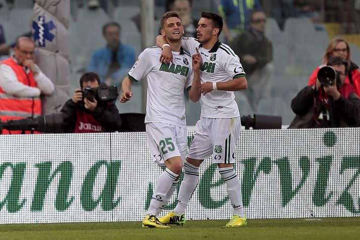 Lánsmaðurinn ungi frá Juve að bjarga Sassoulo Óskar Ófeigur Jónsson skrifar 6. maí 2014 20:00 Domenico Berardi fagnar einu af þremur mörkum sínum í kvöld. Vísir/Getty Domenico Berardi, 19 ára strákur sem er á láni frá Juventus, er langt kominn með að bjarga nýliðum Sassoulo frá falli úr ítölsku A-deildinni í fótbolta. Domenico Berardi skoraði í kvöld sína þriðju þrennu á tímabilinu þegar Sassoulo vann gríðarlega mikilvægan 4-3 útisigur á Fiorentina en hann lagði einnig upp fjórða markið. Sassoulo komst með þessu upp í 31 stig og er nú tveimur stigum fyrir ofan fallsæti þegar tvær umferðir eru eftir. Fyrr í vetur varð Domenico Berardi var næstyngsti leikmaðurinn í sögu ítölsku deildarinnar til þess að skora fernu í leik og jafnframt sá eini sem nær að skora fernu á móti AC Milan. Hann skoraði einnig þrennu í 4-3 útisigri á Sampdoria og sigurmarkið í 1-0 sigri á Chievo á dögunum. Domenico Berardi hefur skorað sextán mörk og lagt upp önnur sjö í 27 leikjum sínum með Sassoulo á leiktíðinni en hann hefur átt beinan þátt í 23 af 38 mörkum liðsins. Sassoulo hefur leikið níu leiki án Berardi á leiktíðinni og tapað sjö þeirra þar af samanlagt 1-7 í leikjunum við meistara Juventus.Vísir/GettyVísir/Getty Fótbolti Mest lesið Sakaður um svindl á HM í pílukasti Sport Áhorfendur ærðust eftir mögulega mark mótsins í fyrsta leik Fótbolti Hleður Kjartan lofi eftir frábæra frumraun með Aberdeen Fótbolti Ótrúleg tíðindi á HM í pílukasti: „Mikið sjokk“ Sport Óttast að Isak hafi fótbrotnað Enski boltinn Í bann fyrir að kasta flösku í barn Körfubolti HM í pílu: Littler flaug áfram og kvöldinu lauk með spennutrylli Sport Hjalti Þór ráðinn aðalþjálfari Álftaness Körfubolti Túfa gerir þriggja ára samning í Svíþjóð Fótbolti Dagskráin í dag: Sá elsti á HM í pílu og enski boltinn Sport Fleiri fréttir Áhorfendur ærðust eftir mögulega mark mótsins í fyrsta leik Sjáðu mörkin: Rogers sá um Manchester United Hleður Kjartan lofi eftir frábæra frumraun með Aberdeen Óttast að Isak hafi fótbrotnað Túfa gerir þriggja ára samning í Svíþjóð Arnór Ingvi orðinn leikmaður KR Albert skoraði í fyrsta sigri Fiorentina Bæjarar aftur á sigurbraut Tvenna frá Rogers tryggði Villa sigur gegn Manchester United Barcelona með fjögurra stiga forskot inn í nýtt ár Alvöru innkoma: Kjartan með stoðsendingu gegn Celtic í sínum fyrsta leik Sandra María hetjan og með þeim markahæstu í Þýskalandi Katla skoraði annan leikinn í röð Tómas Bent og félagar unnu Rangers og náðu átta stiga forskoti á toppnum Breiðablik kaupir Jónatan frá Norrköping Hildur áfram í bikarnum og Amanda enn á toppnum Fimmta sinn sem Arsenal er á toppnum um jólin: Unnu ekki titilinn í fyrstu fjögur skiptin „Viljum við að okkar verði minnst fyrir að vera skræfur?“ „Ef dómarinn hefði sinnt sínu starfi almennilega hefði Romero ekki fengið spjald“ Haaland gaf barnabarni Hareide gjöf Sjáðu mörkin úr enska: Sviptingar, sænskt þema og svakalegar tæklingar Madrídingar anda ofan í hálsmálið á Börsungum Calvert-Lewin hættir ekki að skora Gyökeres skaut Arsenal aftur á toppinn Ronaldo á nærbuxunum lætur Elon Musk efast um sjálfan sig Orri Steinn kominn með nýjan þjálfara Slot fámáll um stöðuna á Isak Gleði og sorg í sigri Liverpool Real Madrid - Sevilla | Tekst að róa ástandið fyrir jól? Willum spilaði sinn fyrsta leik í tæpa fjóra mánuði Sjá meira