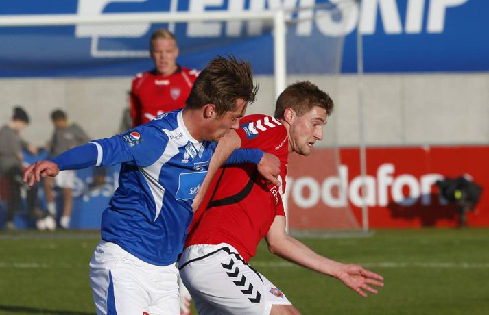 Óhætt er að segja að áhorfendur á Vodafone vellinum hafi fengið nóg fyrir peninginn í 5-3 sigri Vals gegn Fram í Pepsi deildinni í kvöld. Liðin voru jöfn á öllum sviðum fyrir leik kvöldsins. Eftir þrjá leiki höfðu liðin gert eitt jafntefli, tapað einum og unnið einn leik. Í þessum leikjum höfðu liðin skorað þrjú mörk en fengið önnur þrjú á sig.Patrick Pedersen sem gekk til liðs við Val á lokadegi félagsskiptagluggans var kominn í byrjunarliðið og hann átti eftir að láta til sín taka. Hann skoraði fyrsta mark leiksins með snyrtilegu skoti úr vítateignum eftir sendingu Kristins Inga Halldórssonar eftir aðeins tíu mínútna leik.Ósvald Jarl Traustason jafnaði metin skömmu síðar eftir klaufagang í vörn heimamanna. Ósvald var fyrstur að átta sig á slöku skoti Ingibergs Ólafs Jónssonar og renndi boltanum í gegnum klof Fjalars Þorgeirssonar í marki Vals. Bjarni Ólafur Eiríksson kom Valsmönnum aftur yfir stuttu seinna eftir frábæra skyndisókn þegar hann lyfti boltanum snyrtilega yfir Ögmund Kristinsson í marki Fram. Gestirnir úr Safamýrinni jöfnuðu metin skömmu fyrir lok hálfleiksins með afar skrautlegu marki. Fjalar greip fyrirgjöf en er hann lenti virtist hann slá boltanum í Hafstein Briem og þaðan í netið. Áhorfendur voru enn að átta sig á stöðunni þegar Valsmenn komust yfir á ný. Pedersen skoraði annað mark sitt í leiknum aðeins tveimur mínútum seinna. Þá fylgdi Daninn eftir skoti landa síns, Mads Lennarts Nielsen og ýtti boltanum yfir línuna skömmu fyrir leikhlé. Þrátt fyrir að spilamennskan hafi sem slík ekki verið neitt sérstök í fyrri hálfleik gengu liðin til hálfleiks í stöðunni 3-2. Eitthvað virtust þjálfararnir hafa lesið yfir mönnum pistilinn hvað varðar varnarleikinn því í upphafi seinni hálfleiks var jafnræði með liðunum og gekk báðum liðum illa að skapa færi. Eftir tuttugu mínútna leik í seinni hálfleik gengu Valsmenn langt með að klára leikinn. Kristinn Freyr Sigurðsson átti þá fyrirgjöf á fjærstöng sem Einar Bjarni Ómarsson, varnarmaður Framara reyndi að hreinsa en endaði á því að fara af bringunni á Kristni Inga og í netið. Indriði Áki Þorláksson tryggði stigin þrjú eftir góða skyndisókn þegar skammt var til leiksloka. Sigurður Egill Lárusson átti stungusendingu inn fyrir vörn Fram og Indriði kláraði færið listavel. Hafsteinn klóraði í bakkann fyrir gestina á lokamínútu venjulegs leiktíma en lengra komust þeir bláklæddu ekki og flautaði góður dómari leiksins, Kristinn Jakobsson, leikinn af stuttu síðar. Valsmenn geta verið ánægðir með stigin þrjú í kvöld þrátt fyrir að hafa fengið á sig þrjú mörk á heimavelli. Mörkin sem Valsmenn fengu á sig voru vægast sagt skrautleg og mátti auðveldlega koma í veg fyrir þau. Sóknarleikurinn var flottur og er ljóst að Valsmenn eru til alls líklegir ef Patrick Pedersen verður í stuði í sumar. Gestirnir hljóta hinsvegar að vera svekktir með að tapa leiknum þrátt fyrir að hafa skorað þrjú mörk. Valsmenn voru gríðarlega hættulegir í öllum skyndisóknum og gekk varnarmönnum Fram illa að ráða við hraða sóknarlínu Vals í leiknum. Magnús: Meiri gæði í okkar mörkum„Ég er gríðarlega ánægður með sigurinn. Við erum búnir að spila ágætlega í upphafi móts en það vantaði sigra,“ sagði Magnús Gylfason, þjálfari Vals, ánægður í samtali eftir leik. „Ég hefði gefið lélega spilamennsku fyrir sigur í dag en mér fannst allt liðið spila ágætlega í dag. Við spiluðum ágætlega gegn Keflavík og Fjölni en fengum ekki stigin en sem betur fer fengum við stigin þrjú í kvöld.“ Mörkin í dag voru mörg hver í ódýrari kantinum. „Það hefði mátt koma í veg fyrir þeirra mörk, ég þarf að kíkja betur á þetta. Mér fannst aðeins meiri gæði á bak við okkar mörk, örlítið meira spil í þeim. Annað markið er gott dæmi, gott spil sem endar á því að vinstri bakvörðurinn vippar yfir markmanninn.“ „Við ráðum yfir heilmiklum hraða og við reyndum að nýta okkur það í dag með að spila fyrir aftan varnarlínuna. Við þurfum að laga heildar varnarleikinn í liðinu, það er ekki gott að fá á sig þrjú mörk en auðvitað frábært að skora fimm.“ Patrick Pedersen kom sterkur inn í Valsliðið í dag og var besti maður vallarins. „Við vissum hvað hann getur, við sáum það í fyrra og vonandi heldur hann þessu áfram. Hann átti virkilega góðan leik, skoraði tvö mörk og vonandi getur hann haldið þessu áfram.“ Maggi var ánægður að vera kominn aftur á grasið á Vodafone vellinum. „Það er gott að vera kominn aftur, þetta er glæsilegur völlur sem er að koma til og er í þokkalegu standi. Þið sáuð það á leiknum í dag, hann er grænn og flottur,“ sagði Maggi að lokum. Bjarni: Refsuðu okkur við hvert tækifæri„Það var skemmtun í þessu fyrir áhorfendur en þetta er ekkert sérstaklega skemmtilegt fyrir okkur núna,“ sagði Bjarni Guðjónsson, þjálfari Fram, svekktur eftir leikinn. „Að skora þrjú mörk á útivelli á undir flestum kringumstæðum að tryggja okkur þrjú stig og þessvegna er þetta gríðarlega svekkjandi. Valsliðið er mjög sterkt og þeir refsuðu okkur við hvert tækifæri í kvöld,“ Þrátt fyrir að ekki væri mikið um færi í leiknum voru alls átta mörk skoruð í leiknum. „Þetta var vissulega mjög skrýtið, ég er sammála því að það voru ekki mörg færi í þessum leik. Þeir eru með fljóta kantmenn og komnir með frábæran framherja í Pedersen og þeir refsuðu okkur grimmilega í hvert skipti sem þeir fengu tækifæri til þess.“ „Við ætluðum að reyna að loka á þetta í leiknum en við gleymdum okkur. Í stöðunni 2-2 gleymum við okkur aðeins við að reyna að setja þriðja markið
