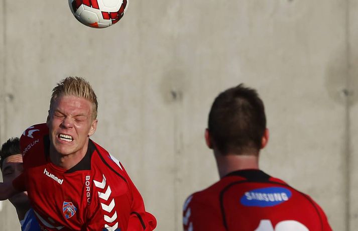Umfjöllun, viðtöl, einkunnir og myndir: Valur - Fram 5-3 Kristinn Páll Teitsson á Vodafonevellinum skrifar 19. maí 2014 16:44 Bjarni Ólafur skorar mark sitt í kvöld. vísir/valli Óhætt er að segja að áhorfendur á Vodafone vellinum hafi fengið nóg fyrir peninginn í 5-3 sigri Vals gegn Fram í Pepsi deildinni í kvöld. Liðin voru jöfn á öllum sviðum fyrir leik kvöldsins. Eftir þrjá leiki höfðu liðin gert eitt jafntefli, tapað einum og unnið einn leik. Í þessum leikjum höfðu liðin skorað þrjú mörk en fengið önnur þrjú á sig.Patrick Pedersen sem gekk til liðs við Val á lokadegi félagsskiptagluggans var kominn í byrjunarliðið og hann átti eftir að láta til sín taka. Hann skoraði fyrsta mark leiksins með snyrtilegu skoti úr vítateignum eftir sendingu Kristins Inga Halldórssonar eftir aðeins tíu mínútna leik.Ósvald Jarl Traustason jafnaði metin skömmu síðar eftir klaufagang í vörn heimamanna. Ósvald var fyrstur að átta sig á slöku skoti Ingibergs Ólafs Jónssonar og renndi boltanum í gegnum klof Fjalars Þorgeirssonar í marki Vals. Bjarni Ólafur Eiríksson kom Valsmönnum aftur yfir stuttu seinna eftir frábæra skyndisókn þegar hann lyfti boltanum snyrtilega yfir Ögmund Kristinsson í marki Fram. Gestirnir úr Safamýrinni jöfnuðu metin skömmu fyrir lok hálfleiksins með afar skrautlegu marki. Fjalar greip fyrirgjöf en er hann lenti virtist hann slá boltanum í Hafstein Briem og þaðan í netið. Áhorfendur voru enn að átta sig á stöðunni þegar Valsmenn komust yfir á ný. Pedersen skoraði annað mark sitt í leiknum aðeins tveimur mínútum seinna. Þá fylgdi Daninn eftir skoti landa síns, Mads Lennarts Nielsen og ýtti boltanum yfir línuna skömmu fyrir leikhlé. Þrátt fyrir að spilamennskan hafi sem slík ekki verið neitt sérstök í fyrri hálfleik gengu liðin til hálfleiks í stöðunni 3-2. Eitthvað virtust þjálfararnir hafa lesið yfir mönnum pistilinn hvað varðar varnarleikinn því í upphafi seinni hálfleiks var jafnræði með liðunum og gekk báðum liðum illa að skapa færi. Eftir tuttugu mínútna leik í seinni hálfleik gengu Valsmenn langt með að klára leikinn. Kristinn Freyr Sigurðsson átti þá fyrirgjöf á fjærstöng sem Einar Bjarni Ómarsson, varnarmaður Framara reyndi að hreinsa en endaði á því að fara af bringunni á Kristni Inga og í netið. Indriði Áki Þorláksson tryggði stigin þrjú eftir góða skyndisókn þegar skammt var til leiksloka. Sigurður Egill Lárusson átti stungusendingu inn fyrir vörn Fram og Indriði kláraði færið listavel. Hafsteinn klóraði í bakkann fyrir gestina á lokamínútu venjulegs leiktíma en lengra komust þeir bláklæddu ekki og flautaði góður dómari leiksins, Kristinn Jakobsson, leikinn af stuttu síðar. Valsmenn geta verið ánægðir með stigin þrjú í kvöld þrátt fyrir að hafa fengið á sig þrjú mörk á heimavelli. Mörkin sem Valsmenn fengu á sig voru vægast sagt skrautleg og mátti auðveldlega koma í veg fyrir þau. Sóknarleikurinn var flottur og er ljóst að Valsmenn eru til alls líklegir ef Patrick Pedersen verður í stuði í sumar. Gestirnir hljóta hinsvegar að vera svekktir með að tapa leiknum þrátt fyrir að hafa skorað þrjú mörk. Valsmenn voru gríðarlega hættulegir í öllum skyndisóknum og gekk varnarmönnum Fram illa að ráða við hraða sóknarlínu Vals í leiknum. Magnús: Meiri gæði í okkar mörkum„Ég er gríðarlega ánægður með sigurinn. Við erum búnir að spila ágætlega í upphafi móts en það vantaði sigra,“ sagði Magnús Gylfason, þjálfari Vals, ánægður í samtali eftir leik. „Ég hefði gefið lélega spilamennsku fyrir sigur í dag en mér fannst allt liðið spila ágætlega í dag. Við spiluðum ágætlega gegn Keflavík og Fjölni en fengum ekki stigin en sem betur fer fengum við stigin þrjú í kvöld.“ Mörkin í dag voru mörg hver í ódýrari kantinum. „Það hefði mátt koma í veg fyrir þeirra mörk, ég þarf að kíkja betur á þetta. Mér fannst aðeins meiri gæði á bak við okkar mörk, örlítið meira spil í þeim. Annað markið er gott dæmi, gott spil sem endar á því að vinstri bakvörðurinn vippar yfir markmanninn.“ „Við ráðum yfir heilmiklum hraða og við reyndum að nýta okkur það í dag með að spila fyrir aftan varnarlínuna. Við þurfum að laga heildar varnarleikinn í liðinu, það er ekki gott að fá á sig þrjú mörk en auðvitað frábært að skora fimm.“ Patrick Pedersen kom sterkur inn í Valsliðið í dag og var besti maður vallarins. „Við vissum hvað hann getur, við sáum það í fyrra og vonandi heldur hann þessu áfram. Hann átti virkilega góðan leik, skoraði tvö mörk og vonandi getur hann haldið þessu áfram.“ Maggi var ánægður að vera kominn aftur á grasið á Vodafone vellinum. „Það er gott að vera kominn aftur, þetta er glæsilegur völlur sem er að koma til og er í þokkalegu standi. Þið sáuð það á leiknum í dag, hann er grænn og flottur,“ sagði Maggi að lokum. Bjarni: Refsuðu okkur við hvert tækifæri„Það var skemmtun í þessu fyrir áhorfendur en þetta er ekkert sérstaklega skemmtilegt fyrir okkur núna,“ sagði Bjarni Guðjónsson, þjálfari Fram, svekktur eftir leikinn. „Að skora þrjú mörk á útivelli á undir flestum kringumstæðum að tryggja okkur þrjú stig og þessvegna er þetta gríðarlega svekkjandi. Valsliðið er mjög sterkt og þeir refsuðu okkur við hvert tækifæri í kvöld,“ Þrátt fyrir að ekki væri mikið um færi í leiknum voru alls átta mörk skoruð í leiknum. „Þetta var vissulega mjög skrýtið, ég er sammála því að það voru ekki mörg færi í þessum leik. Þeir eru með fljóta kantmenn og komnir með frábæran framherja í Pedersen og þeir refsuðu okkur grimmilega í hvert skipti sem þeir fengu tæki