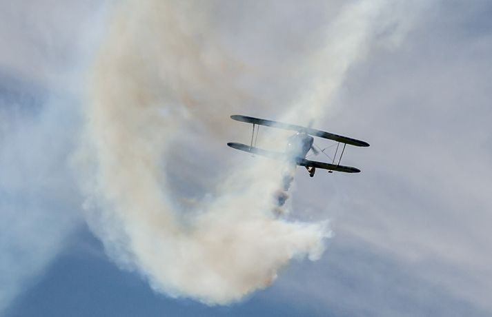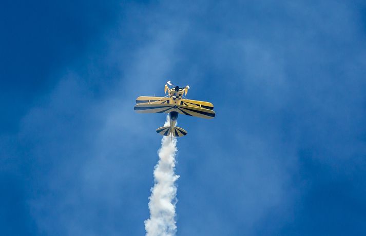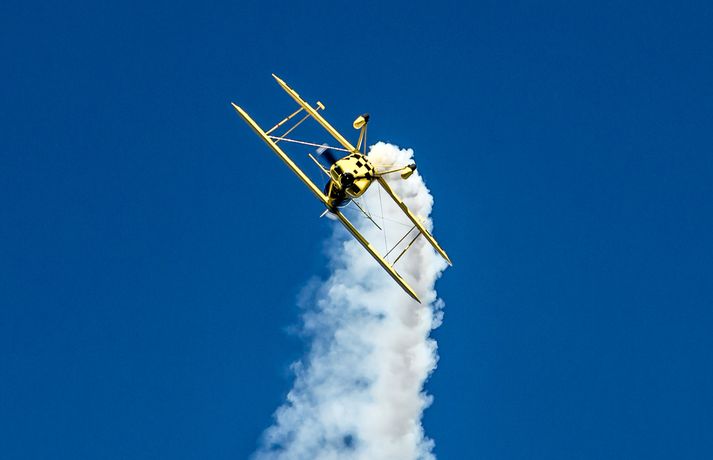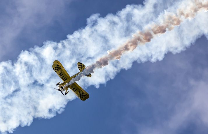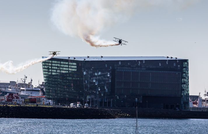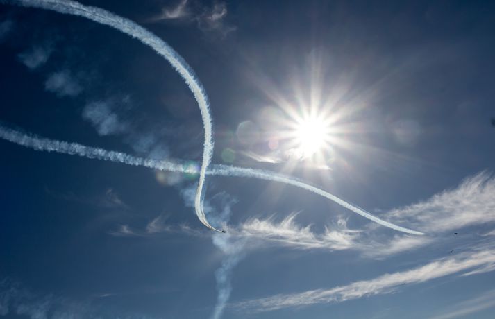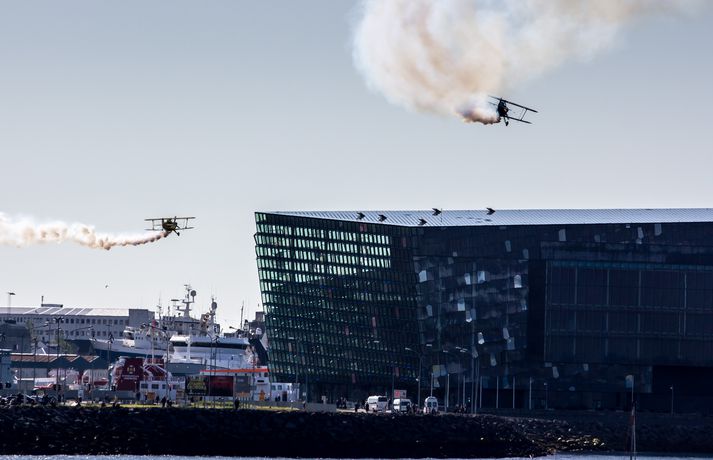 Verk eftir Ragnheiði Hörpu Leifsdóttur með þátttöku listflugmannanna Sigurðar Ásgeirssonar, Björns Thors og Kristjáns Þórs Kristjánssonar og kórsins Kötlu, var flutt seinnipartinn í dag yfir Kollafirði en um var að ræða lokaverk Listahátíðar 2014. Tvær listflugvélar sem Björn Thors og Kristján Þór Kristjánsson flugu, teiknuðu form í háloftinu sem kórinn Katla túlkaði í söng en honum var útvarpað í þættinum Víðsjá á meðan á fluginu stóð. Annar flugmannanna, Björn Thors, er jafnframt sjálflærður flugvélasmiður og smíðaði vélina sem hann flýgur í verkinu en hún er nú í eigu Sigurðar Ásgeirssonar. Verkið stóð yfir í um átta mínútur en listflug krefst sérstakra veðurskilyrða. Egill Aðalsteinsson, myndatökumaður Stöðvar 2, tók þessar frábæru myndir í dag. visir/egill aðalsteinsson