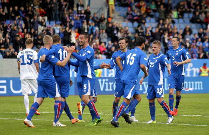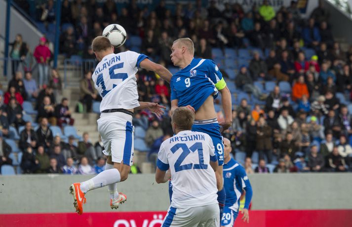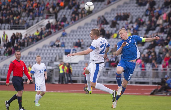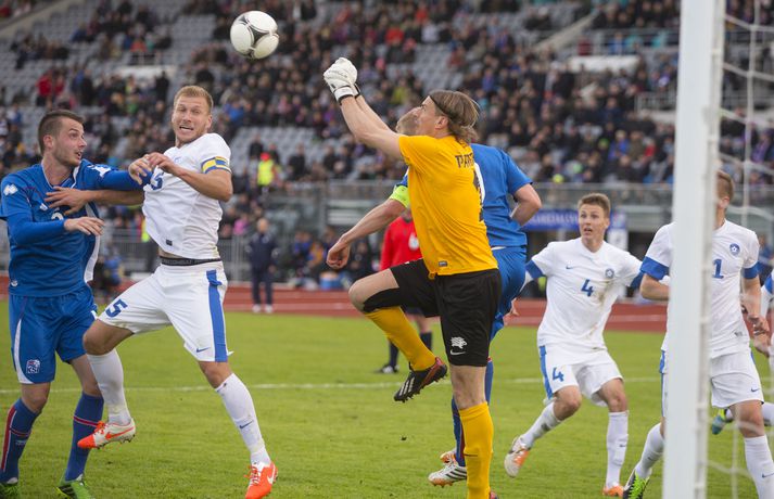 Umfjöllun, viðtöl, einkunnir og myndir: Ísland - Eistland 1-0 | Kolbeinn kom til bjargar Henry Birgir Gunnarsson á Laugardalsvelli skrifar 4. júní 2014 16:58 Leikmennirnir fagna marki Kolbeins Vísir/Andri Ísland lagði Eistland í tilþrifalitlum og leiðinlegum leik á Laugardalsvelli í kvöld. Kolbeinn Sigþórsson skoraði eina mark leiksins.Daníel Rúnarsson og Andri Marinó Karlsson, ljósmyndarar Fréttablaðsins og Vísis, tóku skemmtilegar myndir sem sjá má hér í myndaveislunni að ofan. Eins og við mátti búast lágu Eistarnir frekar aftarlega og leyfðu Íslendingum að vera með boltann. Okkar mönnum gekk ekkert sérstaklega vel að stýra ferðinni og búa til færi. Ísland fékk aðeins tvo færi í hálfleiknum og það fyrra kom eftir tæpan hálftíma. Aron Einar með skot yfir markið og svo átti Kolbeinn skalla í slá skömmu síðar. Það var allt og sumt sem íslenska liðið bauð upp á. Eistarnir þurftu oft ekki að hafa mikið fyrir því að stoppa sóknir íslenska liðsins. Strákunum gekk illa að koma boltanum í fætur framherjanna og sendingarnar fyrir voru oft ekki í háum gæðaflokki. Skyndisóknir Eistanna voru nokkrar hættulegar og þeir fengu bestu færi leiksins. Einu sinni bjargaði sláin og svo átti Gunnleifur gott úthlaup er einn Eistinn var kominn í gegn. Markalaust í leikhléi og íslenska liðið átti mikið inni. Landsliðsþjálfar Íslands gerðu þrefalda skiptingu í hálfleik og nýliðinn Ögmundur Kristinsson hóf landsliðsferil sinn með því að verja glæsilega úr algjöru dauðafæri strax í upphafi seinni hálfleiks. Íslenska liðið stálheppið. Lukkan var aftur í liði með Íslandi er það fékk vítaspyrnu upp úr þurru. Rúrik með boltann í teignum og brotið klaufalega á honum. Kolbeinn tók vítið og skoraði af öryggi. Fimmtánda landsliðsmarkið hans. Ótrúlegur árangur. Eftir markið gekk íslenska liðinu betur að stjórna leiknum. Meiri kraftur í strákunum og hreyfing. Sem fyrr gekk þó ekkert vel að skapa opin færi í opnum leik. Hallgrímur fékk dauðafæri stundarfjórðungi fyrir leikslok eftir aukaspyrnu en skot hans hitti ekki markið. Eistarnir virkuðu bensínlausir á lokakaflanum og leikurinn opnaðist aðeins fyrir vikið. Leikmenn þó ekkert sérstaklega áfjáðir að klára sig nema kannski varamennirnir. Fyrir utan nokkra smákippi þá gerðist lítið á lokamínútunum og Ísland sigldi heim sigri sem fer nú ekki í sögubækurnar. Leikurinn var frekar leiðinlegur eins og vináttuleikir eiga til að vera. Leikmenn á rétt rúmlega hálfum hraða lengstum. Íslenska liðið vann alls ekki sanngjarnan sigur. Eistarnir á löngum köflum hættulegri og hefðu hæglega getað refsað íslenska liðinu. Það var svo þeirra eigin klaufaskapur sem varð þeim að falli. Það er erfitt að dæma leikmenn eftir svona leik þar sem ekkert er undir og margir komnir með hugann við sumarfríið. Varnarleikur Íslands var á köflum brothættur og sóknarleikurinn hefði sannarlega mátt vera hraðari og kraftmeiri. Upp úr stendur sigur í bókina og enn eitt markið hjá Kolbeini sem getur ekki hætt að skora í landsleikjum. Íslenska liðið getur þó mikið betur en það sýndi í þessum leik. Gylfi: Vantaði meiri hraða í leikinnGylfi Sigurðsson, miðjumaður Íslands, var þokkalega sáttur með leikinn gegn Eistlandi í kvöld. Hann sagði þó íslenska liðið eiga mikið inni. „Það er alltaf gott að halda hreinu. Hefði þetta verið alvöru leikur hefðum við sett miklu meiri hraða í leikinn," sagði Gylfi við fjölmiðla. Leikurinn var síðasti undirbúningsleikur Íslands áður en undankeppni Evrópumótsins hefst næsta haust. „Það var gott að koma saman hópurinn. Við náðum að fara yfir fullt af hlutum síðustu tíu daga og það var fínt." „Það var mikilvægt fyrir flesta að koma heilir út úr leiknum. Ég er aðeins búinn að æfa þrisvar sinnum síðasta mánuðinn og það var mikilvægt að komast út úr þessu heill heilsu. Núna getur maður tekið smá frí áður en maður byrjar aftur." Voru Eistar betri en Íslendingar bjuggust við? „Ég held að við höfum verið aðeins slappari en við bjuggumst við. Ef allir okkar menn hefðu verið á miðju tímabili þá hefðum við valtað yfir þetta lið." „Það var kjörið tækifæri fyrir að gefa öðrum mönnum tækifæri, þeim sem hafa verið við hópinn. Ég held að það hafi verið tveir sem voru að spila sinn fyrsta landsleik og það er jákvætt." Næsti leikur er í undankeppninni gegn Tyrkjum. Aðspurður hvort Gylfi hefði verið til í einn æfingarleik í viðbót var Gylfi ekki alveg viss. „Auðvitað hefði verið fínt að fá einn leik í viðbót, en ég held að við höfum náð að fara yfir það sem við vildum á fundunum í Austurríki og hér heima þannig ég held að þetta sé bara fínt," sagði Gylfi Þór Sigurðsson í leikslok. Heimir: Ísland vinnur aldrei leiki án rétta hugarfarsins„Við erum ekkert of ánægðir með frammistöðuna, þannig séð, en við erum ánægðir með sigurinn og ánægðir með að halda hreinu," sagði Heimir Hallgrímsson, annar landsliðsþjálfara Íslands eftir sigurinn á Eistlandi í kvöld. En hvað var það sem þjálfararnir lögðu upp með fyrir leik og hvernig fannst Heimi það ganga upp? „Við ætluðum að setja pressu á þá og bjuggust við því að þeir yrðu þéttir til baka. En þeir beittu löngum sendingum og við náðum ekki að vinna úr því og það var kannski klaufaskapur af okkar hálfu að bakka ekki aðeins og leyfa þeim að spila út." „Við ætluðum að reyna að koma með boltann fyrr inn fyrir vörn þeirra, en spilið var hægt hjá okkur og það var ekki sama viðhorf og hefur verið," sagði Heimir, en er hann bjartsýnni á framhaldið en hann var fyrir leikina gegn Austurríki og Eistlandi? "Það verður 