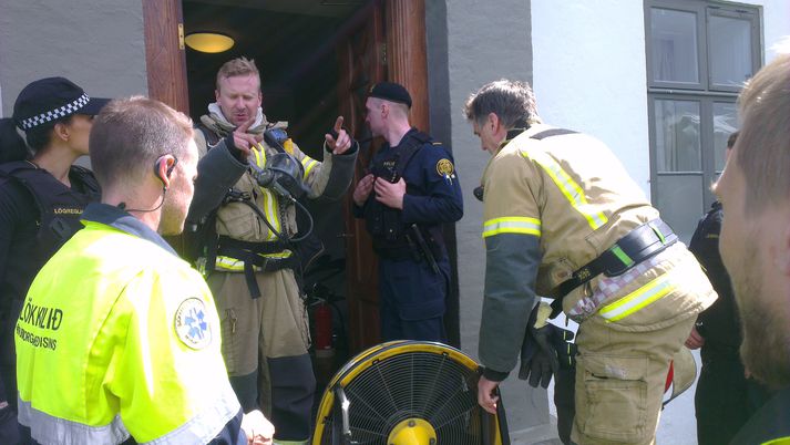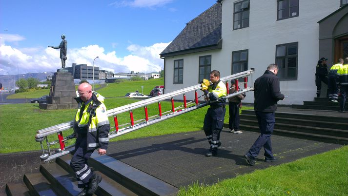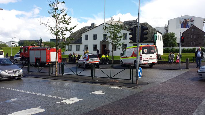 Rýmingaræfing fór fram í stjórnarráðinu nú fyrir skömmu. Um var að ræða æfingu þar til að tryggja öryggi æðstu stjórnar ríkisins en í slíkum æfingum taka lögreglan, slökkviliðið, fjarskiptamiðstöð forsætisráðuneytisins og sérsveitin þátt samkvæmt upplýsingum frá lögreglunni. „Það björguðust allir,“ segir Sigurður Már Jónsson upplýsingafulltrúi ríkisstjórnarinnar léttur í bragði. Hann segir aðeins um tilfallandi rýmingaræfingu að ræða sem ákveðið hafi verið að ráðast í til að skerpa á ferlum. „Ég vissi ekki af þessu og fæstir starfsmenn utan þeirra sem hafa einhver ákveðin verkefni, rýmingarfulltrúar, þeir vissu þetta.“ Hann segir æfinguna hafa gengið vel. „Það voru svona smáhnökrar hér og þar, þetta er náttúrulega verndað hús í bak og fyrir sem gerir það kannski erfiðara fyrir að setja upp þann búnað sem þarf þannig að menn þurfa að hafa ákveðna útsjónarsemi í kringum það. En þetta gekk allt vel.“Mikill viðbúnaður var við stjórnarráðið vegna æfingarinnar.Mynd/Jón BjarniMargar stofnanir tóku þátt í æfingunni í dag.Vísir/Andri MarinóSlökkviliðið var meðal þátttakenda í rýmingaræfingunni.Vísir/Andri MarinóSigmundur Davíð og Jörundur Valtýsson ráðgjafi ráðherra í utanríkismálum fyrir utan stjórnarráðið.Vísir/Andri Marinó