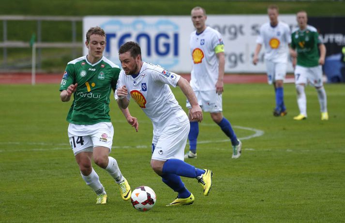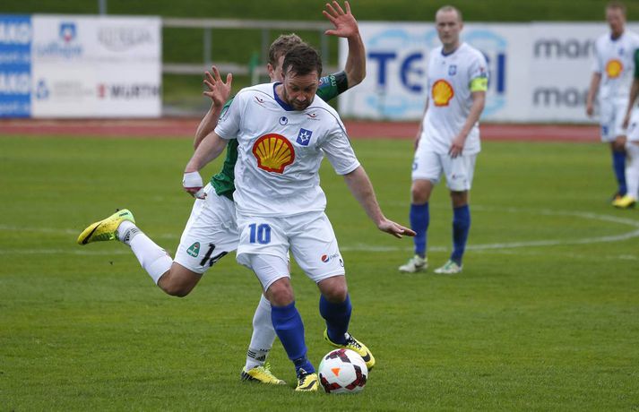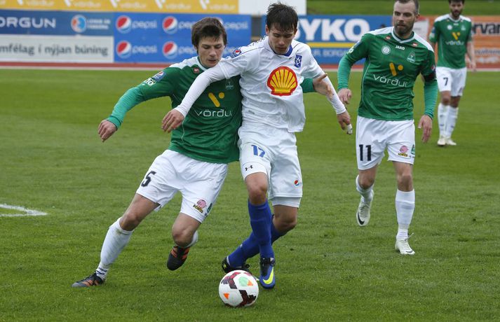 Umfjöllun, viðtöl og myndir: Breiðablik - Stjarnan 1-1 | Óli kvaddi Daníel Rúnarsson á Kópavogsvelli skrifar 2. júní 2014 15:50 Ólafur og arftakinn í lokaleik Ólafs. Vísir/stefán Breiðablik og Stjarnan gerðu 1-1 jafntefli á Kópavogsvelli í kvöld en leikurinn var kveðjuleikur Ólafs Kristjánssonar, þjálfara Breiðabliks. Ólafur kveður því Kópavogsliðið í fallsæti, með fjögur stig að loknum sex leikjum. Blikar eru því enn án sigurs í deildinni. Ekki óskastaða fyrir Guðmund Benediktsson sem tekur nú við starfi aðalþjálfara af Ólafi. Stjörnumenn eru hinsvegar taplausir í deildinni þetta tímabilið en eru þó vafalaust ósáttir við að fá einungis eitt stig út úr leiknum í kvöld. Blikar stilltu upp í mjög færanlegt 3-5-2 leikkerfi þar sem vængbakverðir sóttu hátt á völlinn en hjálpuðu einnig vel til í varnarvinnunni. Garðbæingar notuðust hinsvegar við 4-3-3 með þá Ólaf Karl Finsen, Jeppe Hansen og Veigar Pál Gunnarsson í sókninni. Leikurinn var opinn og fjörugur frá fyrstu mínútu þegar blikar fengu hættulegt færi eftir klaufagang hjá Ingvari Jónssyni í marki Stjörnunnar. Liðin skiptust á að sækja að marki þó sóknaraðgerðir Stjörnumanna hafi verið markvissari og hættulegri. Á 19. mínútu skoraði Niclas Vemmelund stórglæsilegt mark með skoti frá vítateigshorni beint upp í vinkilinn fjær eftir sendingu frá Veigari Pál Gunnarssyni. Óverjandi fyrir Gunnleif í markinu. Veigar Páll átti mjög góðan leik í kvöld og var mikilvægasti hlekkurinn í sóknarleik gestanna úr Garðabæ. Veigar lék allan leikinn í kvöld og það er ljóst að hann er að komast í mjög gott leikform sem gæti reynst Stjörnumönnum afar dýrmætt í sumar. Seinni hálfleikurinn var ekki eins fjörugur þó áhorfendur hafi varla haft yfir neinu að kvarta. Töluverð harka færðist í leikinn og þurfti ágætur dómari leiksins, Kristinn Jakobsson, ítrekað að teygja sig í brjóstvasann eftir gula spjaldinu. Stjörnumenn höfðu frumkvæðið framan af en þegar líða tók á leikinn jókst pressa heimamanna töluvert. Hún bar loks árangur á 74. mínútu þegar Elvar Páll Sigurðsson skoraði og jafnaði þar með leikinn eftir stoðsendingu frá Tómasi Óla Garðarssyni. Skömmu síðar fékk Árni Vilhjálmsson sitt annað gula spjald og þar með rautt. Með því fjöruðu möguleikar blika á að sækja öll þrjú stigin út í sandinn. Bæði lið fengu möguleika á að skora sigurmark á lokamínútum leiksins. Blikinn Tómas Óli Garðarsson komst í hættulegt færi eftir misheppnað skot liðsfélaga síns og Niclas Vemmelund fékk jafnframt fínt færi fyrir Stjörnumenn sem hann nýtti ekki. Svo fór að lokum að liðin skildu jöfn, 1-1. Ungur leikmaður í liði Breiðabliks, Höskuldur Gunnlaugsson, vakti athygli fyrir góða frammistöðu en hann er fæddur árið 1994. Höskuldur lék í hægri vængbakverði og skilaði því hlutverki afar vel. Efnilegur leikmaður þar á ferð. Eins og áður sagði var Veigar Páll Gunnarsson afar góður í liði Stjörnunnar og var hann maður leiksins að mati Vísis. Viðtöl væntanleg síðar í kvöld.Ólafur Kristjánsson: Tók við í fallsæti og skila liðinu í fallsæti Kveðjuleikur Ólafs Kristjánssonar með Breiðabliksliðið fór ekki eins vel og hann hefði vafalaust óskað. En var tilfinningaþrungin stund inni í klefa að leik loknum? „Ekki beint þrungin. Margir hlutir í lífinu eru meira tilfinningaþrungnir en þetta, en þetta kemur þó við viðkvæmar sálir, eins og ég er. Nú er maður svona að átta sig á því að þessu tímabili er lokið. " En hvað fannst Ólafi um leikinn í kvöld? „Ég er hundfúll með að hafa ekki náð að skila sigri og fleiri stigum. Mér fannst menn vera að reyna. Fyrri hálfleikur einkenndist af því að við erum lið sem er búið að vera í vandræðum í upphafi móts, ákveðin vandræði á okkur. En ég er ánægður með að við komum til baka eftir að hafa lent undir. Það er það sem ég hef viljað sjá og vil sjá í framtíðinni hjá Breiðabliksliðinu, að gefast aldrei upp. Ég er sannfærður um að ef menn hafa það hugarfar þá munu fleiri stig koma í hús." Fjögur stig eftir sex leiki er rýr uppskera hjá Breiðablik. Hvað hefur helst vantað í leik liðsins? „Það hefur helst vantað uppá bæði að skapa færi og svo nýta þau færi sem hafa gefist. En oft hefur bara vantað herslumuninn uppá til að hala inn fleiri stig." „Ég tók við liðinu í fallsæti á sínum tíma og skila því af mér í fallsæti, þannig að hringnum er lokað. En auðvitað er það hundfúlt að vera ekki með fleiri stig. Það er enginn svekktari með það en ég, og ég ber fulla ábyrgð á því - eins og velgengninni þegar hún kom." Ólafur samdi við FC Nordsjælland fyrir tímabilið en stýrði liðinu samt sem áður í fyrstu sex leikjunum í deildinni. Hafði það áhrif að hans mati og vildi hann hætta fyrr? „Ég hafði ekkert val um það. Ég er með samning og ég uppfylli bara mínar skyldur með glöðu gleði. En ef þú spyrð mig þá tengist gengi liðsins ekkert því að ég sé að fara út. Ef þú spyrð mig þá tengist þetta [gengi liðsins] ekkert því að ég sé að fara út. Ef liðið hefði verið með fjögur stig og ég ekki með liðið þessa sex leiki og Gummi hefði staðið hérna þá hefði spurningin sennilega verið hvort það hefði ekki verið rangt að hann hafi tekið við liðinu strax." Guðmundur Benediktsson tekur nú við Breiðabliksliðinu. Hvaða möguleika telur Ólafur liðið eiga það sem eftir lifir tímabils? „Liðið á hellings möguleika. Leiðin getur bara legið uppá við. Fallsæti í byrjun júní þarf ekki að þýða fallsæti í lok móts. Það býr mikið í liðinu og það verður spennandi að sjá Guðmund glíma við verkefni