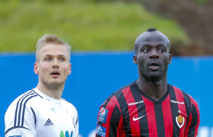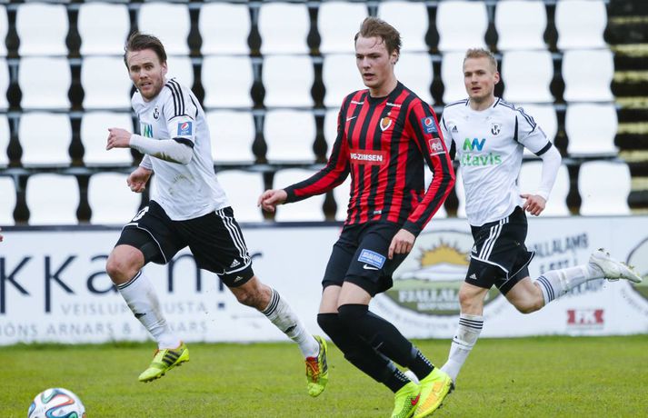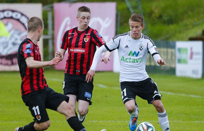 Umfjöllun, viðtöl, einkunnir og myndir: FH - Víkingur 1-0 | Enn skorar Atli Viðar Ingvi Þór Sæmundsson skrifar 1. júní 2014 14:01 Vísir / Vilhelm Gunnarsson Þriðja mark Atla Viðars Björnssonar í sumar tryggði FH 1-0 sigur á Víkingi R. í hörkuleik í Kaplakrika í kvöld. FH-ingar byrjuðu leikinn mun betur; héldu boltanum vel og settu Víkinga undir mikla pressu sem þeir áttu í vandræðum með að leysa.Atlarnir, Viðar Björnsson og Guðnason gerðu sig líklega til að skora snemma leiks, en það var Keflvíkingurinn Hólmar Örn Rúnarsson sem komst næst því að skora fyrir FH á 12. mínútu þegar skot hans fyrir utan vítateig hafnaði í slá Víkingsmarksins. Atli Viðar fékk sömuleiðis gott færi til að skora á 29. mínútu, en hann náði ekki miklum krafti í skotið sem Ingvar Þór Kale átti ekki í miklum vandræðum með. Annars vörðust gestirnir vel. Varnarlínan lá aftarlega og fyrir framan hana voru fyrirliðinn Igor Taskovic og Kristinn Magnússon sterkir. Víkingar áttu hins vegar varla teljandi sókn í fyrri hálfleiknum og þeir hefðu að ósekju mátt vera hugrakkari að halda boltanum eins og Ólafur Þórðarson, þjálfari liðsins, sagði í viðtali við undirritaðan eftir leik. Það er ekkert leyndarmál að sóknarleikur Víkinga stendur og fellur með Aroni Elís Þrándarsyni og það hlýtur að vera áhyggjuefni fyrir Ólaf hversu háð liðið er þessum tvítuga strák í sóknarleiknum. Aron kom inn á í hálfleik ásamt Agnari Darra Sverrissyni og hann lífgaði sóknarleik Víking við. Með innkomu hans náðu Víkingar að halda boltanum betur og þeir fóru að ógna marki FH. Aron átti tvær ágætar tilraunir, en það var á 64. mínútu sem Víkingar fengu sitt besta færi þegar Pape Mamadou Faye slapp einn í gegnum FH-vörnina eftir stungusendingu Todors Hristov. Pape reyndi að skjóta boltanum milli fóta Róberts Arnars Óskarssonar sem sá við framherjanum og varði vel. Þetta reyndist vendipunktur leiksins. Tíu mínútum síðar slapp Atli Viðar í gegnum Víkingsvörnina eftir þríhyrningsspil við varamanninn Sam Hewson og Dalvíkingnum urðu ekki á nein mistök, ólíkt kollega sínum í Víkingsliðinu. Eftir markið spiluðu FH-ingar sinn besta fótbolta í leiknum. Þeir héldu boltanum vel og drógu smám saman kraftinn úr Víkingsliðinu. Heimamenn fengu svo kjörið tækifæri til að bæta við forystuna þegar Tómas Guðmundsson braut á Atla Guðnasyni innan vítateigs. Ingimundur Níels Óskarsson steig á punktinn en Ingvar varði spyrnu hans frábærlega. Fleiri urðu mörkin ekki og FH-ingar fögnuðu sínum fjórða sigri í sumar. Hafnfirðingar sitja nú á toppi Pepsi-deildarinnar með 14 stig, þremur fleiri en Keflavík sem gerði jafntefli við Fjölni í kvöld. FH hefur aðeins skorað átta mörk í leikjunum sex og sóknarleikur liðsins hefur ekki verið jafn öflugur og við höfum átt að venjast. Vörnin hefur hins vegar verið ógnarsterk, en FH hefur haldið fjórum sinnum hreinu í deildinni. Víkingar spiluðu fínan leik og áttu alla möguleika á að fara heim með stig. Færið sem Pape misnotaði reyndist þeim hins vegar dýrkeypt, sem og augnabliks einbeitingarleysi í vörninni þegar Atli Viðar slapp í gegn. Víkingar eru samt sem áður í ágætis málum með sjö stig í 7. sæti deildarinnar. Stuðningsmenn liðsins hljóta hins vegar að krossleggja fingur og vonast til að Aron Elís haldist heill. Annars gæti farið illa. Heimir: Með innkomu Hewsons fór boltinn að ganga beturVísir/Vilhelm"Það sem skóp sigurinn var að Atli Viðar Björnsson var réttur maður á réttum stað og kláraði þetta fyrir okkur, en leikur liðsins hefði á köflum mátt vera betri," sagði Heimir Guðjónsson, þjálfari FH eftir sigur hans manna á Víkingum í kvöld. FH-ingar voru meira með boltann í fyrri hálfleik en náðu ekki að skapa sér mikið af góðum færum. "Það sem var að í fyrri hálfleik, og einnig í þeim seinni, var að við vorum að spila boltanum of mikið í sömu svæðunum í staðinn fyrir að færa boltann milli vængjanna og hreyfa Víkinganna til. "Víkingar spiluðu mjög vel fyrstu 20-25 mínúturnar í seinni hálfleik og þá vorum við ekki nógu nálægt mönnunum okkar, vorum of staðir og áttum of margar lélegar sendingar," sagði Heimir, en tvöfalda skiptingin sem hann gerði á 70. mínútu virkaði mjög vel. "Mér fannst þeir lífga upp á leik liðsins. Bæði Ingimundur Níels Óskarsson og Sam Hewson eru frábærir leikmenn og með innkomu Hewsons fór boltinn að ganga betur. Hann tók boltann og skipti honum milli kanta og Ingimundur var einnig frískur." FH situr í toppsæti Pepsi-deildarinnar með 14 stig eftir sex leiki. En hefur Heimir áhyggjur af því að FH skuli ekki vera búið að skora nema átta mörk í leikjunum sex. "Nei, við höfum ekki áhyggjur af sóknarleiknum, en við þurfum að skora meira," sagði Heimir að lokum. Ólafur: Vorum skíthræddir við að spila fótbolta í fyrri hálfleikVísir/Vilhelm"Það er auðvitað ljóst að í staðinn fyrir að komast í 1-0, þá lendum við undir skömmu síðar. Auðvitað er mikilvægt að menn klári færin sín, en því miður hafa FH-ingar það mikil gæði að þeir þurfa ekki mörg færi til að skora. Á meðan þurfum við kannski helmingi fleiri færi en þeir til að skora mörk," sagði Ólafur Þórðarson, þjálfari Víkinga, um færið sem Pape Mamadou Faye fékk eftir rúmlega klukkutíma leik. Víkingar spiluðu sterkan varnarleik lengst af leiks, en Ólafur var óánægður með sóknarleik sinna manna í fyrri hálfleiknum. "Við náðum að loka mjög vel á þá allan fyrri hálfleikinn, en það olli okkur smá vandræðum að við þorðum ekki að spila boltanum. Við vorum skíthræddir við að spila fótbolta í fyrri hálfleik, en með innkomu Arons (Elísar Þrándarsonar) þá f