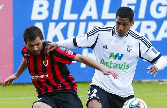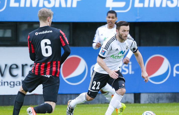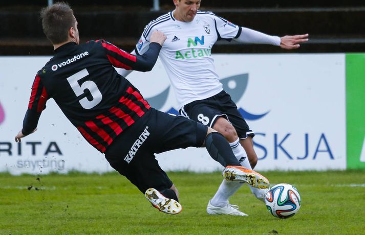 Þriðja mark Atla Viðars Björnssonar í sumar tryggði FH 1-0 sigur á Víkingi R. í hörkuleik í Kaplakrika í kvöld. FH-ingar byrjuðu leikinn mun betur; héldu boltanum vel og settu Víkinga undir mikla pressu sem þeir áttu í vandræðum með að leysa.Atlarnir, Viðar Björnsson og Guðnason gerðu sig líklega til að skora snemma leiks, en það var Keflvíkingurinn Hólmar Örn Rúnarsson sem komst næst því að skora fyrir FH á 12. mínútu þegar skot hans fyrir utan vítateig hafnaði í slá Víkingsmarksins. Atli Viðar fékk sömuleiðis gott færi til að skora á 29. mínútu, en hann náði ekki miklum krafti í skotið sem Ingvar Þór Kale átti ekki í miklum vandræðum með. Annars vörðust gestirnir vel. Varnarlínan lá aftarlega og fyrir framan hana voru fyrirliðinn Igor Taskovic og Kristinn Magnússon sterkir. Víkingar áttu hins vegar varla teljandi sókn í fyrri hálfleiknum og þeir hefðu að ósekju mátt vera hugrakkari að halda boltanum eins og Ólafur Þórðarson, þjálfari liðsins, sagði í viðtali við undirritaðan eftir leik. Það er ekkert leyndarmál að sóknarleikur Víkinga stendur og fellur með Aroni Elís Þrándarsyni og það hlýtur að vera áhyggjuefni fyrir Ólaf hversu háð liðið er þessum tvítuga strák í sóknarleiknum. Aron kom inn á í hálfleik ásamt Agnari Darra Sverrissyni og hann lífgaði sóknarleik Víking við. Með innkomu hans náðu Víkingar að halda boltanum betur og þeir fóru að ógna marki FH. Aron átti tvær ágætar tilraunir, en það var á 64. mínútu sem Víkingar fengu sitt besta færi þegar Pape Mamadou Faye slapp einn í gegnum FH-vörnina eftir stungusendingu Todors Hristov. Pape reyndi að skjóta boltanum milli fóta Róberts Arnars Óskarssonar sem sá við framherjanum og varði vel. Þetta reyndist vendipunktur leiksins. Tíu mínútum síðar slapp Atli Viðar í gegnum Víkingsvörnina eftir þríhyrningsspil við varamanninn Sam Hewson og Dalvíkingnum urðu ekki á nein mistök, ólíkt kollega sínum í Víkingsliðinu. Eftir markið spiluðu FH-ingar sinn besta fótbolta í leiknum. Þeir héldu boltanum vel og drógu smám saman kraftinn úr Víkingsliðinu. Heimamenn fengu svo kjörið tækifæri til að bæta við forystuna þegar Tómas Guðmundsson braut á Atla Guðnasyni innan vítateigs. Ingimundur Níels Óskarsson steig á punktinn en Ingvar varði spyrnu hans frábærlega. Fleiri urðu mörkin ekki og FH-ingar fögnuðu sínum fjórða sigri í sumar. Hafnfirðingar sitja nú á toppi Pepsi-deildarinnar með 14 stig, þremur fleiri en Keflavík sem gerði jafntefli við Fjölni í kvöld. FH hefur aðeins skorað átta mörk í leikjunum sex og sóknarleikur liðsins hefur ekki verið jafn öflugur og við höfum átt að venjast. Vörnin hefur hins vegar verið ógnarsterk, en FH hefur haldið fjórum sinnum hreinu í deildinni. Víkingar spiluðu fínan leik og áttu alla möguleika á að fara heim með stig. Færið sem Pape misnotaði reyndist þeim hins vegar dýrkeypt, sem og augnabliks einbeitingarleysi í vörninni þegar Atli Viðar slapp í gegn. Víkingar eru samt sem áður í ágætis málum með sjö stig í 7. sæti deildarinnar. Stuðningsmenn liðsins hljóta hins vegar að krossleggja fingur og vonast til að Aron Elís haldist heill. Annars gæti farið illa. Heimir: Með innkomu Hewsons fór boltinn að ganga beturVísir/Vilhelm"Það sem skóp sigurinn var að Atli Viðar Björnsson var réttur maður á réttum stað og kláraði þetta fyrir okkur, en leikur liðsins hefði á köflum mátt vera betri," sagði Heimir Guðjónsson, þjálfari FH eftir sigur hans manna á Víkingum í kvöld. FH-ingar voru meira með boltann í fyrri hálfleik en náðu ekki að skapa sér mikið af góðum færum. "Það sem var að í fyrri hálfleik, og einnig í þeim seinni, var að við vorum að spila boltanum of mikið í sömu svæðunum í staðinn fyrir að færa boltann milli vængjanna og hreyfa Víkinganna til. "Víkingar spiluðu mjög vel fyrstu 20-25 mínúturnar í seinni hálfleik og þá vorum við ekki nógu nálægt mönnunum okkar, vorum of staðir og áttum of margar lélegar sendingar," sagði Heimir, en tvöfalda skiptingin sem hann gerði á 70. mínútu virkaði mjög vel. "Mér fannst þeir lífga upp á leik liðsins. Bæði Ingimundur Níels Óskarsson og Sam Hewson eru frábærir leikmenn og með innkomu Hewsons fór boltinn að ganga betur. Hann tók boltann og skipti honum milli kanta og Ingimundur var einnig frískur." FH situr í toppsæti Pepsi-deildarinnar með 14 stig eftir sex leiki. En hefur Heimir áhyggjur af því að FH skuli ekki vera búið að skora nema átta mörk í leikjunum sex. "Nei, við höfum ekki áhyggjur af sóknarleiknum, en við þurfum að skora meira," sagði Heimir að lokum. Ólafur: Vorum skíthræddir við að spila fótbolta í fyrri hálfleikVísir/Vilhelm"Það er auðvitað ljóst að í staðinn fyrir að komast í 1-0, þá lendum við undir skömmu síðar. Auðvitað er mikilvægt að menn klári færin sín, en því miður hafa FH-ingar það mikil gæði að þeir þurfa ekki mörg færi til að skora. Á meðan þurfum við kannski helmingi fleiri færi en þeir til að skora mörk," sagði Ólafur Þórðarson, þjálfari Víkinga, um færið sem Pape Mamadou Faye fékk eftir rúmlega klukkutíma leik. Víkingar spiluðu sterkan varnarleik lengst af leiks, en Ólafur var óánægður með sóknarleik sinna manna í fyrri hálfleiknum. "Við náðum að loka mjög vel á þá allan fyrri hálfleikinn, en það olli okkur smá vandræðum að við þorðum ekki að spila boltanum. Við vorum skíthræddir við að spila fótbolta í fyrri hálfleik, en með innkomu Arons (Elísar Þrándarsonar) þá fengum við leikmann sem hélt boltanum vel og hann kom með meiri gæði í sóknarleik okkar. "Það vantaði bara pung á okkur til að spila fótbolta í fyrri hálf