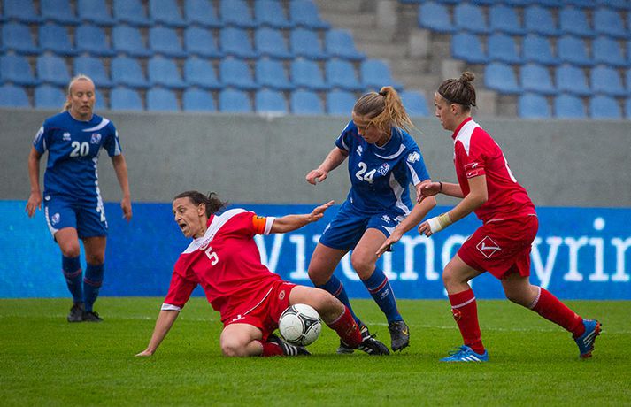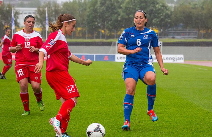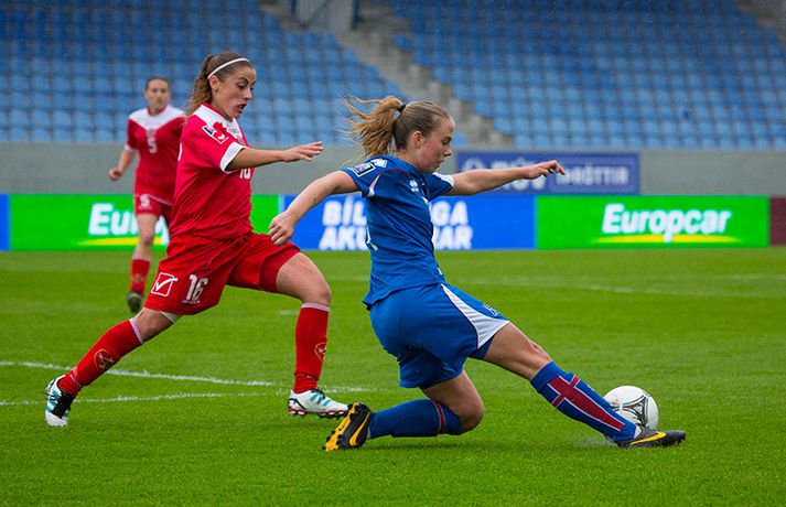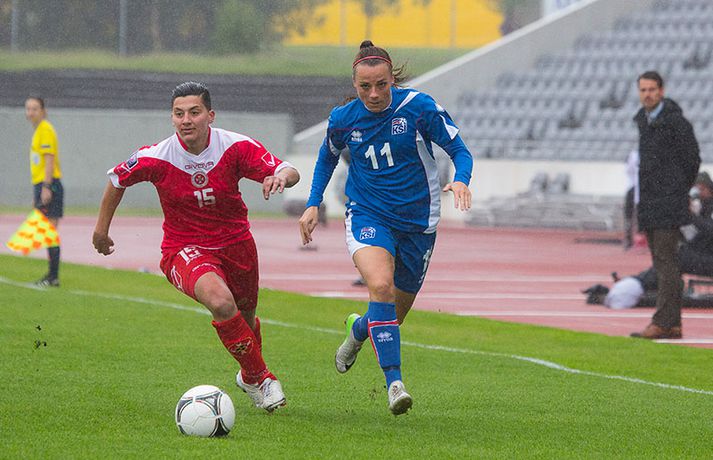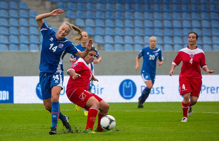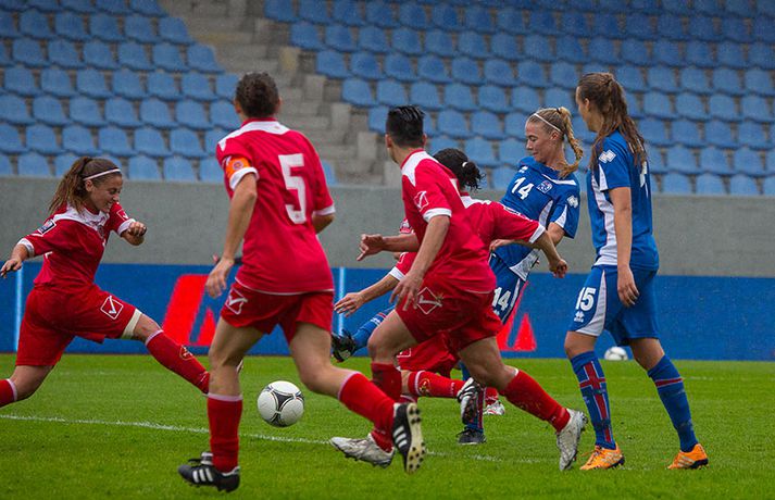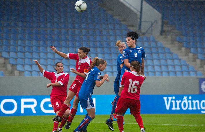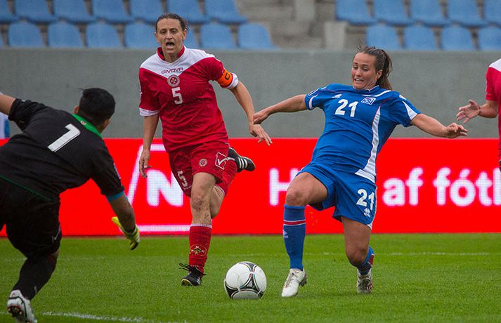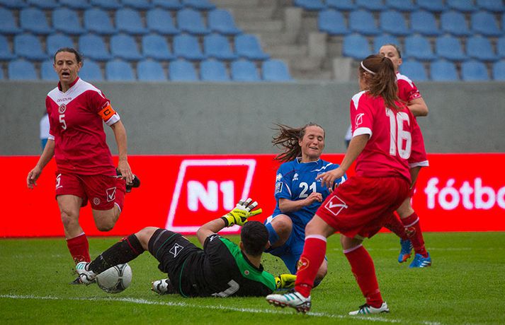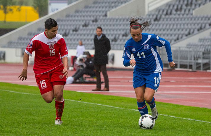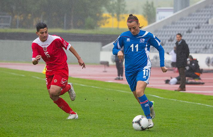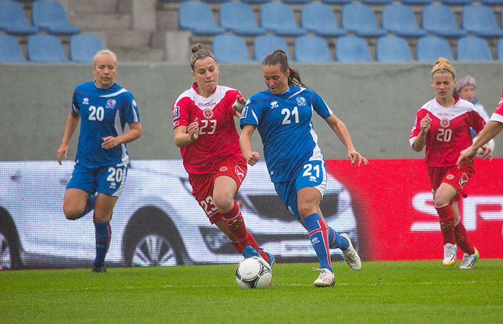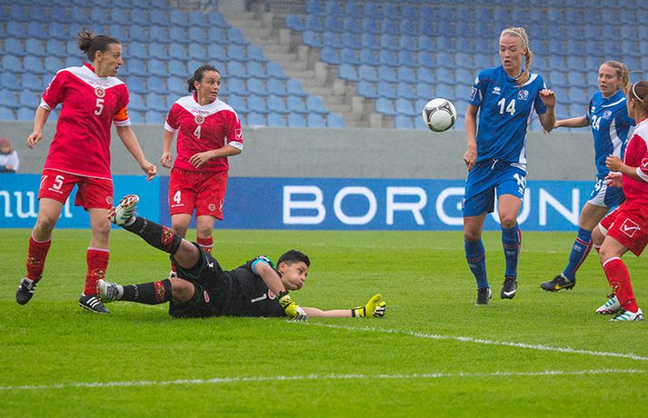 Íslenska kvennalandsliðið í fótbolta fór létt með Möltu 5-0 á Laugardalsvelli í undankeppni heimsmeistarakeppninnar sem fram fer í Kanada næsta sumar. Ísland var 3-0 yfir í hálfleik. Leikurinn var aldrei spennandi. Ísland var mikið sterkari aðilinn frá fyrstu mínútu til þeirrar síðustu og hefði liðið í raun getað skorað mun fleiri mörk. Framherji Möltu fékk ekkert að gera fram á við í leiknum því liðið kom boltanum varla inn á vallarhelming Íslands, slíkir voru yfirburðirnir. Það tók Ísland tólf mínútur að komast yfir og hafði liðið fengið fín færi til að skora áður en Hólmfríður Magnúsdóttir gerði það eftir hornspyrnu Hallberu Guðnýjar Gísladóttur sem átti ófáar góðar sendingarnar inn í teig Möltu í leiknum. Átta mínútum síðar skoraði Elín Metta Jensen annað mark Ísland og fimm mínútum fyrir hálfleik bætti Dóra María Lárusdóttir þriðja markinu við en Ísland átti 20 skot í fyrri hálfleik. Þóra Björg Helgadóttir fékk einu sinni að snerta boltann í leiknum og aldrei með höndunum. Íslensku stelpurnar voru alls ekki saddar þrátt fyrir að úrslitin voru ráðin í hálfleik. Liðið sótti af krafti þar sem bakverðirnir, Hallbera og Elísa Viðarsdóttir studdu vel við sóknina.Dagný Brynjarsdóttir fékk fjölda færa í fyrri hálfleik og hefði hæglega getað skorað þrennu í hálfleiknum. Hún náði þó að reima á sig markaskóna í hálfleik og skoraði fjórða mark Íslands á 64. mínútu eftir þunga sókn Íslands. Ísland átti yfir 40 skot í leiknum og hefði átt að skora mun fleiri mörk. Fimmta markið kom þegar fimm mínútur voru eftir. Elín Metta tvöfaldaði þá markafjölda sinn fyrir Ísland þegar hún skoraði annað mark sitt í leiknum en hún skoraði fyrstu landsliðsmörk sín í kvöld. Ísland á þrjá leiki eftir í riðlinum, alla á heimvelli. Liðið er í öðru sæti með 13 stig, stigi á undan Danmörku sem liðið mætir í næsta leik í ágúst. Freyr: Skrýtnasti fótboltaleikur sem ég hef spilað„Þetta var býsna auðvelt. Ég viðurkenni það. Þetta var oft á tíðum hálfgerður skrípaleikur,“ sagði Freyr Alexandersson þjálfari Íslands eftir sigurinn í kvöld. „Maður er svekktur með nýtinguna. Við eigum að skora yfir fimm mörk en við vorum að reyna og boltinn gekk ágætlega á milli leikmanna. Það vantaði aðeins geðveiki og gæði inn í teiginn. Yfir 40 marktilraunir er ótrúleg tala. „Við skjótum í markmanninn af fimm metra færi tíu sinnum í leiknum. Þar hefði ég viljað sjá meiri gæði. „Við vorum með ellefu sóknarmenn í leiknum. Við spilum í þremur línum en varnarhlutverk okkar í leiknum var ekki neitt. Við sóttum allan leikinn og þetta er skrýtnasti fótboltaleikur sem ég hef spilað,“ sagði Freyr sem eygir enn möguleika á að vera með nógu góðan árangur í öðru sæti riðilsins til að komast í umspil um laust sæti á HM en þau fjögur lið með bestan árangur í öðru sæti eiga möguleika á sæti á HM í Kanada. „Stigin, að halda hreinu, skora fimm og fá engin spjöld er mjög mikilvægt. Það eru möguleikar. Það er meiri séns heldur en við gerum okkur grein fyrir ef þetta spilast þokkalega fyrir okkur sem getur alveg gerst. „Við verðum að vera með okkar á hreinu og taka restina af stigunum,“ sagði Freyr. Dagný: 5-0, það verður að hafa það„Ég hefði átt að vera með fimm, á fínum degi fyrir mig. Ég hefði átt að vera með þrennu í fyrri hálfleik miðað við færin sem ég fékk,“ sagði Dagný Brynjarsdóttir eftir leikinn en hún skoraði eitt mark í leiknum. „Við liggjum í sókn og skorum fimm og hefðum kannski átt að vinna þær 12-0, kannski meira. „Við nýttum færin ekki almennilega og oft klikkaði síðasta sendingin. Fyrirgjafirnar voru oft ekki nógu góðar en 5-0, það verður að hafa það. „Aðstæður voru betri heldur en úti á Möltu þar sem við vorum á gervigrasi og völlurinn var þrengri sem hentaði þeim betur,“ sagði Dagný sem vildi ekki meina að þungur og blautur völlurinn hafi gert Íslandi erfitt fyrir í vítateig Möltu. „Markmiðið okkar var að halda einbeitingu og vera hreyfanlegar og láta boltann ganga. Það þýðir ekkert að reyna að sóla ein í gegnum þrjár því þær eru svo þéttar. „Við þurfum að vera þolinmóðar því þær nýta öll tækifæri til að tefja. Stundum voru þær með allt liðið inni í teig og þær voru duglegar að henda sér fyrir boltann. „Við hefðum þurft að vera grimmari í öðrum bolta, þegar markmaðurinn varði,“ sagði Dagný. Elín Metta: Ánægð að ná að skora„Ég er mjög ánægð með að hafa náð að skora í kvöld. Það gefur mér sjálfstraust,“ sagði Elín Metta Jensen skoraði skoraði tvö fyrstu mörk sín fyrir Ísland í kvöld. „Mér fannst við reyna að spila fótbolta og þær voru í einhverju allt öðru. Þetta var spes leikur en ef við hefðum sett aðeins meiri gæði í spilið okkar þá hefðum við náð að skora fleiri mörk. „Þær hentu sér fyrir boltann í teignum og voru margar þar. Maður þurfti að finna glufurnar og við náðum því nokkrum sinnum en hefðum þurft að nýta færin aðeins betur. „Í svona leikjum þarf maður að passa sig að detta ekki niður á sama plan og hitt liðið. Við lækkuðum tempóið í okkar leik miðað við hvernig við spilum venjulega. Það er aðalega það sem hefði getað verið betra,“ sagði Elín Metta.